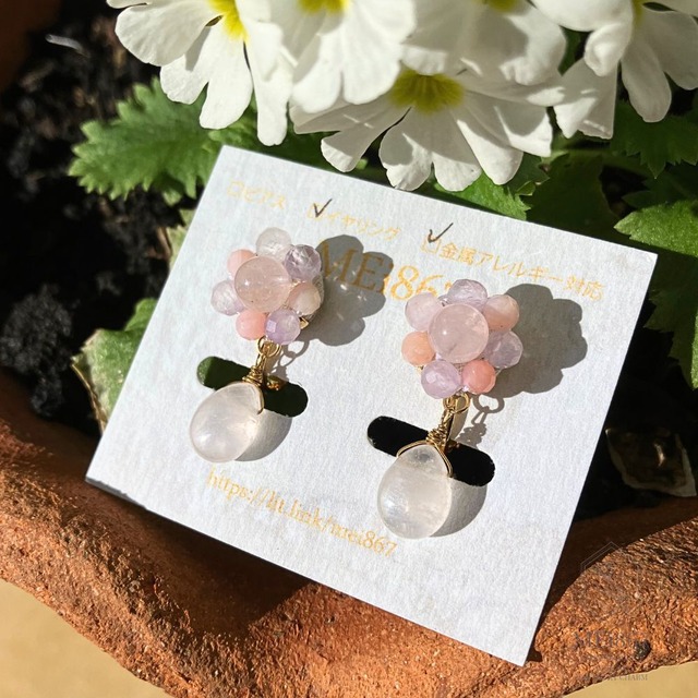 安らぎと癒しを感じ、ありのままの自分を包み込んでくれるような気持にしてくれる天然石で仕立てた春の小花の耳飾り。 卒入園・卒入学などのオケージョンにもフォーマル、オフィスファッションにも身に着けやすく、上品で柔らかな印象を与えてくれるデザインです。 ひとつひとつ丁寧に縫い付けた天然石のお花は、約1.2cmと小ぶりながら、立体感があり天然石の存在感を感じさせます。 動くたびに小さく揺れるローズクォーツの雫は、上品さの中に女性らしい可愛らしさを引き立ててくれます。 ピンク色は抵抗を感じやすい方にも、とりいれやすい白に近い淡いピンク色です。 サイズ 全長:約2.8cm ポスト部分約1.2cm 金具:金属アレルギー対応のサージカルステンレスを使用 ※サージカルステンレスは医療器具にも使用されるアレルギーがおこりにくいステンレスです。すべての方にアレルギーがおこらないわけではありませんので、ご心配な方はご遠慮ください。 こちらの作品は樹脂への変更ができかねます。 【天然石について】 ◎モルガナイト アクアマリンやエメラルドと同じベリルに属するピンク色の石。(ピンクアクアマリンともいう) 人を想う事、感情の尊さ、感情のみずみずしさをよみがえさせてくれる灯のような天然石。 感受性や想像力豊かゆえに生きにくさを感じる人にぴったりの天然石。 愛するがゆえに苦しい、子離れできない、過干渉になるなどが悩みの原因の場合、 見守る精神、相手を尊重する気持ちを大切にする気持ちのサポートになるので、関係性の距離感を上手にしたい人、手放す勇気が欲しい人にオススメ。 愛の復活・救い・無条件の愛・かわいらしさ・チャーミング 4月の誕生石、天秤座、魚座の守護石 ◎ローズクォーツ 愛の循環を促すとってもポピュラーな、ピンク色の水晶。私なんて・・・という方には自分を大切にすることに気づかせ、自己肯定感アップのエールを送ってくれるような天然石。生きていくうえで何よりも大切になってくるのは心の土台、そして自分のことを愛すること。自愛に関する欠けや痛みを補正し、自分への肯定感をサポートしてくれる自信につながる自己愛をくれる天然石。 自分の価値が見いだせない 身近な人に依存やジェラシーを感じる 自分を大切にすることを忘れないようにしたいというような人におすすめ。 平和・愛の告白・真実の愛・美 亥年の守護石、牡牛座、天秤座の守護石 ◎ピンクオパール オパールでも、輝きのない種類のコモンオパールに分類される石。優しい淡い桜貝の貝殻のようなピンクの天然石。 イライラに落ち着きをもたらし、内面の美しさと才能を引き出すといわれ、キューピッドストーンや、希望の石として女性に人気です。 10月の誕生石、申年の守護石、蟹座、天秤座、蠍座の守護石 潔白・希望・友情・真実 ◎ラベンダーアメジスト 薄い紫色の柔らかな雰囲気の天然石。ストレスの緩和や不安を抱える人に癒し、心の傷ついた人安らぎをくれるようなヒーリングストーン。 誠実・心の平和 2月の誕生石、水瓶座・魚座の守護石 \小花シリーズ/ 桜 https://mei867.base.shop/items/84813768 ミモザカラー https://mei867.base.shop/items/84815271 <ご注意・お取り扱い> 天然石はひとつひとつ色味が異なりますので、再販の分はお写真の色と多少の誤差が出てきますのでご了承ください。クラックや色味の濃淡がございますが、それも自然物の良さとして受け入れていただけましたら幸いです。 \MEi867の作品はギフトラッピングも可能です!╱ 有料ラッピングについて 母の日 誕生日 贈り物 春 オケージョン 入学式 入園式 七五三 記念日 結婚式 結婚記念日 お祝い 就職祝い 卒業祝い 花見 恋愛 お守り 桜 スミレ 桃色 癒し ヒーリング バレンタイン ホワイトデー