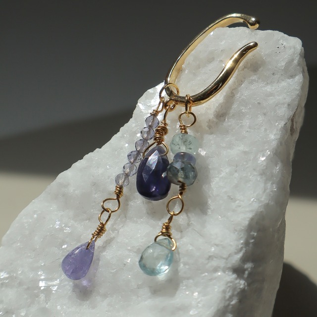 【数量限定】ひとつで4アレンジ片耳イヤーカフ ゴールド[雨と晴天]18kgp K14 天然石 癒し 3月 誕生石 モスアクアマリン アイオライト 小粒 シンプル 上品