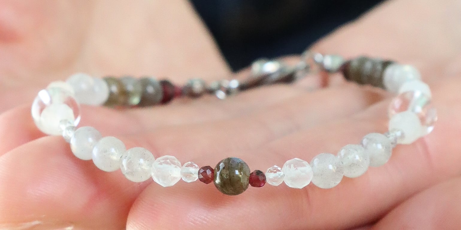 Rebirth ー再生の新月ブレスレットー 静かに立ち上がる~変容のための基盤~ グレーとホワイトカラーに、ガーネットの赤を差し色にした、シックで落ち着いた雰囲気のブレスレット。 月のエネルギーに富んだラブラドライトと、6月誕生石のムーンストーンをベースにし、包み込むような柔らかさと、安心感で、あなたの内面から、澄み切った水晶のようにクリアに。 〈Rebirthのストーリー〉 変わりたい。 前に進みたい。 そう思いながらも、 何度ももがいてきたあなたへ。 このブレスレットは、 あなたの変容のはじまりを応援します。 身につけていると、 足元を整え、安心感と確かな“芯”を感じられる。 そっと輝く紅いガーネットは、 自分の中にある小さな火を思い出させてくれる存在。 霧の中にいるような時間も、焦らなくていい。 「わたし」を整える、基盤をつくる。 静かな芯を感じながら、 次の一歩を自分の力で踏み出せるように。 <こんな方におすすめ> ・焦らずじっくりと、安心感と内面を育て変わりたい方 ・心身の土台を整え、積み上げていきたいことがある方 ・自分のもっている強さ・芯を育てたい方 <天然石について> ・ヒマラヤ水晶(6mm丸玉) → 澄んだ基盤をつくる、軸を整える、全体を統合 ・ラブラドライト(2mmカット、4mm丸玉ホワイトグレー、5mmグレー) → 変容と気づき、内側の目覚め ・ガーネット(2mmカット・3mmボタンカット) → 内なる火、静かな意志 ・ホワイトムーンストーン(4mmカット) →内面を癒し、育み、安定 白とグレーの穏やかな調和の中に、 ほんの少しの赤。 それは「私の中にある情熱」の証。 <サイズ> 手首15cm程度目安 ※着用画像は手首サイズ約14.5cm ・サイズはオプションにて選べます。 ・サイズにより価格の変動があります。 金環日食×新月に生まれた3本のブレスレットは それぞれ違う役割を持ちながら ひとつの流れを描いています。 あなたの変容と日々紡がれる物語を見守り、 ともに歩むセットとして、特別価格の3部作セットをご用意しました。 3部作品セットをご購入の方には、❝あなたの半年のテーマ❞の リーディングメッセージも同封いたします。 【静かな変容の新月ブレスレットー3部作品セットー】 https://mei867.base.shop/items/136197672 ◆金具部分 サージカルステンレス 汗や皮脂汚れに強く、水にぬれても大丈夫です。 ※金属アレルギーの方でもアレルギー反応がでにくく、医療機具にも使われるステンレス。 全ての方にアレルギー反応が出ないわけではございません。 【お取り扱いについて】 長く綺麗を保っていただくために、ご使用後や水がついた場合、汚れた場合は乾いた清潔な布などで拭いてください。 陽の光により褪色や、金属の劣化を招きます。保管にご注意ください。 繊細なものですので、落下や引っ掛かりによる破損にご注意ください。 月光浴や水晶にのせるなどして、石を休ませる時間を作ってください。 ※オプションにて浄化水晶を販売しています。ご希望の場合はご購入時にお選びください。 【お直しについて】 長くご愛用いただけるようにご対応いたします。何かあります場合はご相談ください。こちらの作品不具合を除きまして、送料ご負担やパーツ代がかかる場合もございますが気になる事はお声がけください。 新月 誕生日 母の日 星座石 誕生石 クリスマス ホワイトデー 結婚記念日 結婚祝い 結婚 お守り 守護石 プレゼント ギフト ラッピング 卒業式 入学式 春 夏 爽やか シルバー 銀 30代 40代 50代 60代