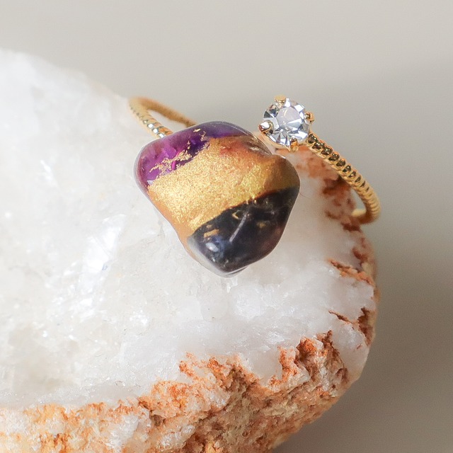 2月の誕生石アメジストと3月誕生石アイオライトを、 本漆を使ってついだ上品な金継ぎリングです。 見る角度によって色が変わる、深みのある2色の天然石に 添えられたラインストーンと、繊細なカットが入った真鍮のリングアームが、 キラキラと輝いてエレガントな指先を演出します。 使用;サイズ調整可能な螺旋状のオープンリング 指輪サイズ;約12号〜最大13号 リングの素材は、デザインの施された真鍮に、電気メッキがされています。 金属アレルギーのご心配な方はご遠慮ください。 天然石の大きさ;横1.2×縦1.0cm 【天然石について】 ●アイオライト 見る角度によって色が変わる多色性という性質を持つアイオライト。 濃淡ある天然石のですが、今回は光です墨入れ色に見えやすい色を選びました。 海賊が航海中に方角を確認するために使ったという言い伝えがあり、進むべき道を示すビジョンの石と呼ばれます。 石言葉 * 道を示す * 人生の道標 * 貞操 * 誠実 * 自己同一性 3月誕生石 ●アメジスト 魚座の守護石 2月の誕生石で癒しや安らぎ、愛に関係する石です。 石言葉;誠実・心の平和 守護石;2月の誕生石 射手座・水瓶座・魚座 ◆本漆の金継ぎについて 〝金継ぎ〟自体は元々壊れてしまった大切にしていた器を、見た目も美しく修復するために、漆の液などの天然素材を使った技法で、日本で生まれた伝統技術です。 現在は金継ぎを身近にできるように、 モダン金継ぎ、簡易金継ぎと呼ばれる方法がありますが、こちらの作品は手間や時間をかけて作る金継ぎ本来の本漆で天然石を継いでいます。 まぶした金色は、鉱物粉のマイカ(雲母の粉)で色付けしており、自然物の風合いが心地よく、落ち着きや癒しを感じていただける仕上がりになっています。 ◆メンテナンスについて この作品は、日本ならではの、 植物の漆を使った本漆で金継ぎすることで、 欠けや金粉の剥げにも修復が可能です。 万が一の際は、修復代や送料は御負担いただくことになりますが、修復しますので、ご相談ください。 =作品への想い= 【わたしをいたわる、 唯一無二の小さなお守りリング】 MEi867(メイハチロクナナ)で作る 天然石の金継ぎリングは、 異なる天然石を金継ぎした 唯一無二のデザインの指輪です。 カタチも、金継ぎの模様も ひとつとして同じものはないのです。 使用している天然石は、 自然の風合いのあるものや、 絵画の様な模様のあるもの、 どれも個性があります。 その、個性的な天然石を 美しく繋ぎ合わせたり 欠けたものを修繕し、 キズがあっても隙間を埋めて 新たな命を吹き込むその工程は、 わたしたちと重なる部分を感じます。 欠けと思える部分があるからこそ 他にはない美しさを持ち 何かと繋がりあうこともできる。 欠けや傷に感じる事があっても 新たな自分らしい姿で生きて欲しい。 あなたの存在を丸ごとうけとめ、 あなたを優しくいたわり、 金継ぎがくれる落ち着きと 天然石で安らいでほしい。 そんなメッセージをこめて お守りになるようにと作っています。 ◆ギフトラッピングについて◆ 一点ものの特別なリングのため、大切な方への贈り物にもおすすめです。 誕生日、母の日、節目のお祝いなど、 贈り物の場合、有料のギフトラッピングをご用意しています。 アクセサリーの保管箱としても使用できる紙製のギフトボックスをご用意しています。 ご希望の場合はオプションにてお選びください。 紙の緩衝材をいれ、ご希望のイメージカラーのリボンをかけさせていただきます。 そのままお渡ししやすいよう、外装は、透明のOPP袋でお包みさせていただきます。 ギフトにショップカード、天然石の説明&お取り扱いの紙を同封させていただきますが、金額のわかるものは入れませんのでご安心くださいませ。 【お取り扱いについて】 長く綺麗を保っていただくために、ご使用後や水がついた場合、汚れた場合は乾いた清潔な布などで拭いてください。 陽の光により褪色や、金属の劣化を招きます。 保管にご注意ください。 繊細なものですので、落下や引っ掛かりによる破損にご注意ください。 月光浴や水晶にのせるなどして、石を休ませる時間を作ってください。 ※オプションで浄化セットをご購入できます。 *****キーワード***** 母の日 誕生日 誕生石 守護石 和モダン 上品 エレガント 日本 伝統工芸 伝統技術 ギフト 贈り物 お祝い 自分らしさ 自己表現 天然石 和風 ジュエリー 天然石アクセサリー お守り