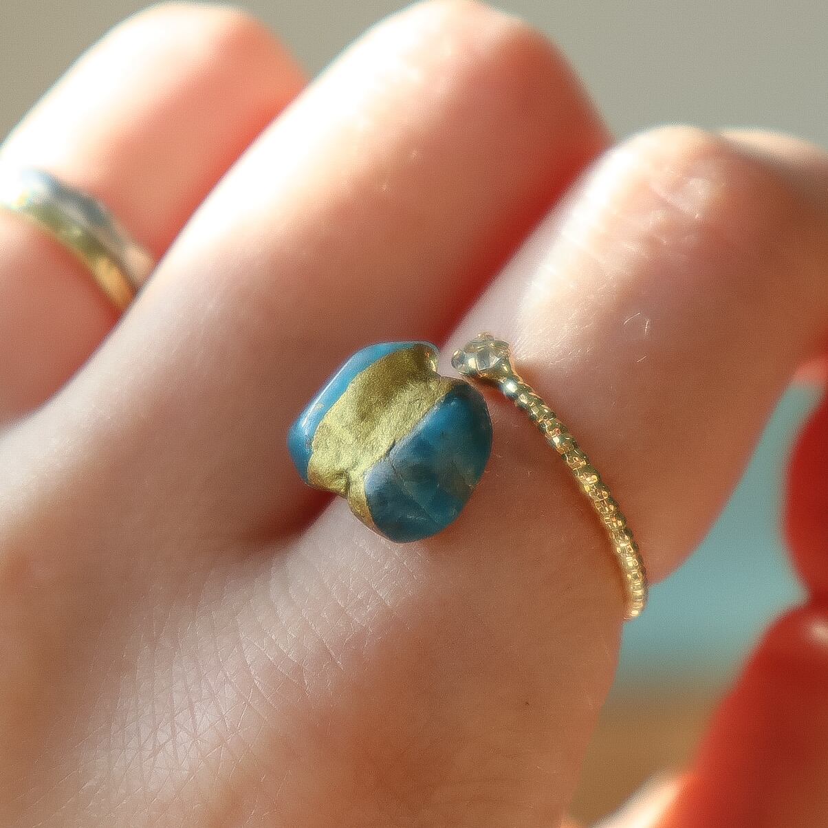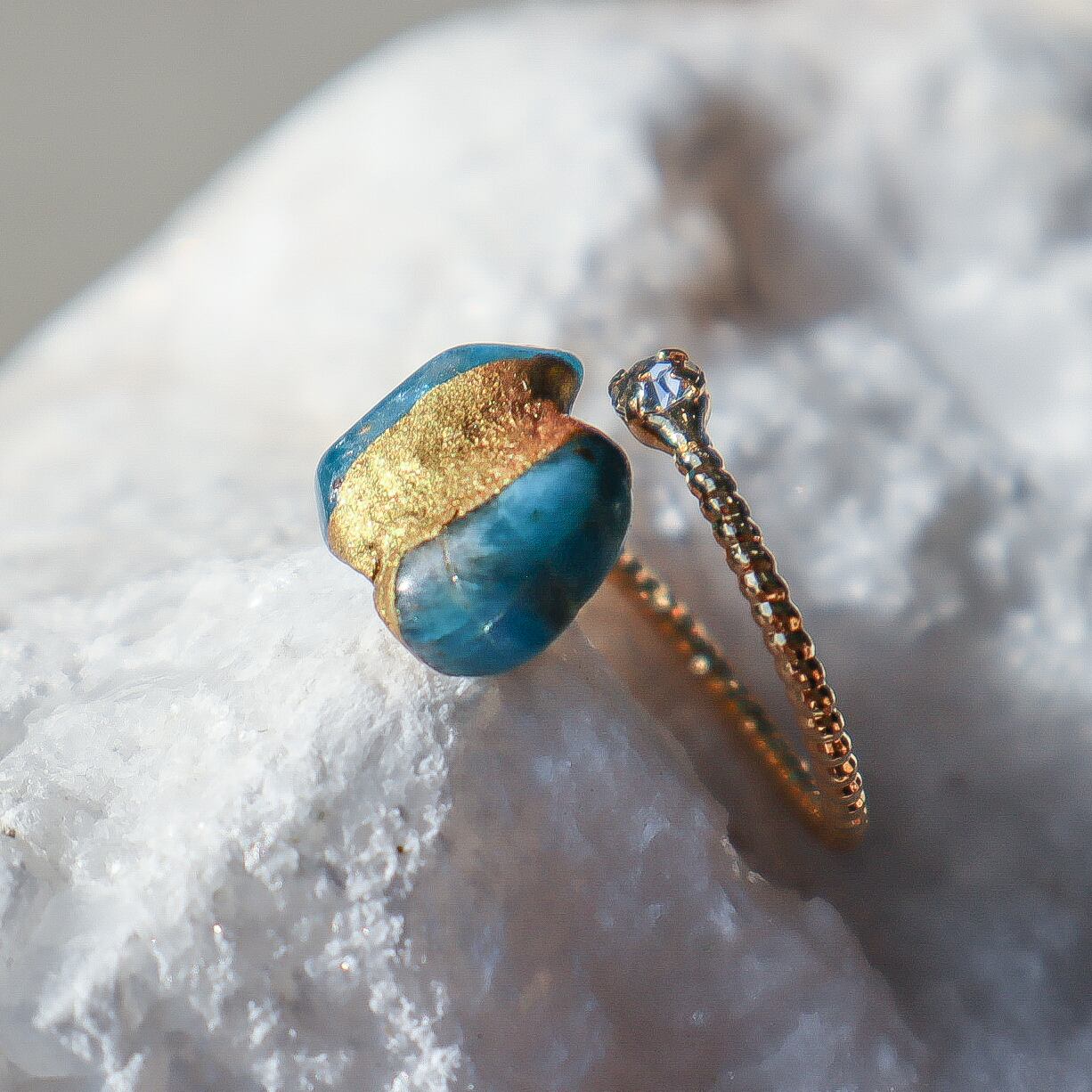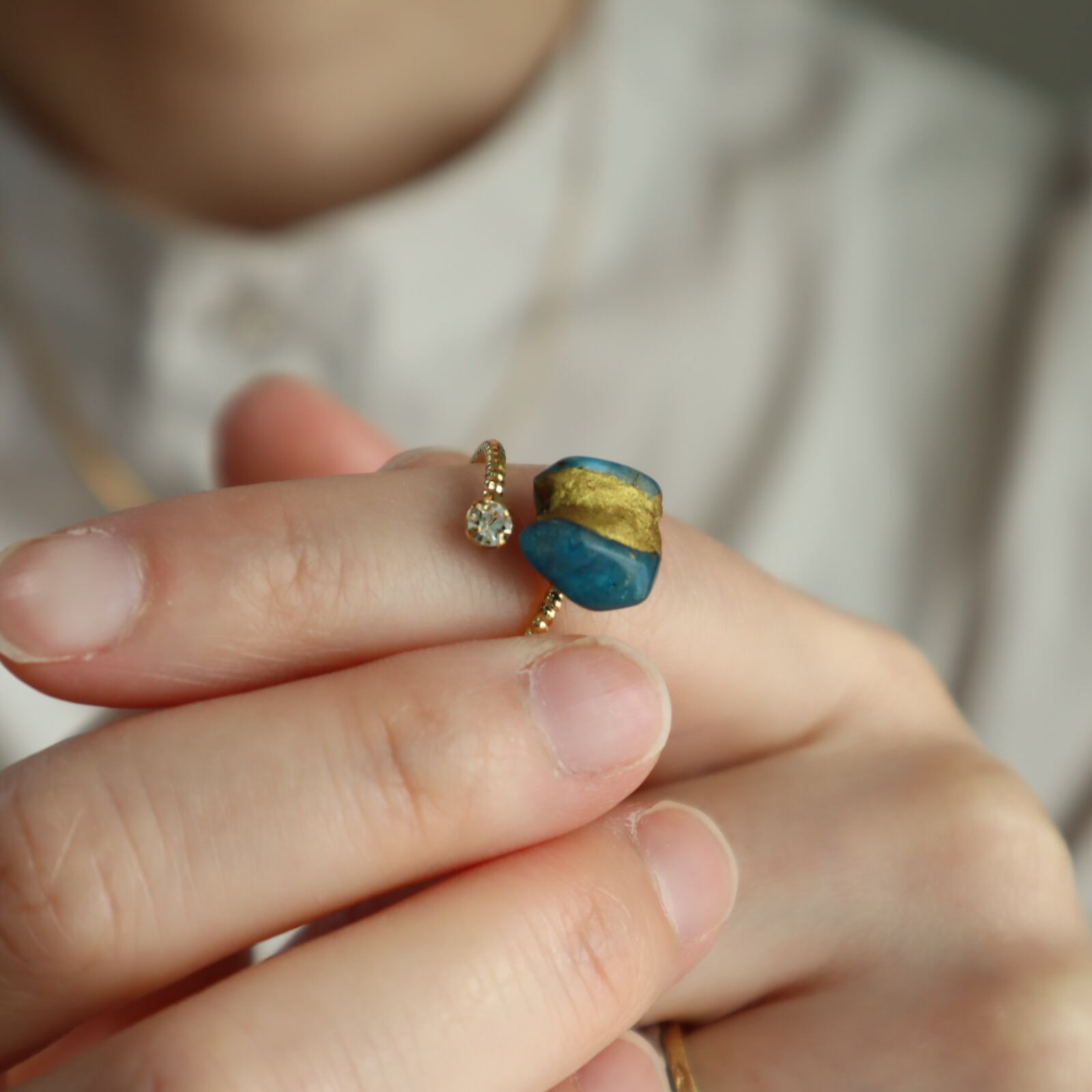 【一点もの】解放とらしさの表現 ブルーアパタイトの金継ぎ螺旋オープンリング 天然石 指輪 ブルーグリーン 誕生日 ギフト 守護石