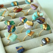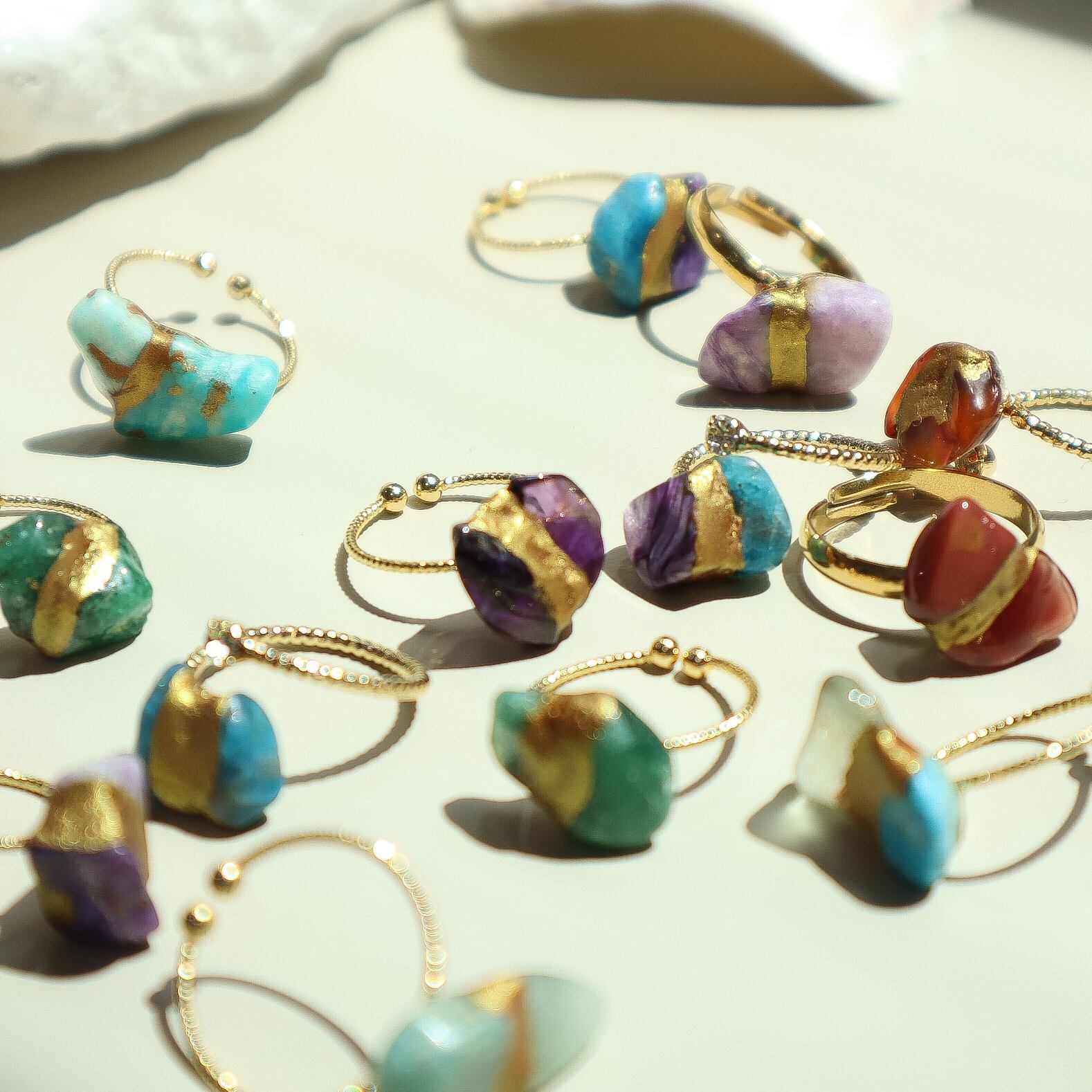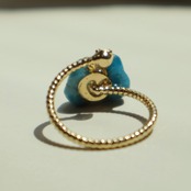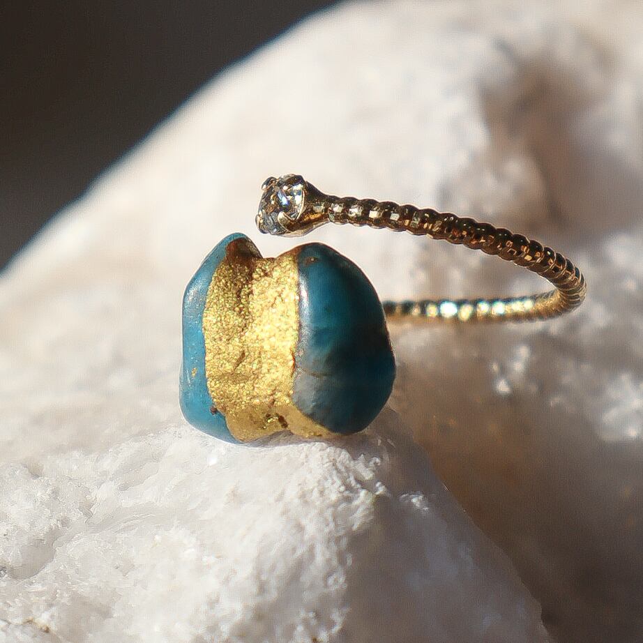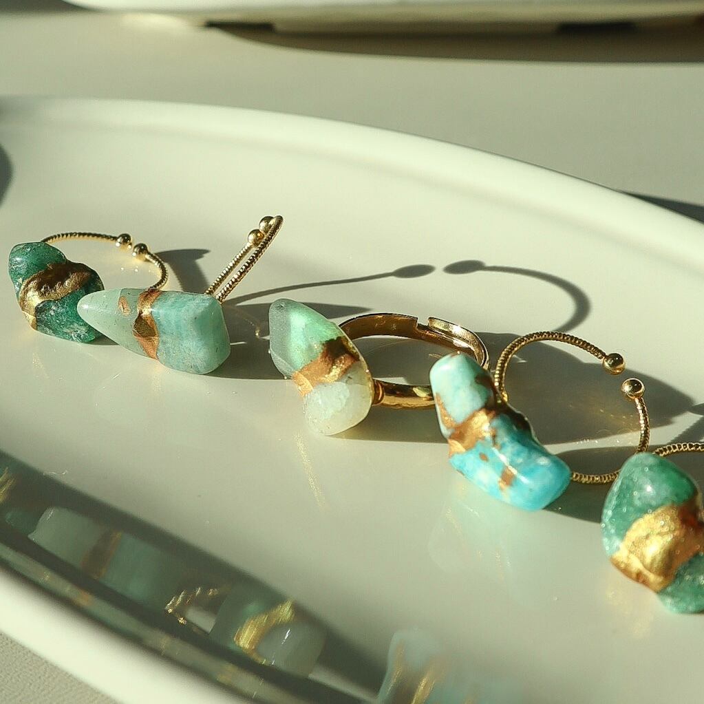 目を惹く、ブルーグリーンの金継ぎアパタイトに添えられたラインストーンと、繊細なカットが入った真鍮のリングアームが、キラキラと輝いてエレガントな指先を演出します。