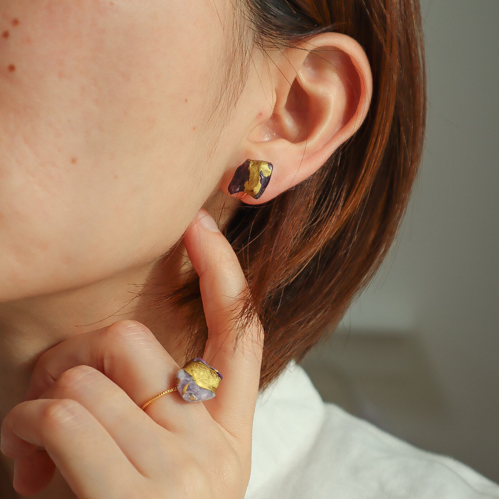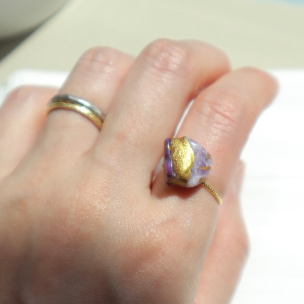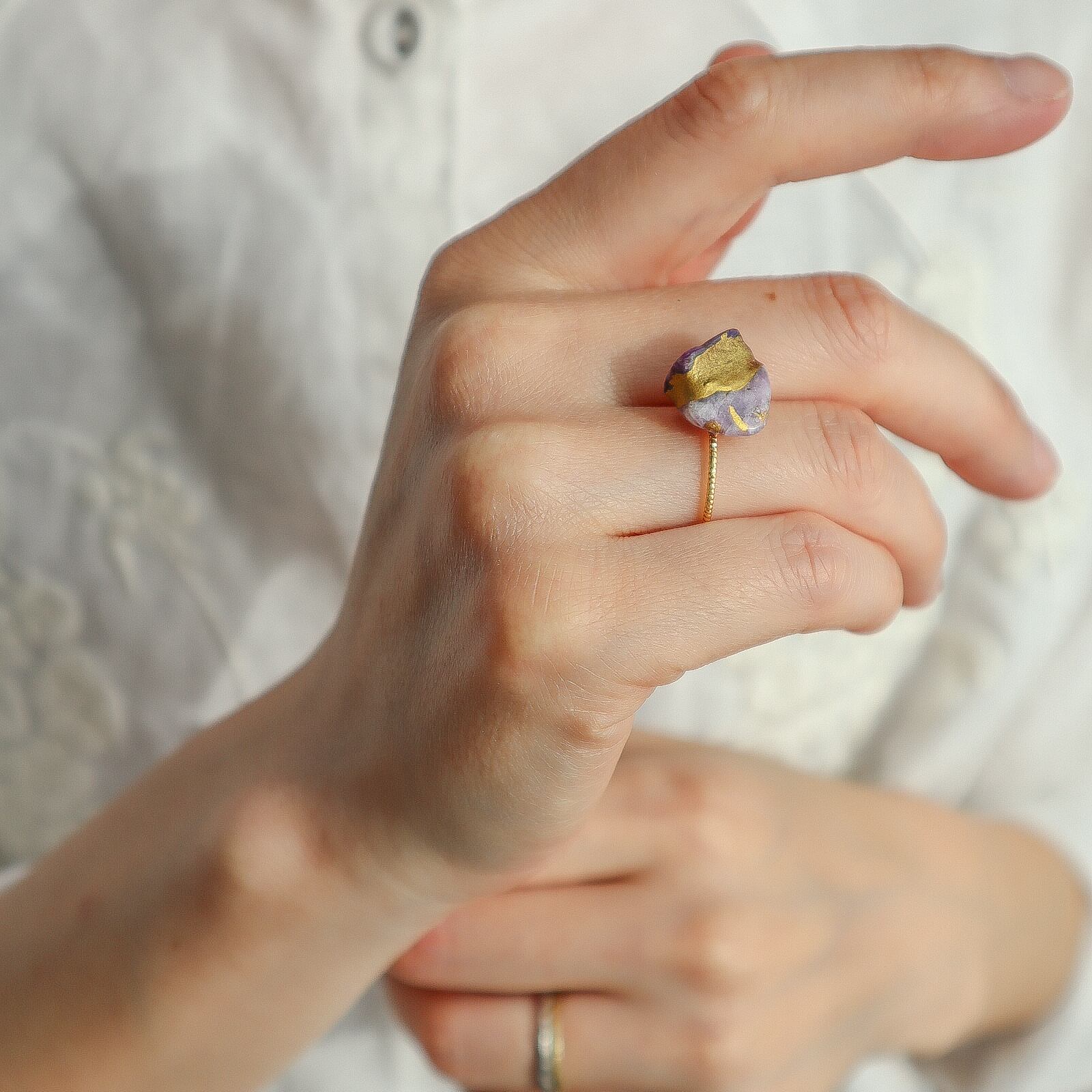 濃淡の異なる二つのチャロアイトのカケラを、伝統的な本漆を使った金継ぎした指輪です。