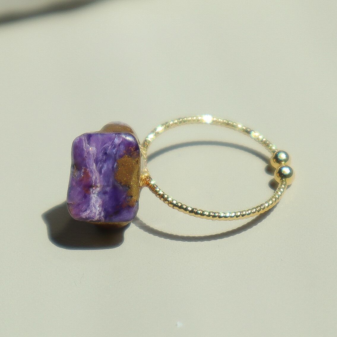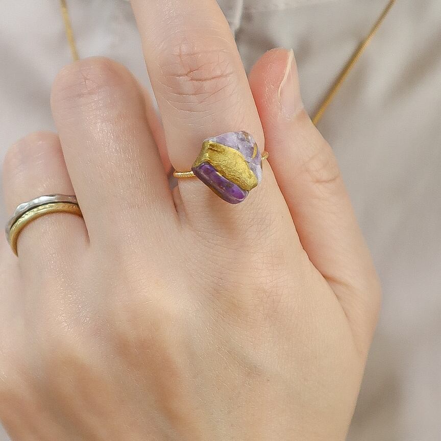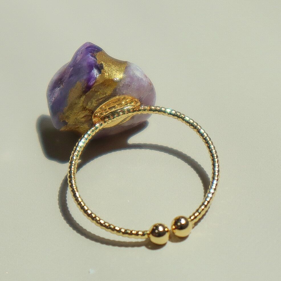 【一点もの】変容の一歩 すみれ色チャロアイトの金継ぎ真鍮フリーリング 天然石 指輪 紫 パープル 誕生日 ギフト 守護石 ヒーリング