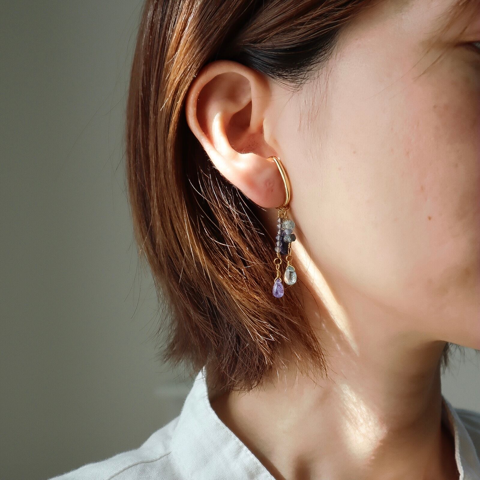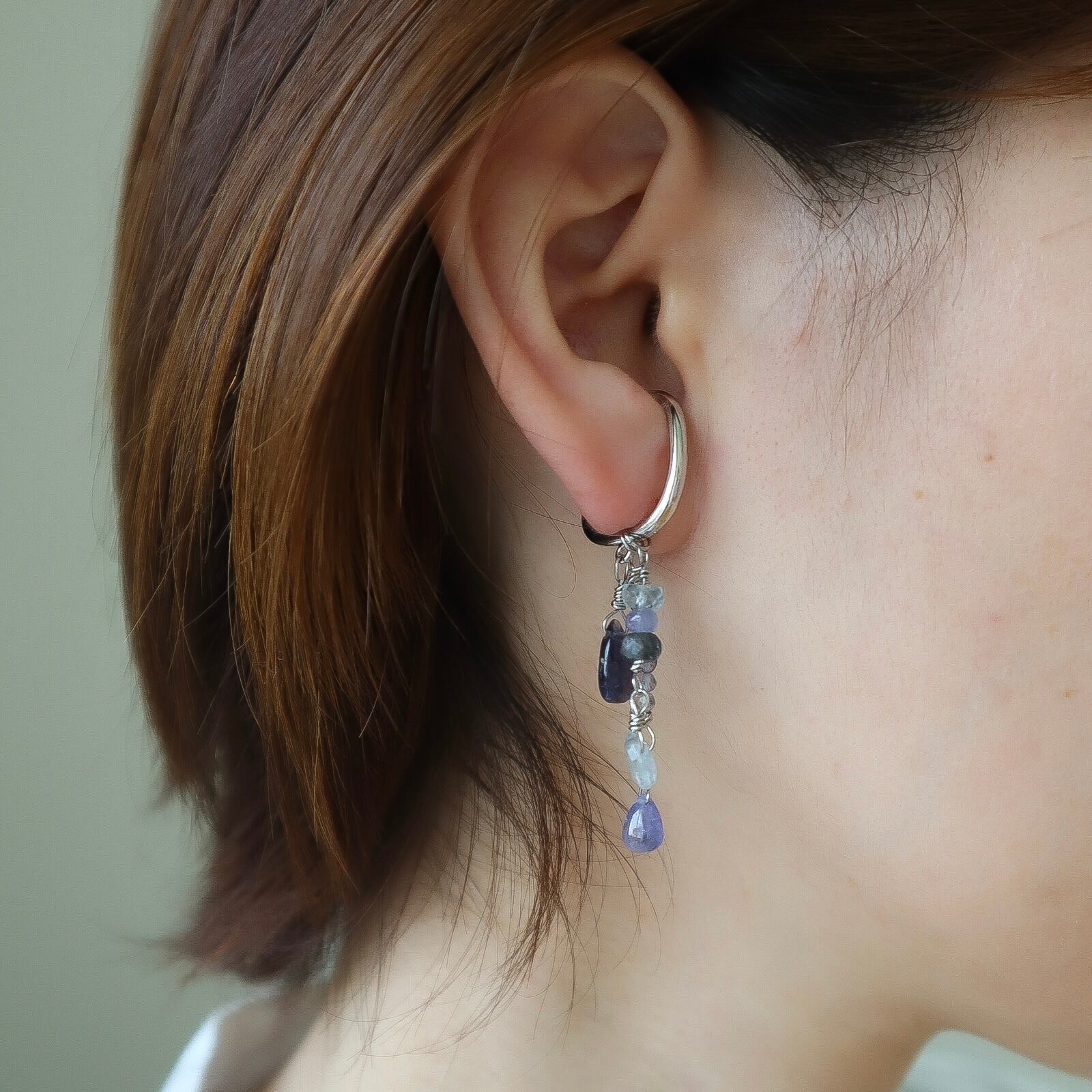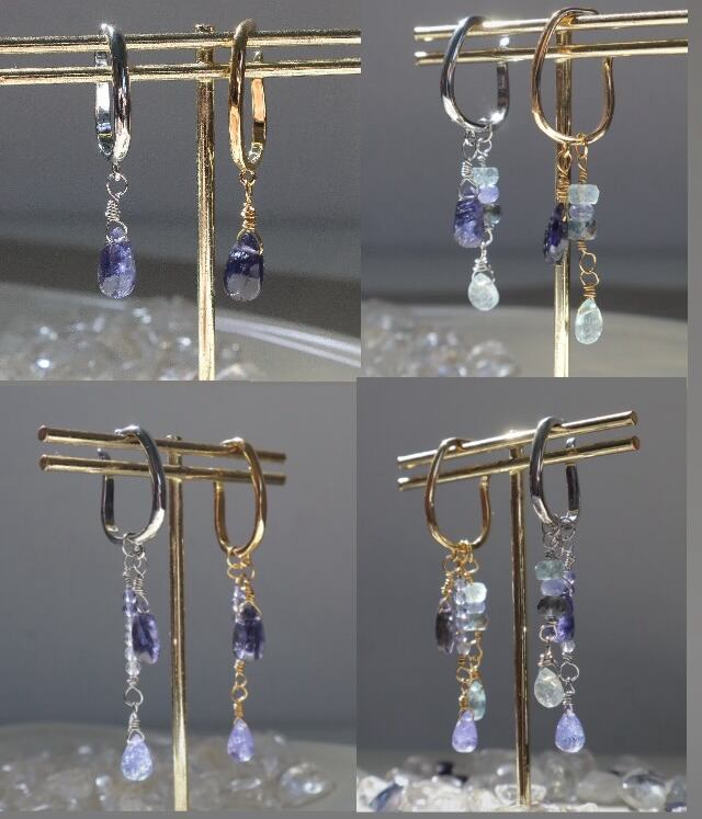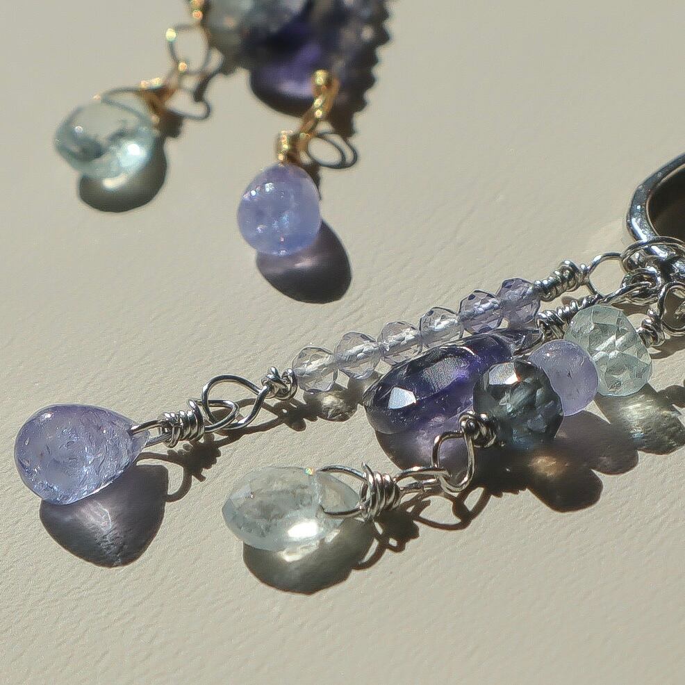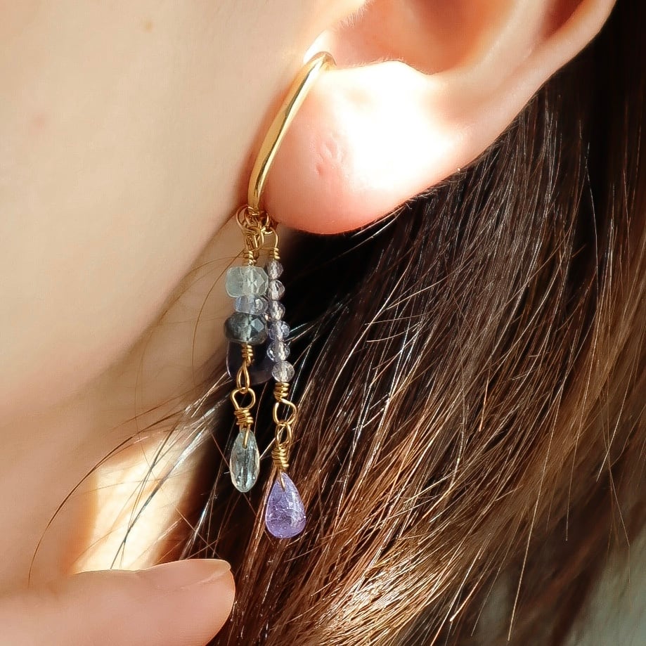 3月の誕生石レアなモスアクアマリンとアイオライト、タンザニアでしか採れない、希少で高品質の12月の誕生石タンザナイトを使用している、青い石のグラデーションを活かしたとっておきのイヤーカフ。