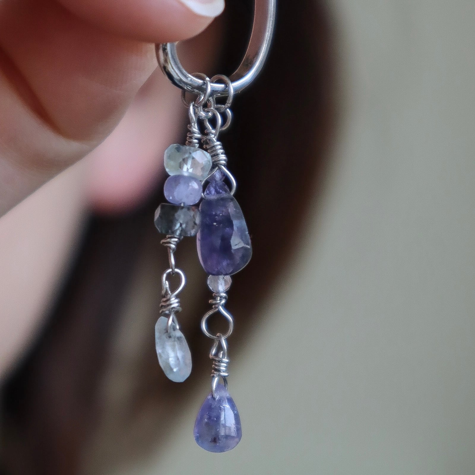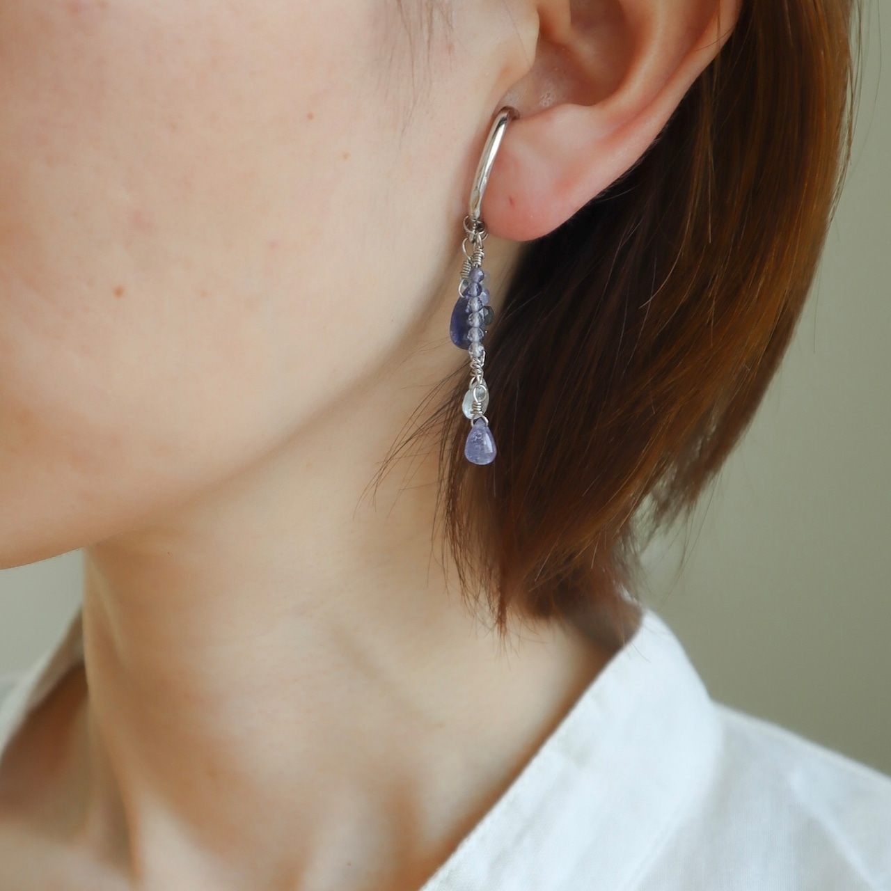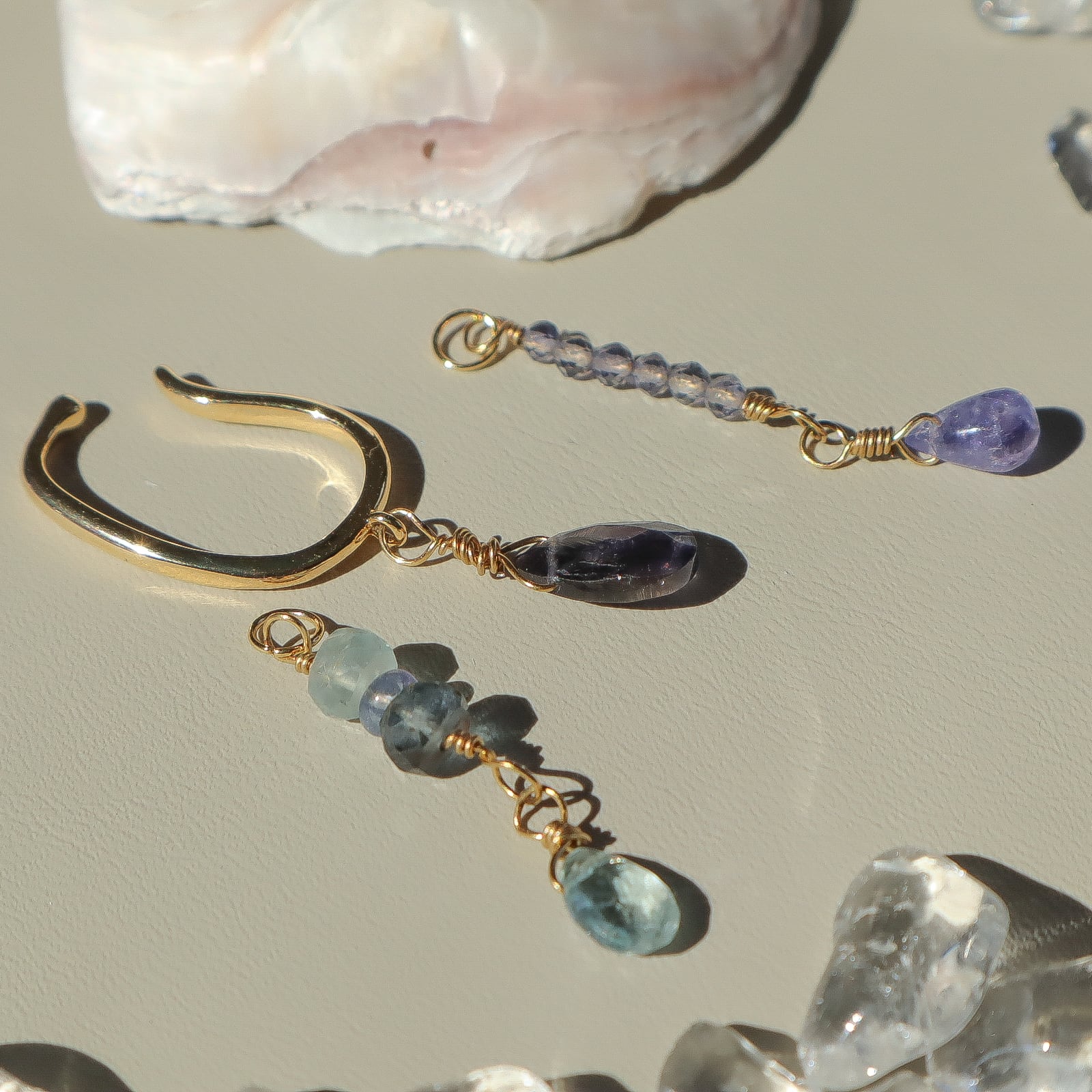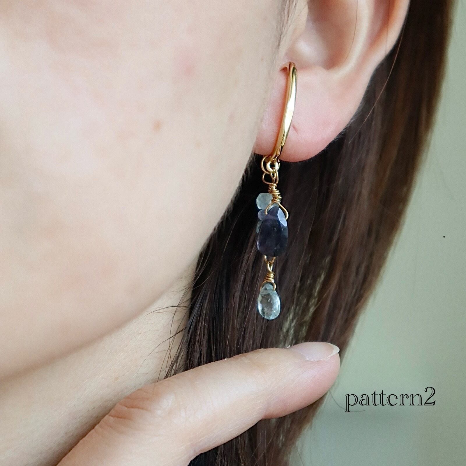 3月の誕生石レアなモスアクアマリンとアイオライト、タンザニアでしか採れない、希少で高品質の12月の誕生石タンザナイトを使用している、青い石のグラデーションを活かしたとっておきのイヤーカフ。