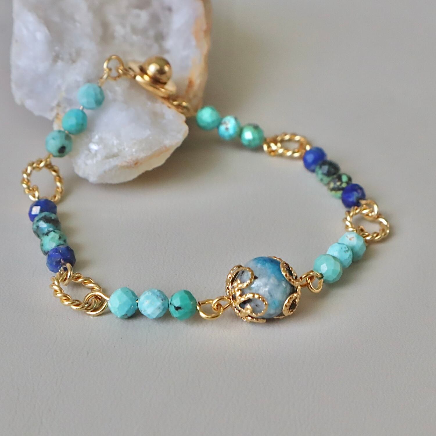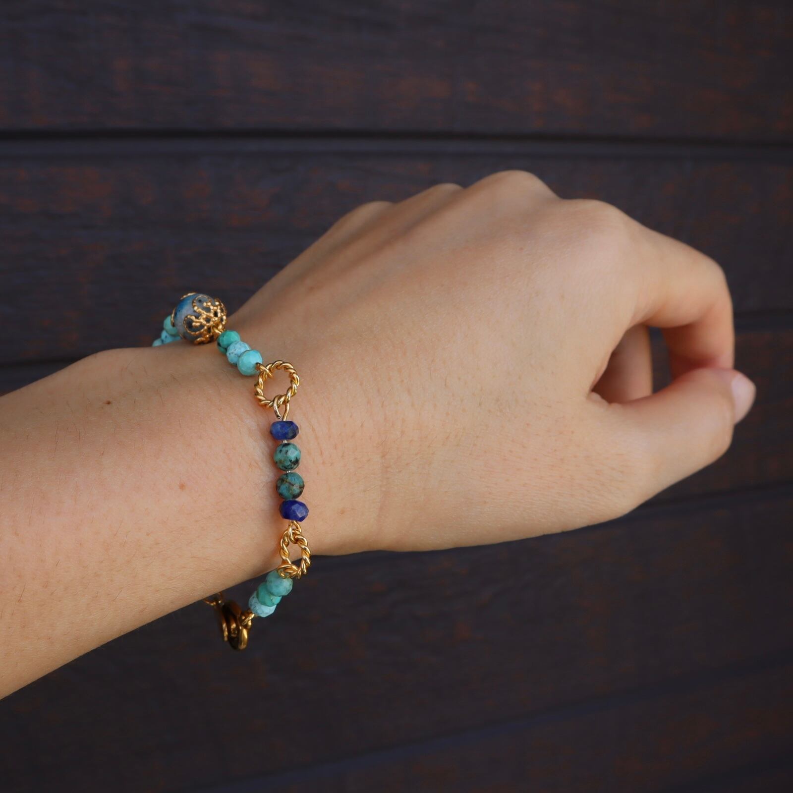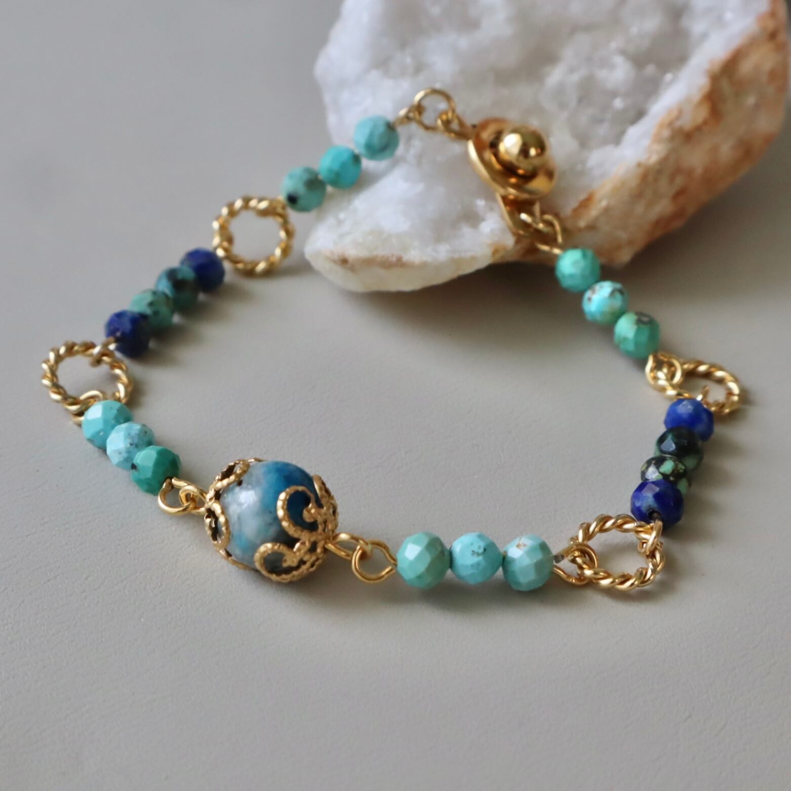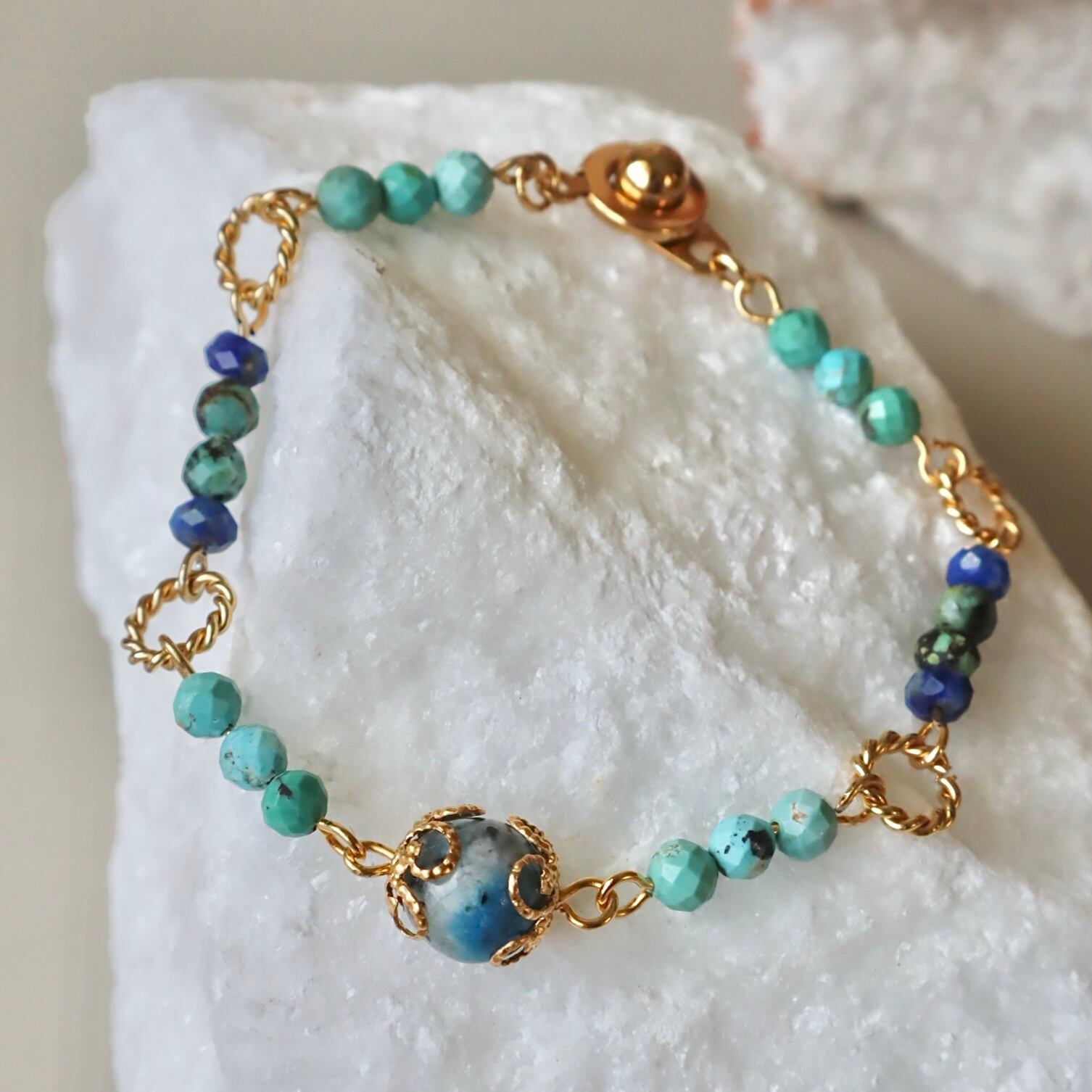 スカイブルーのターコイズお守りブレスレット ラピスラズリ K2ブルー ゴールド 鉱物 ブルー 青 12月 誕生石 守護石 射手座