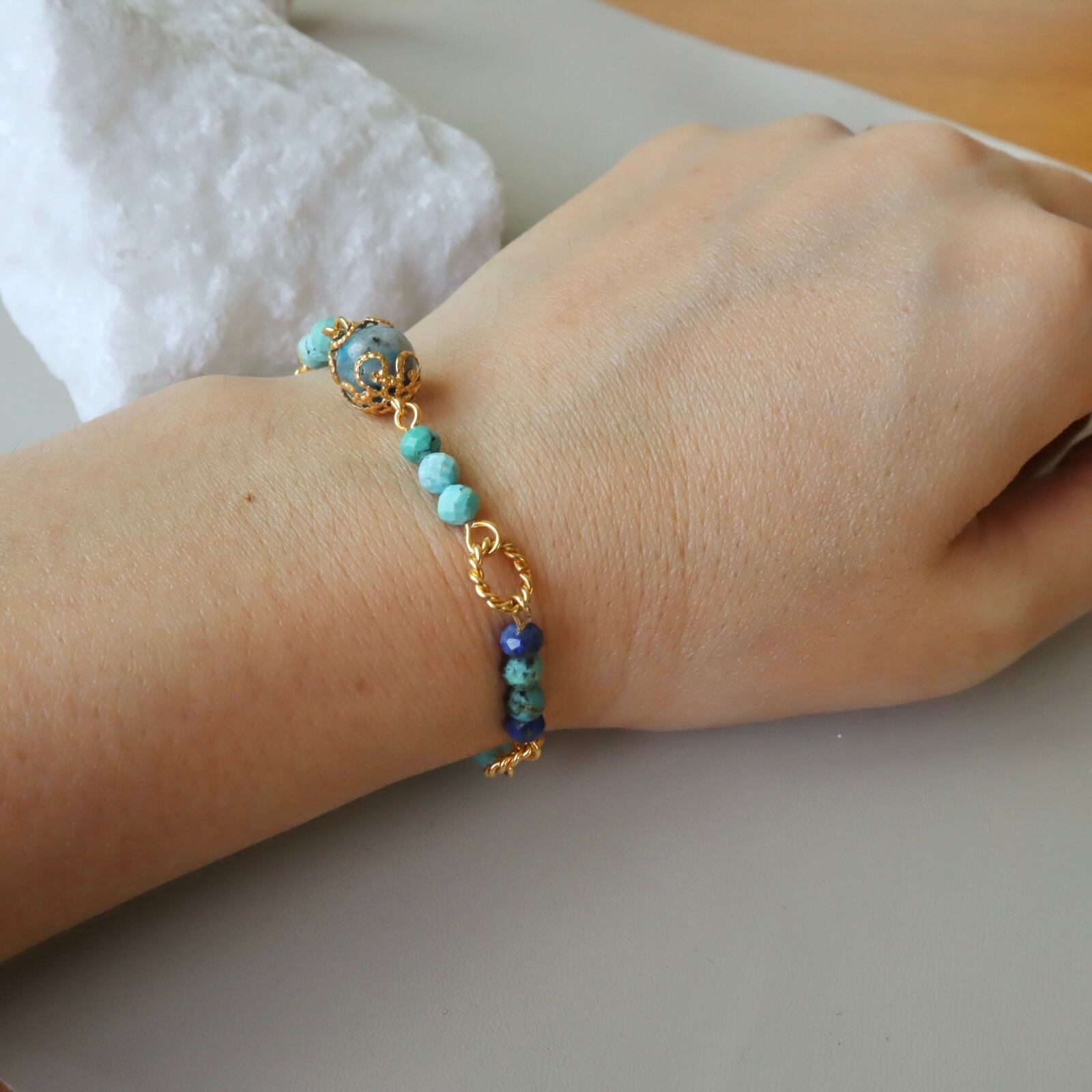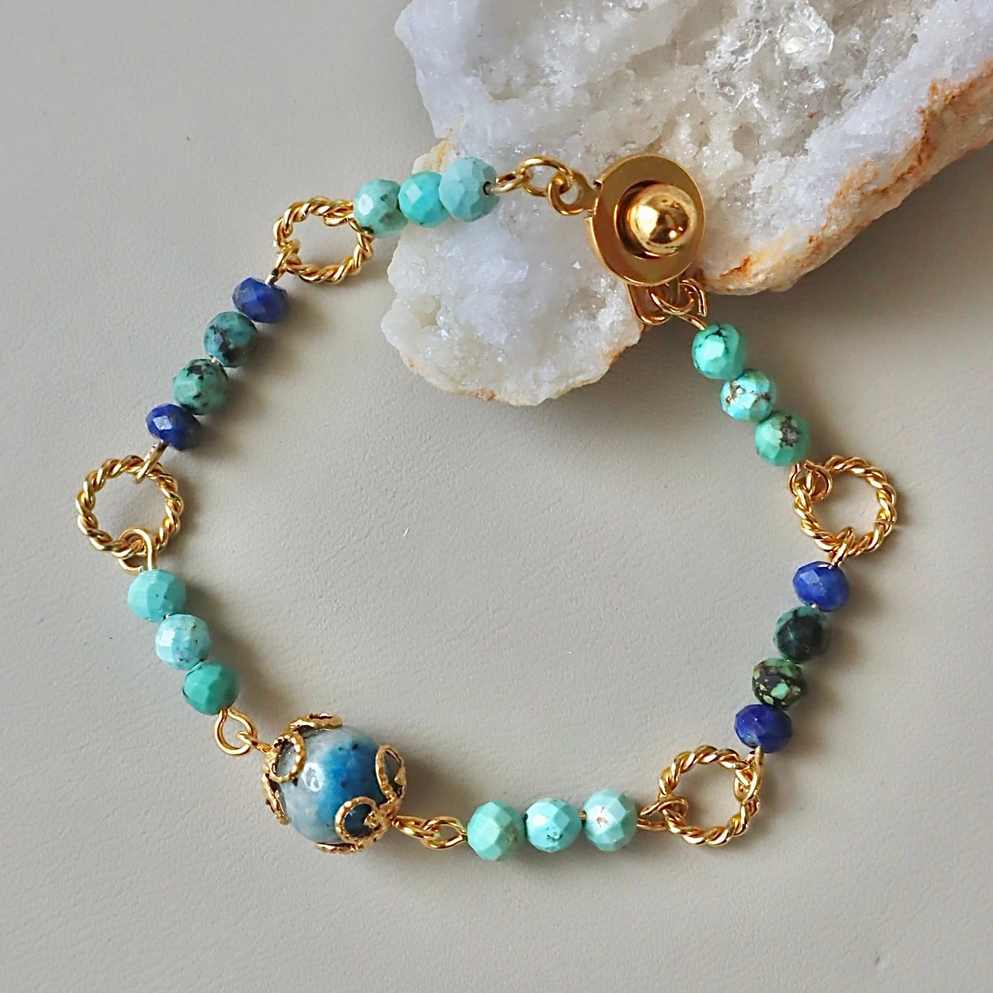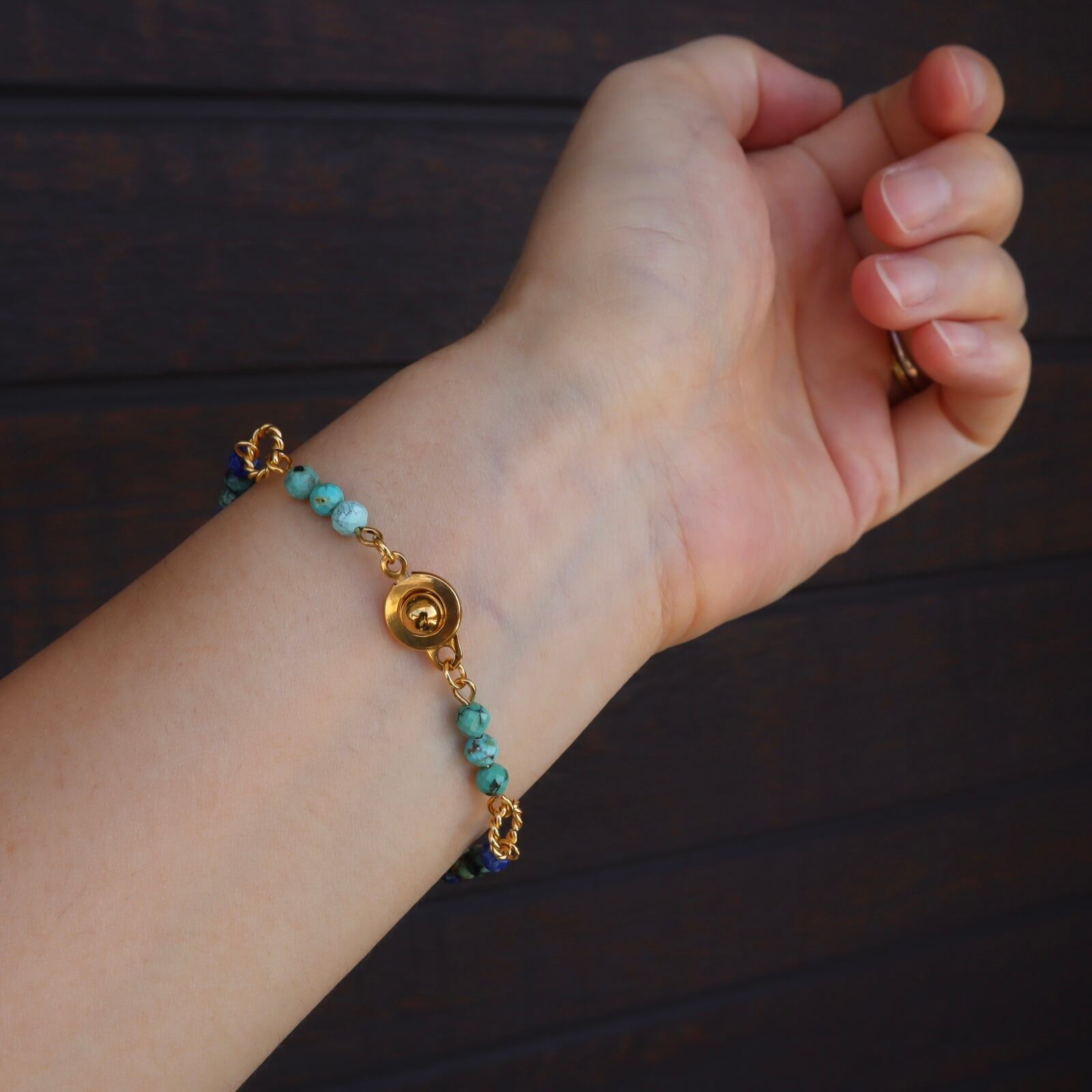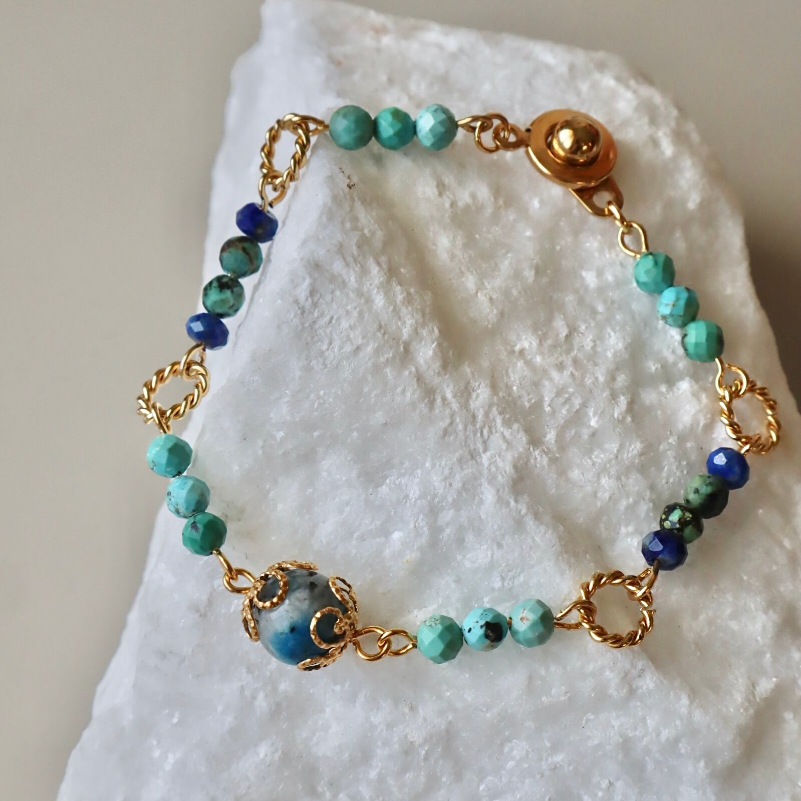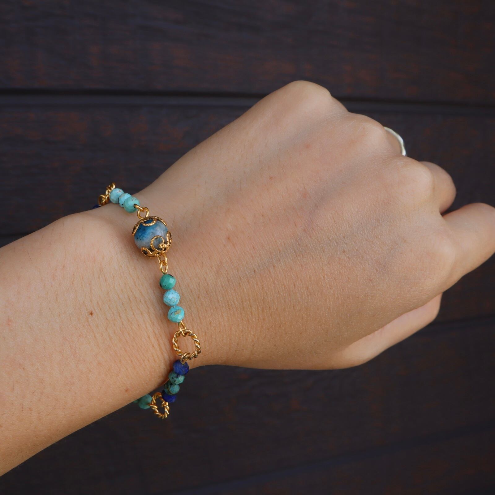 スカイブルーのターコイズお守りブレスレット ラピスラズリ K2ブルー ゴールド 鉱物 ブルー 青 12月 誕生石 守護石 射手座
