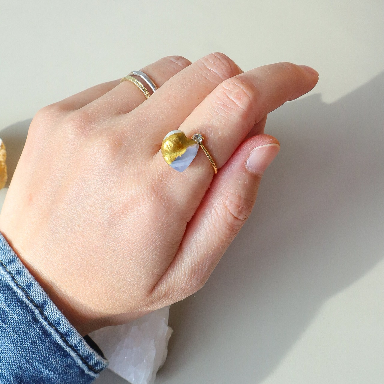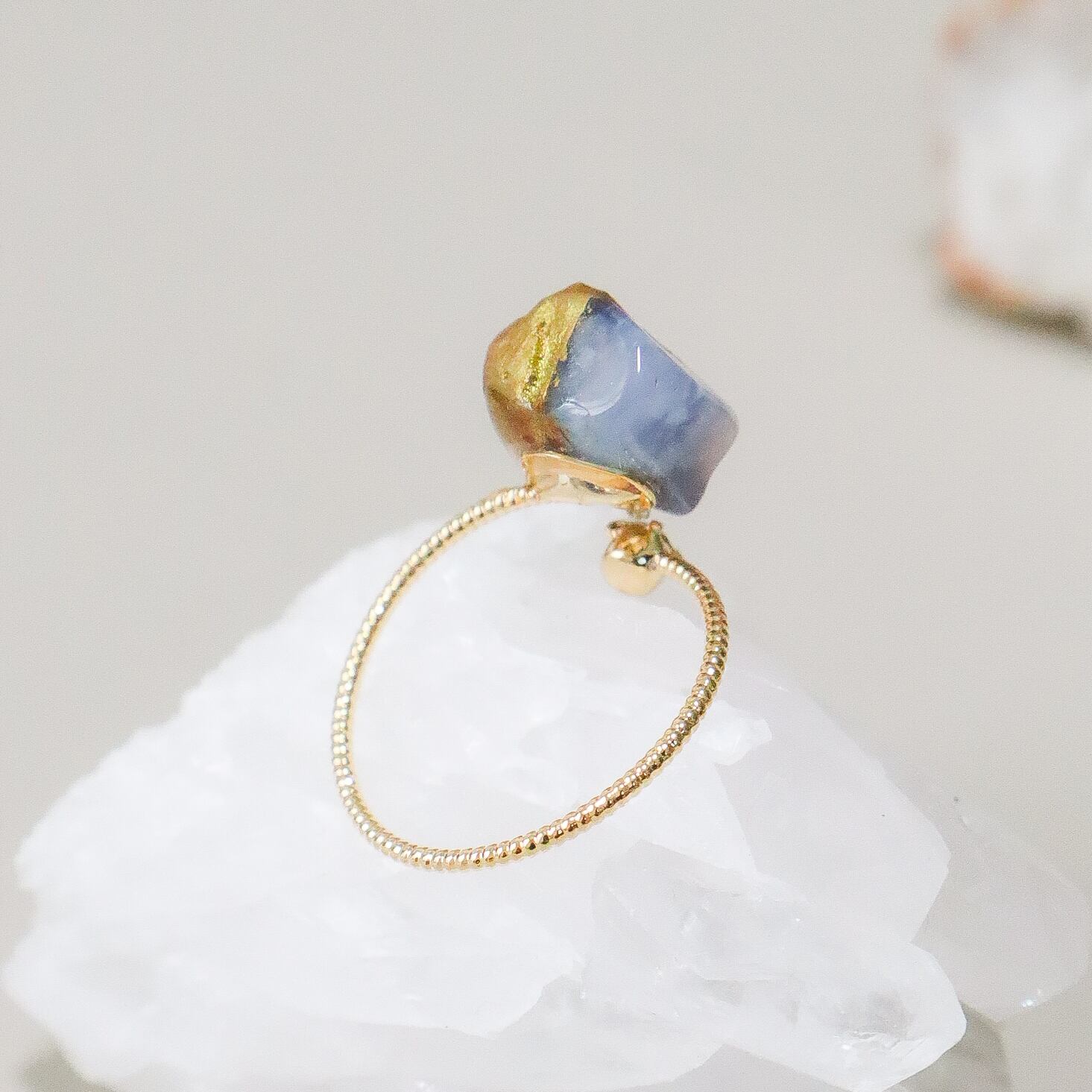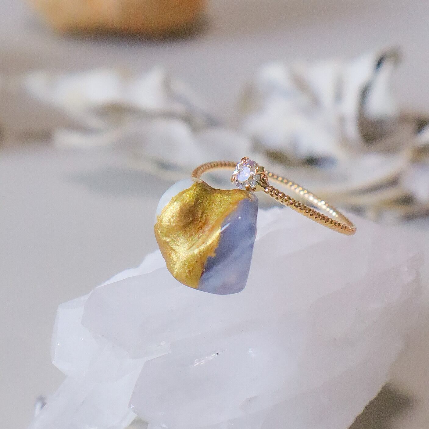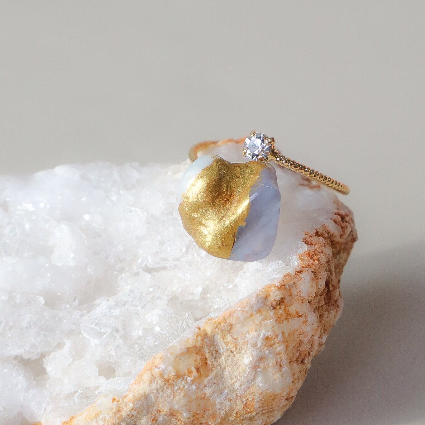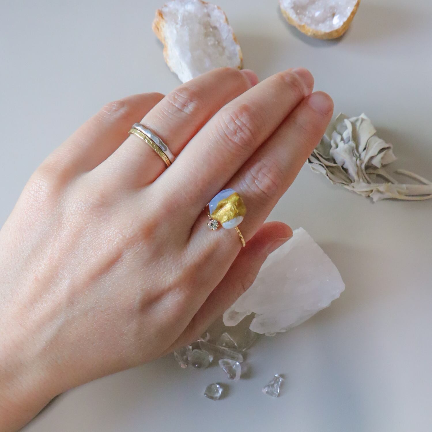 【一点もの】包み込む優しさと癒し パール×ブルーレースアゲート金継ぎ螺旋オープンリング 天然石 指輪 水色 誕生日 ギフト 守護石