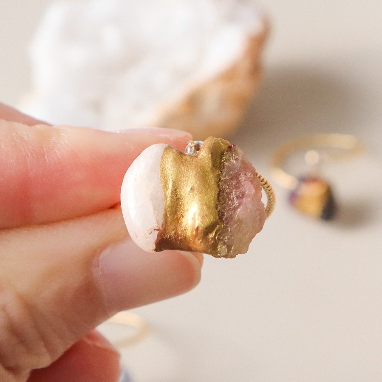 二つの❝愛の石❞を金継ぎした、優しいピンクのカラーの天然石を継いだ一点。