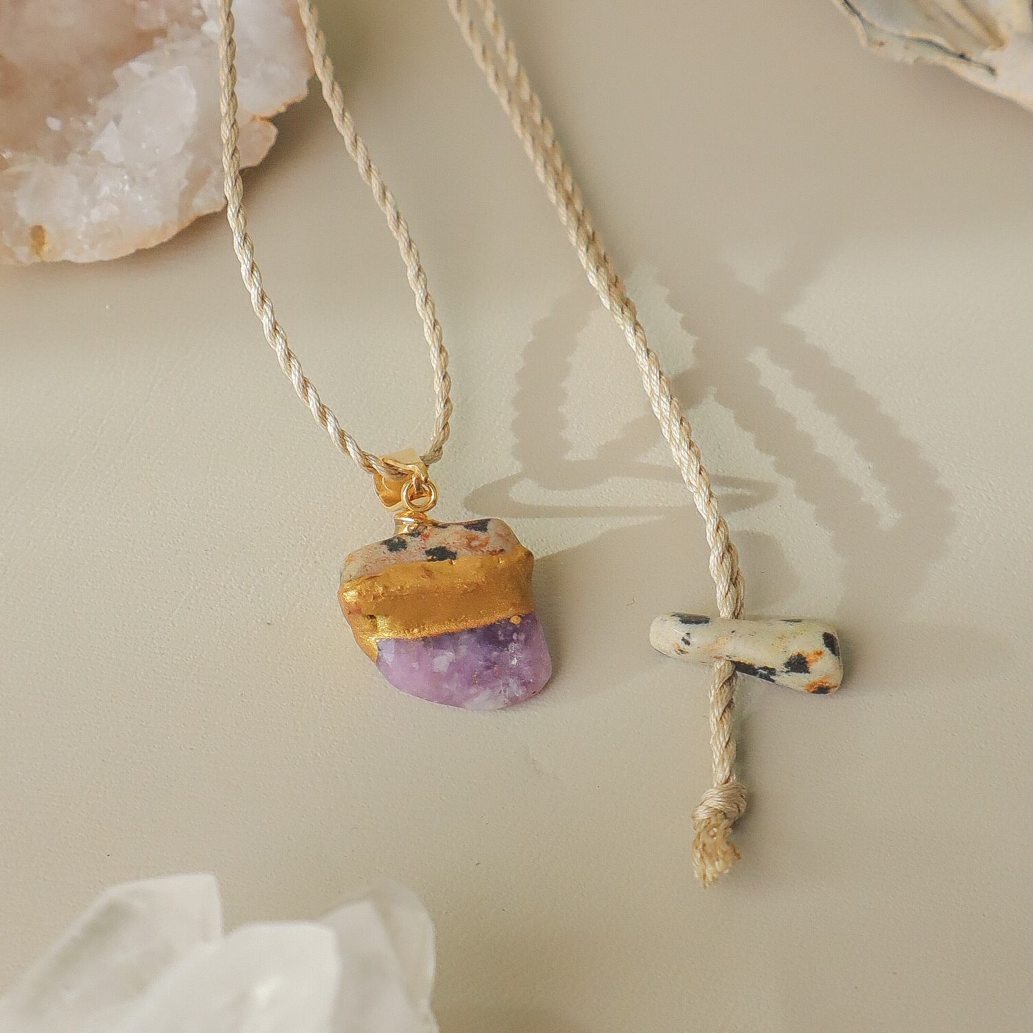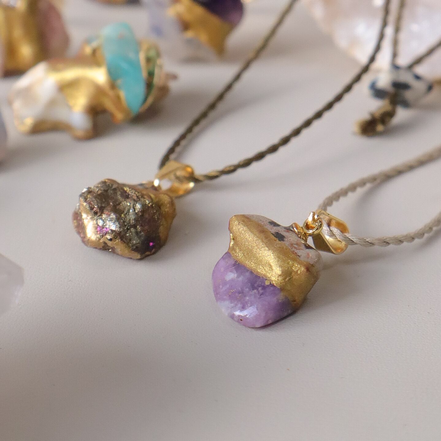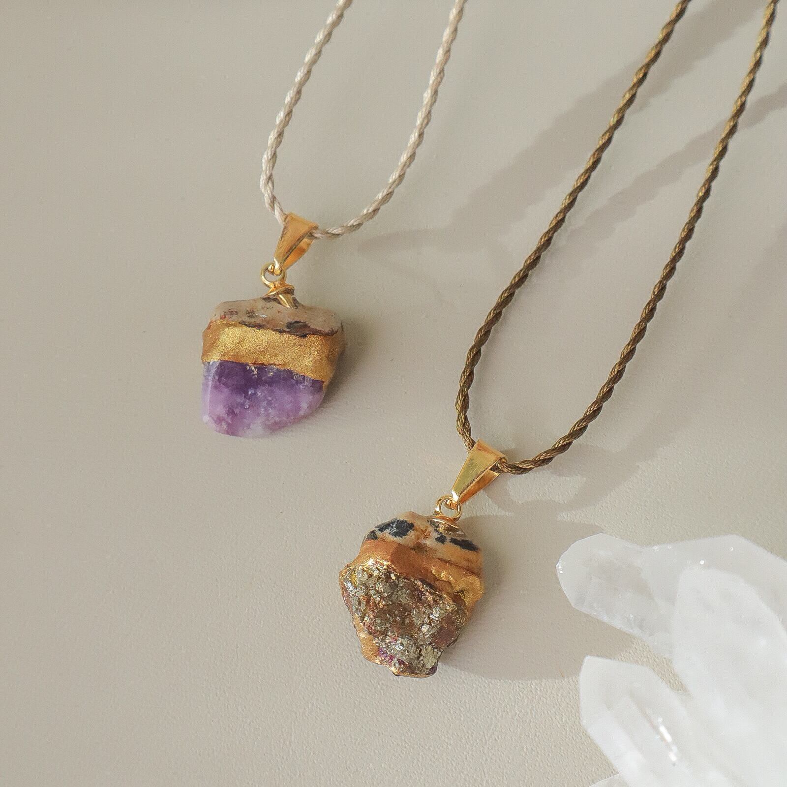 【一点もの】天然石の金継ぎシルク紐ペンダントネックレス 金属アレルギー対応 チャロアイト ダルメシアンジャスパー ギフト 守護石 誕生日