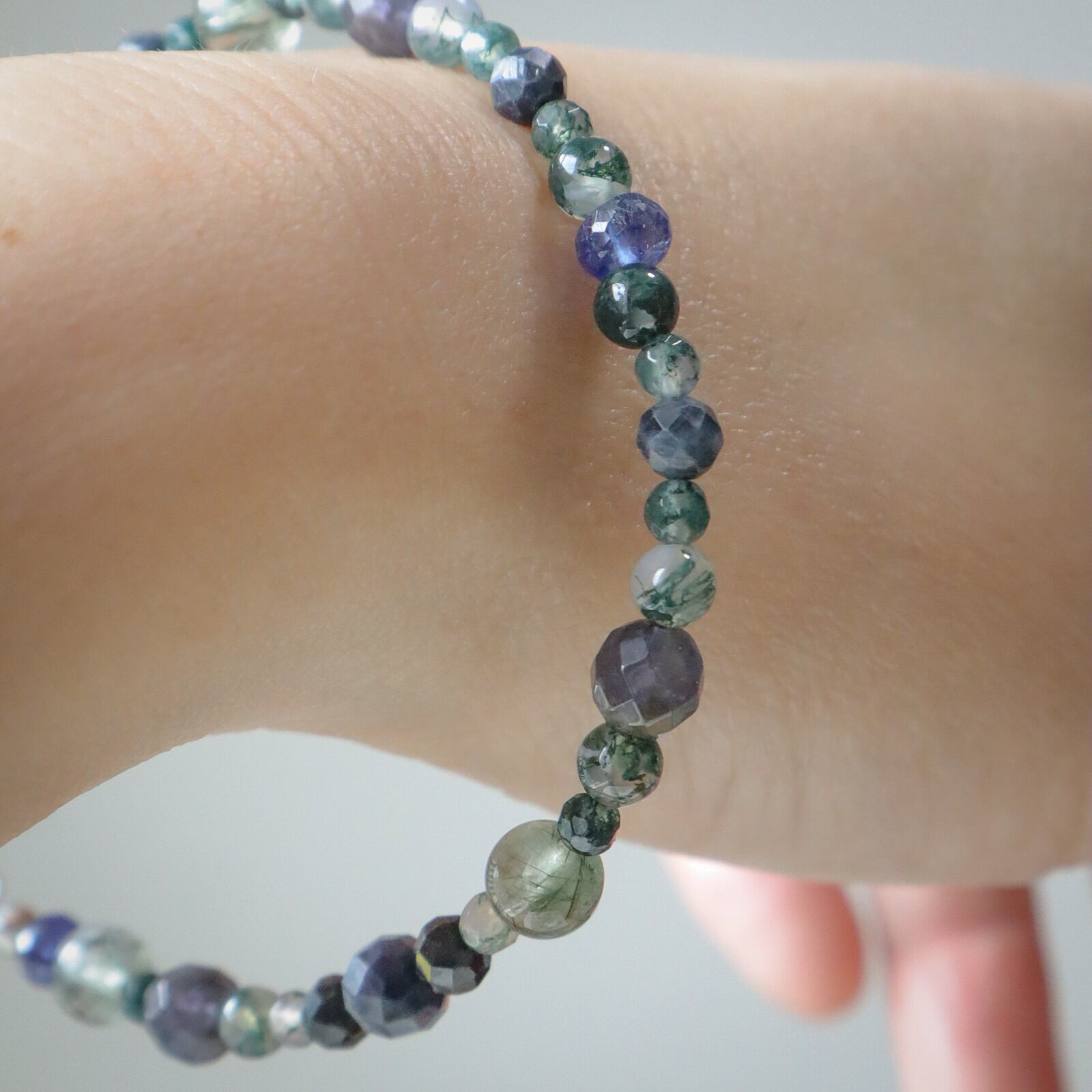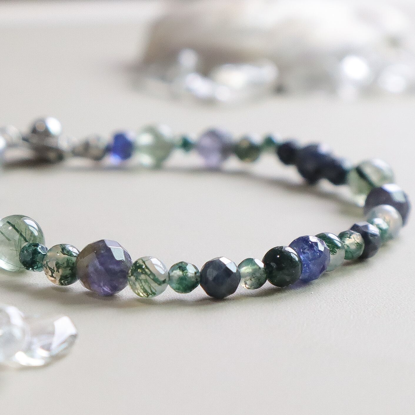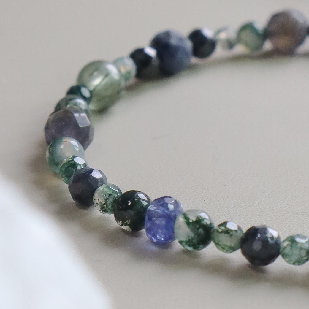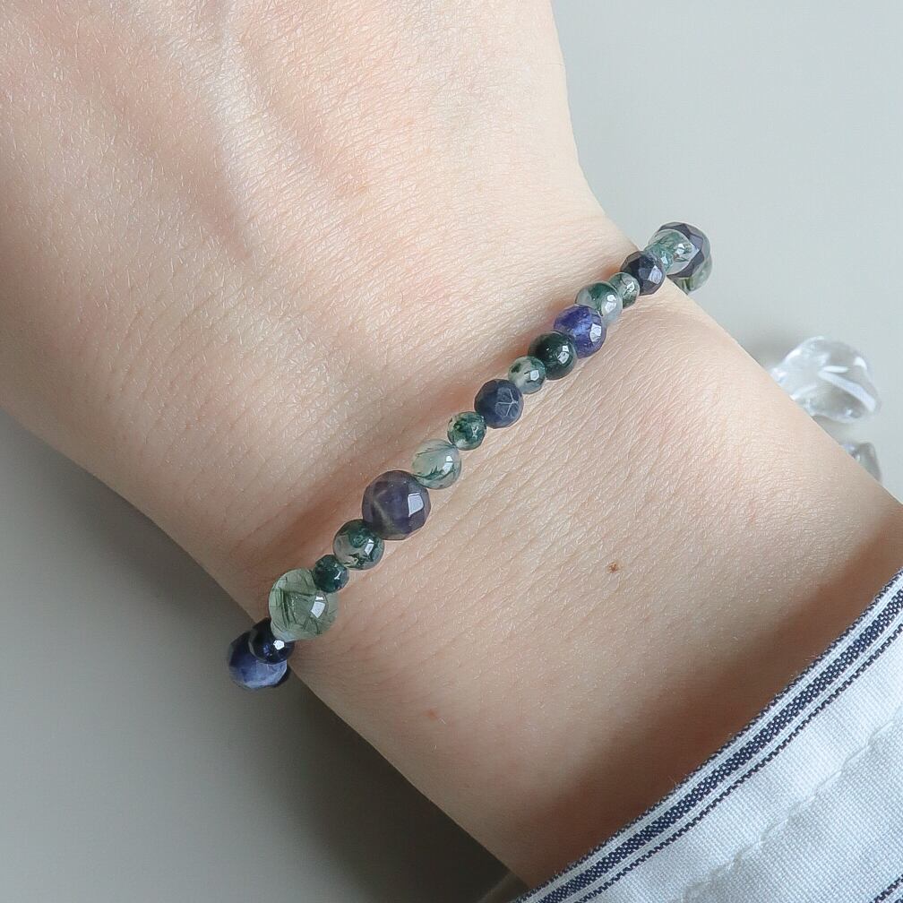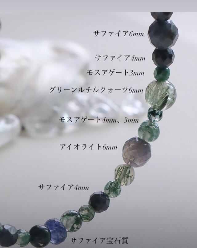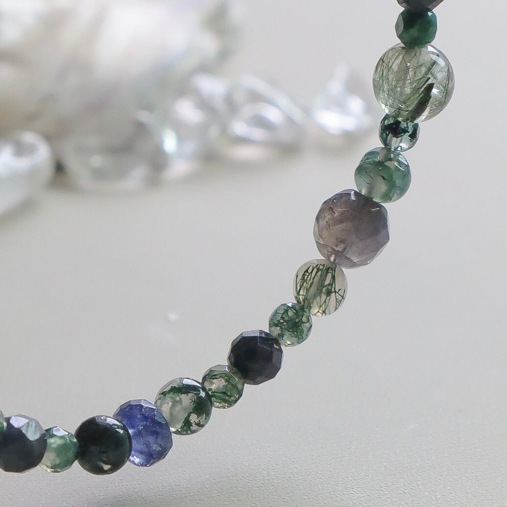 自然を感じるモスアゲートとグリーンルチルクォーツをいれ、アウトドアなファッションにも合わせやすいです。