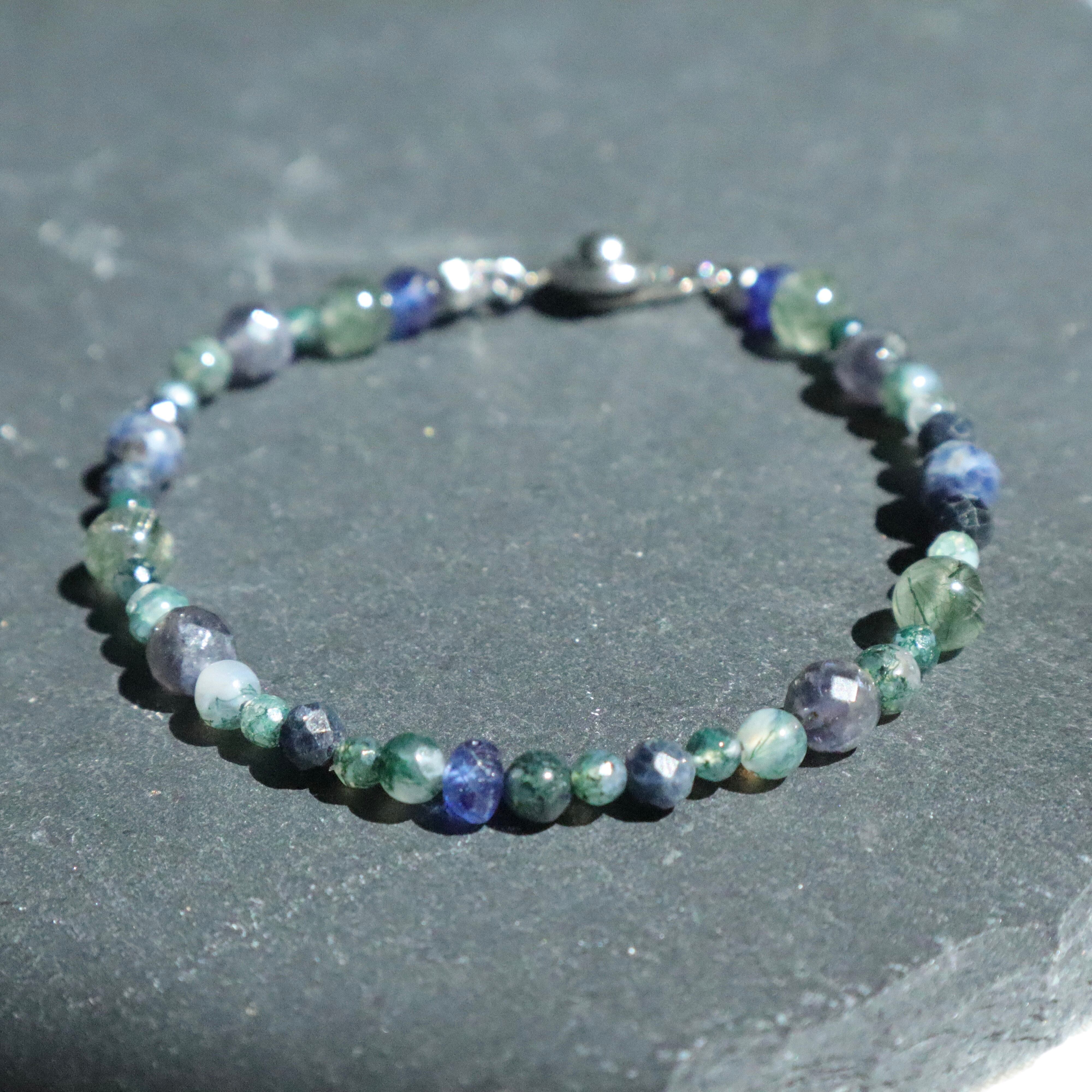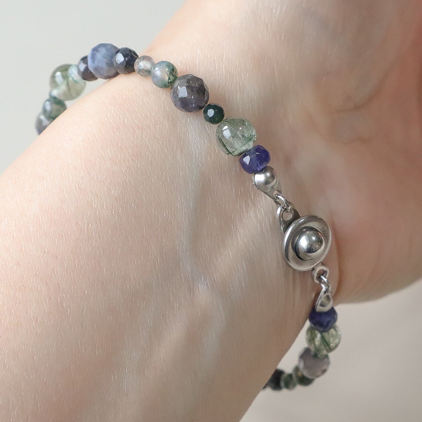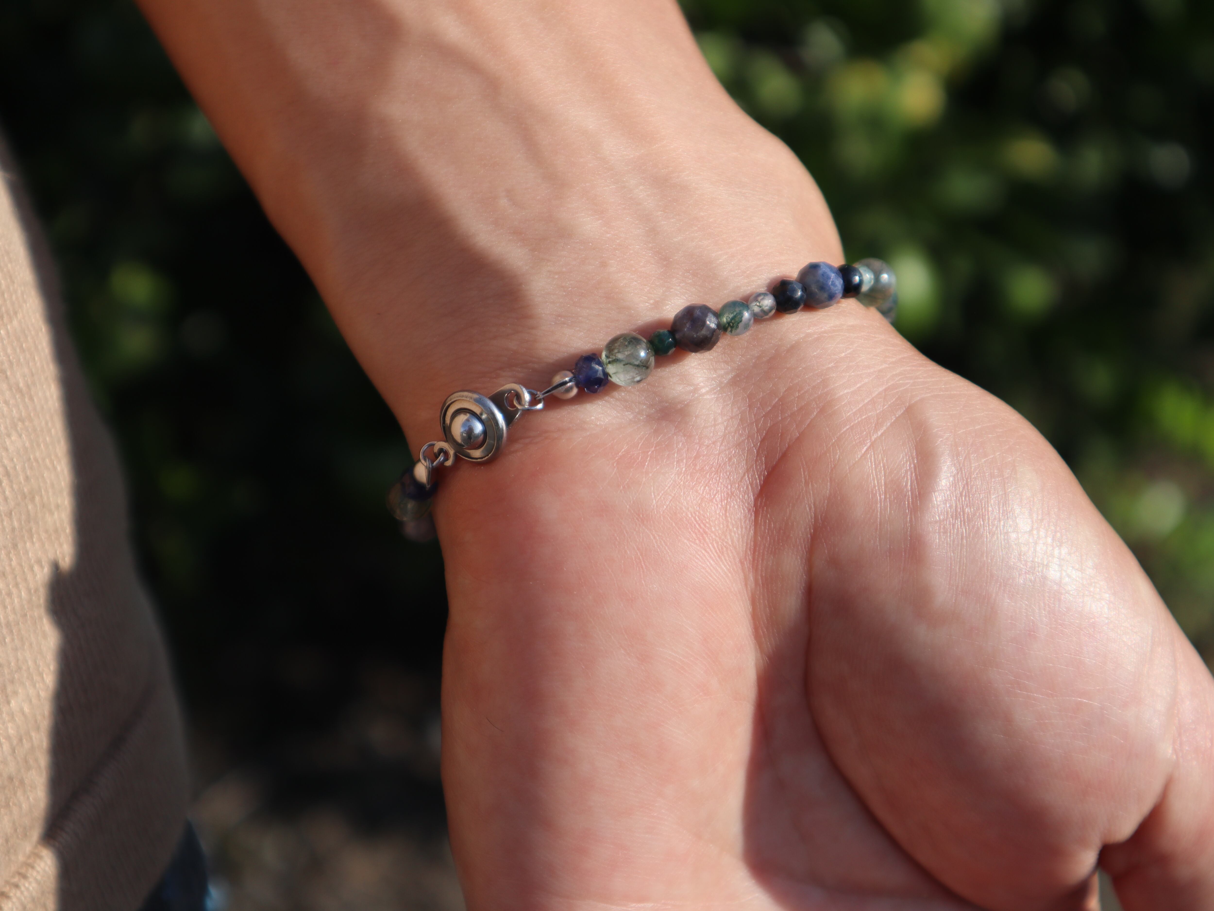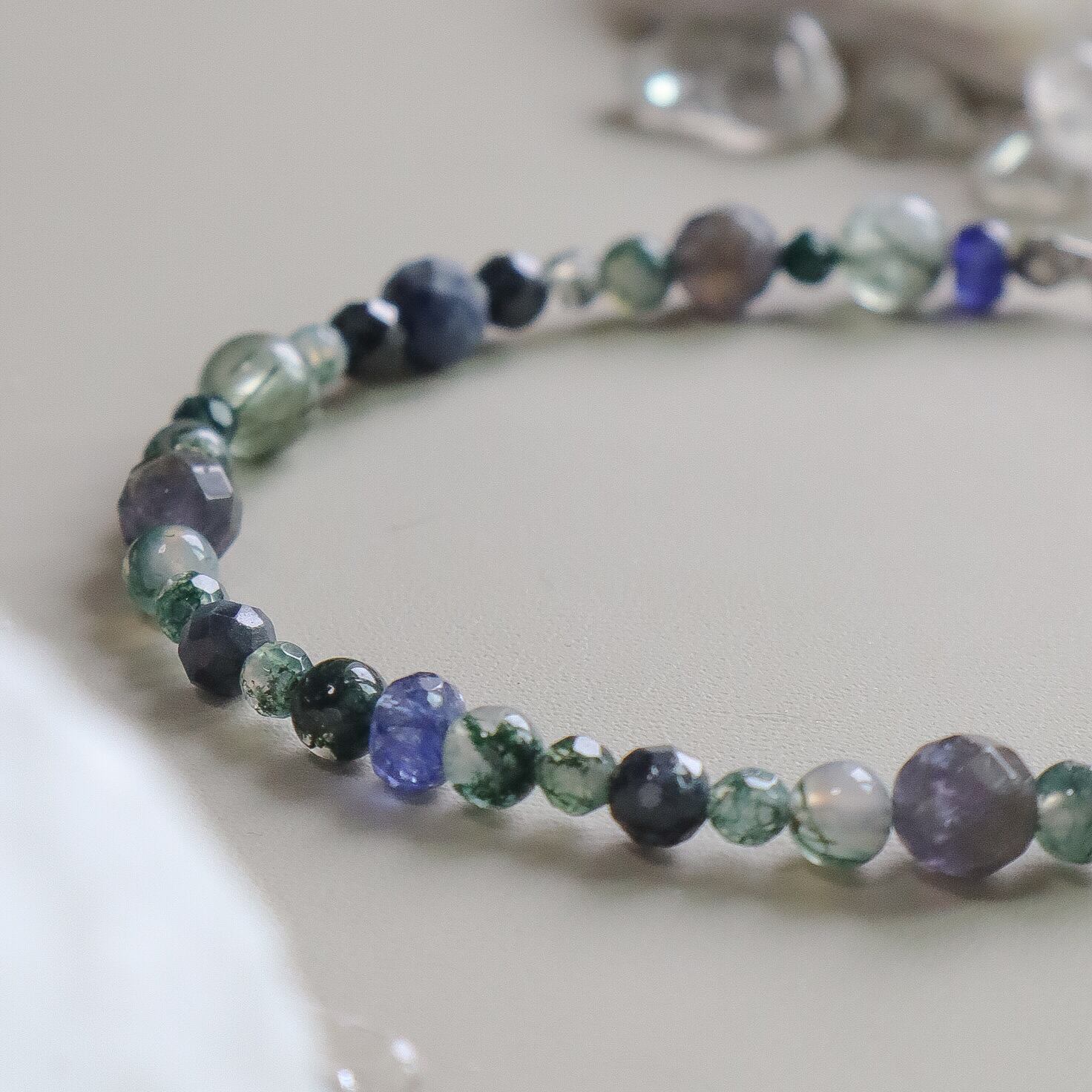 自然を感じるモスアゲートとグリーンルチルクォーツをいれ、アウトドアなファッションにも合わせやすいです。