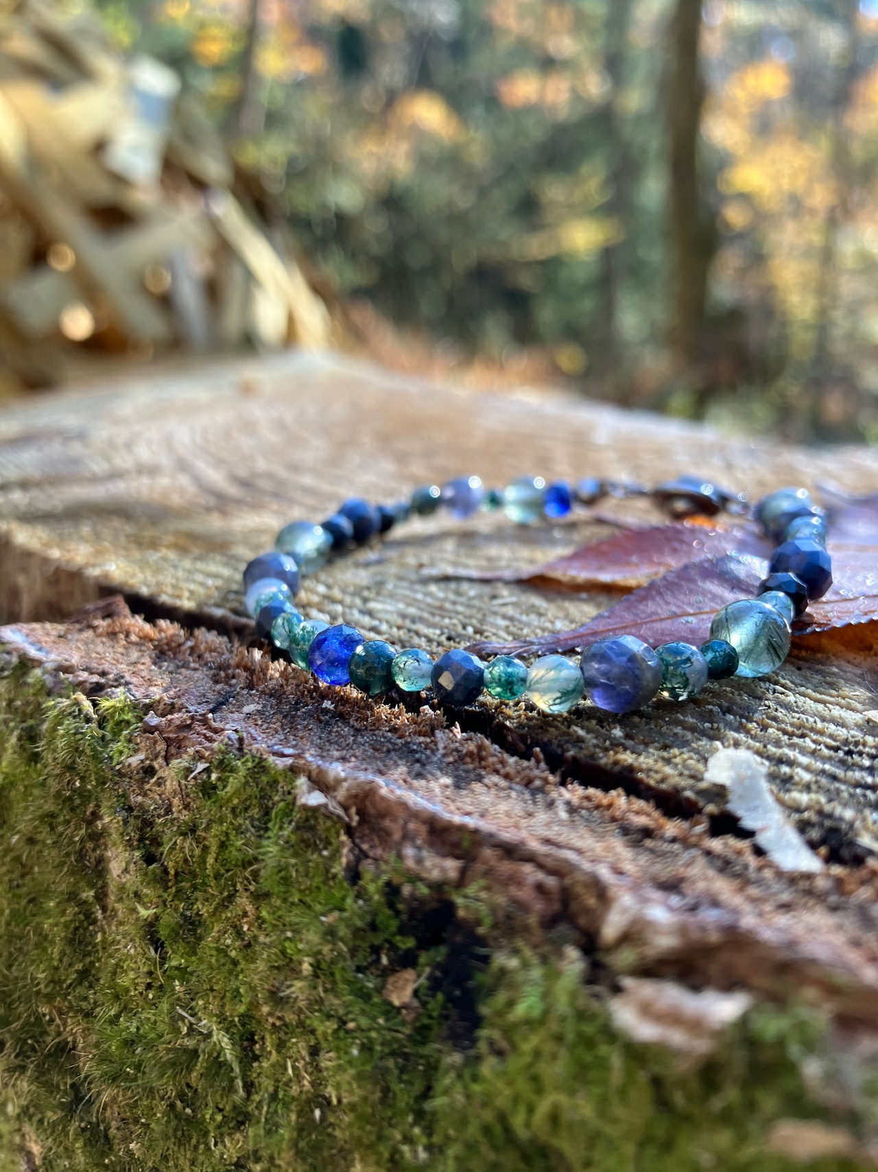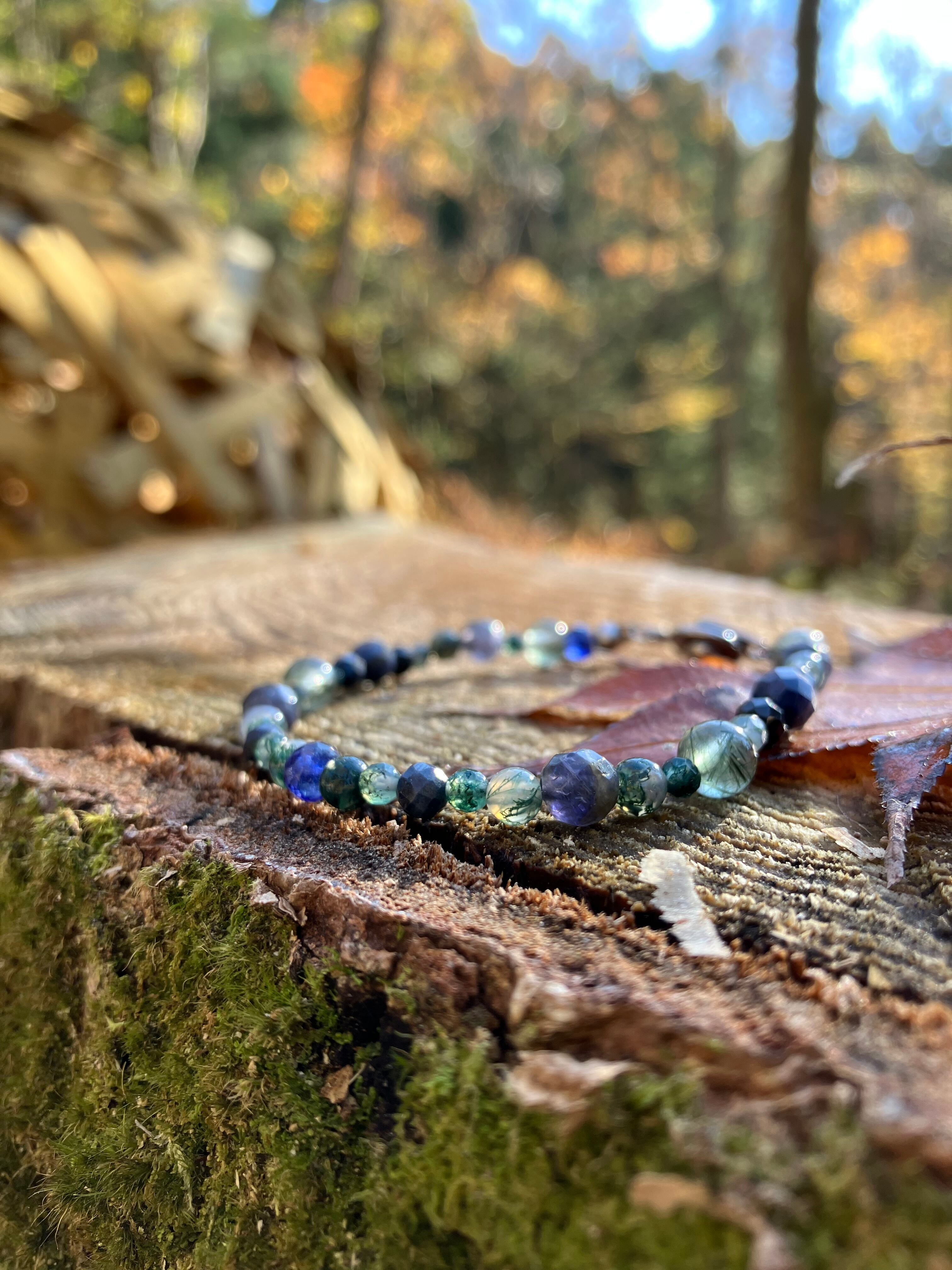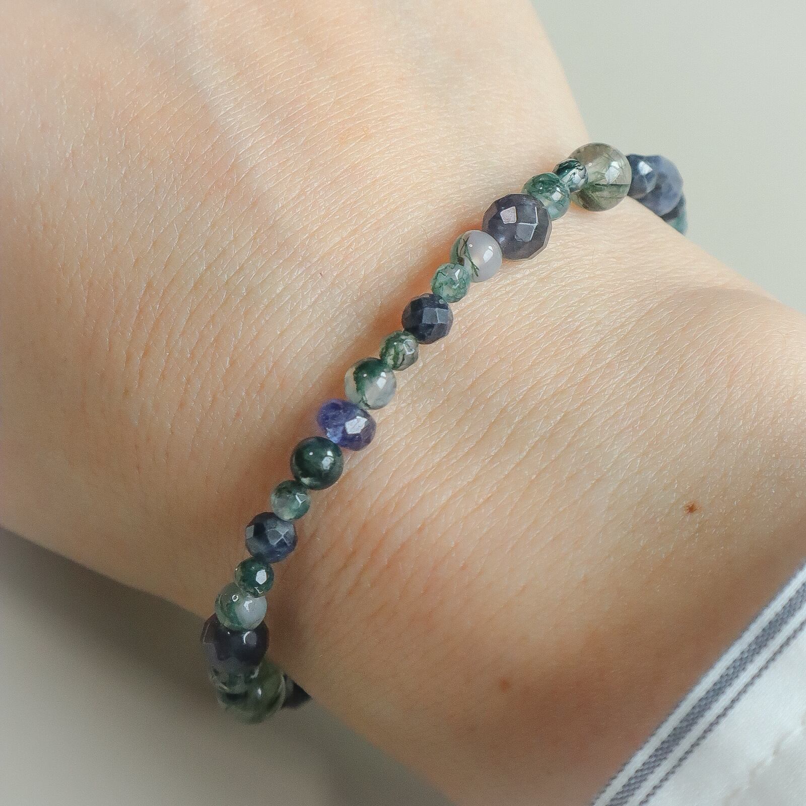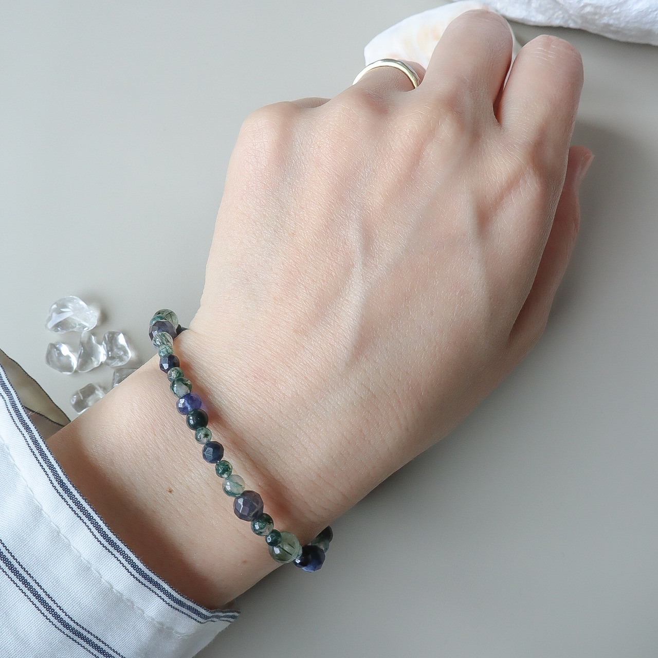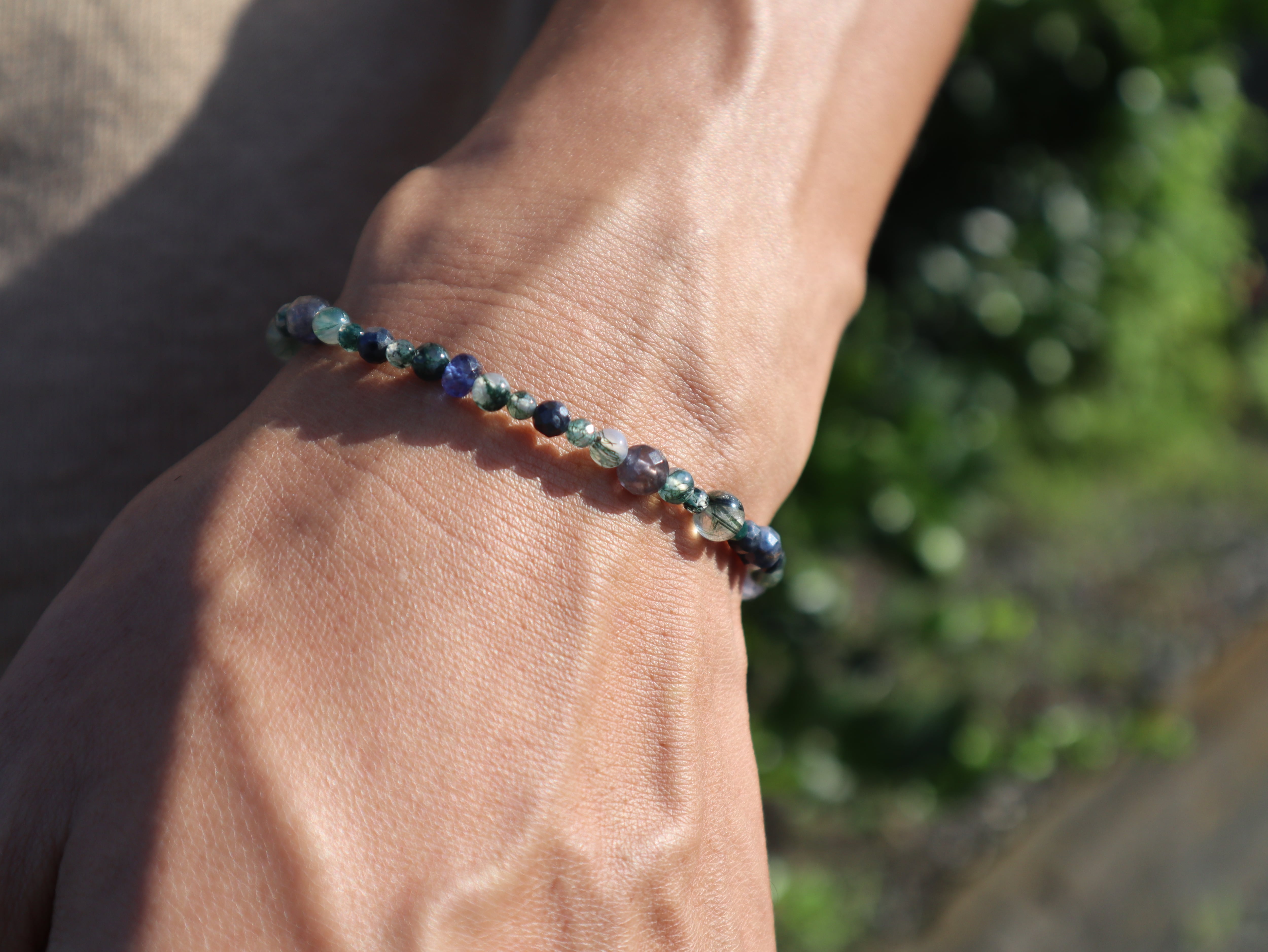 自然を感じるモスアゲートとグリーンルチルクォーツをいれ、アウトドアなファッションにも合わせやすいです。