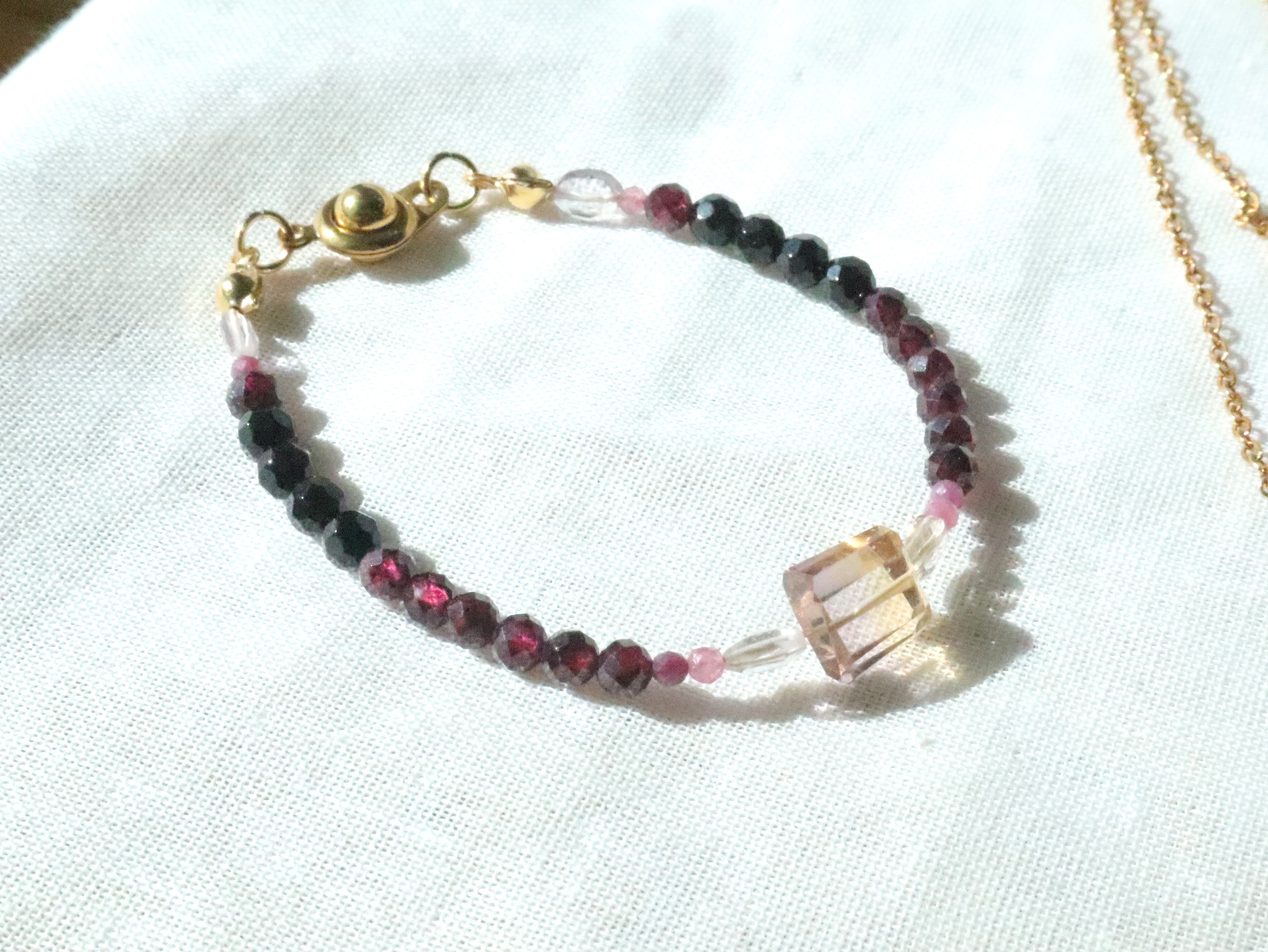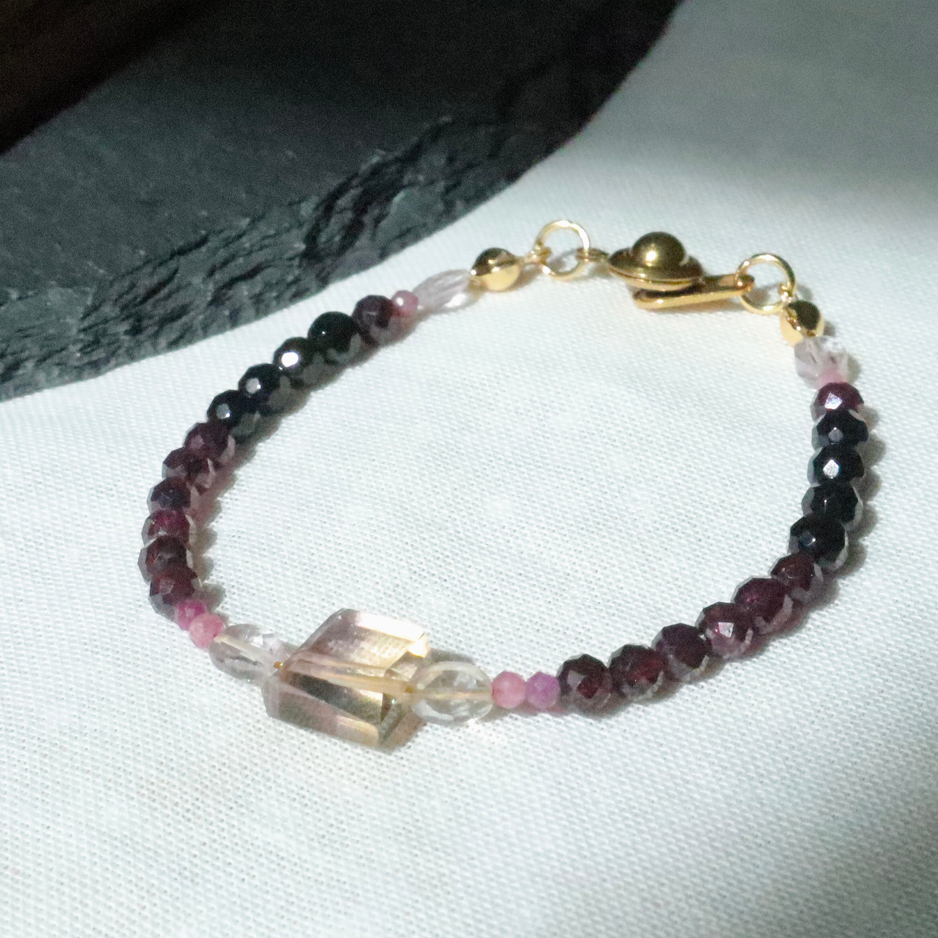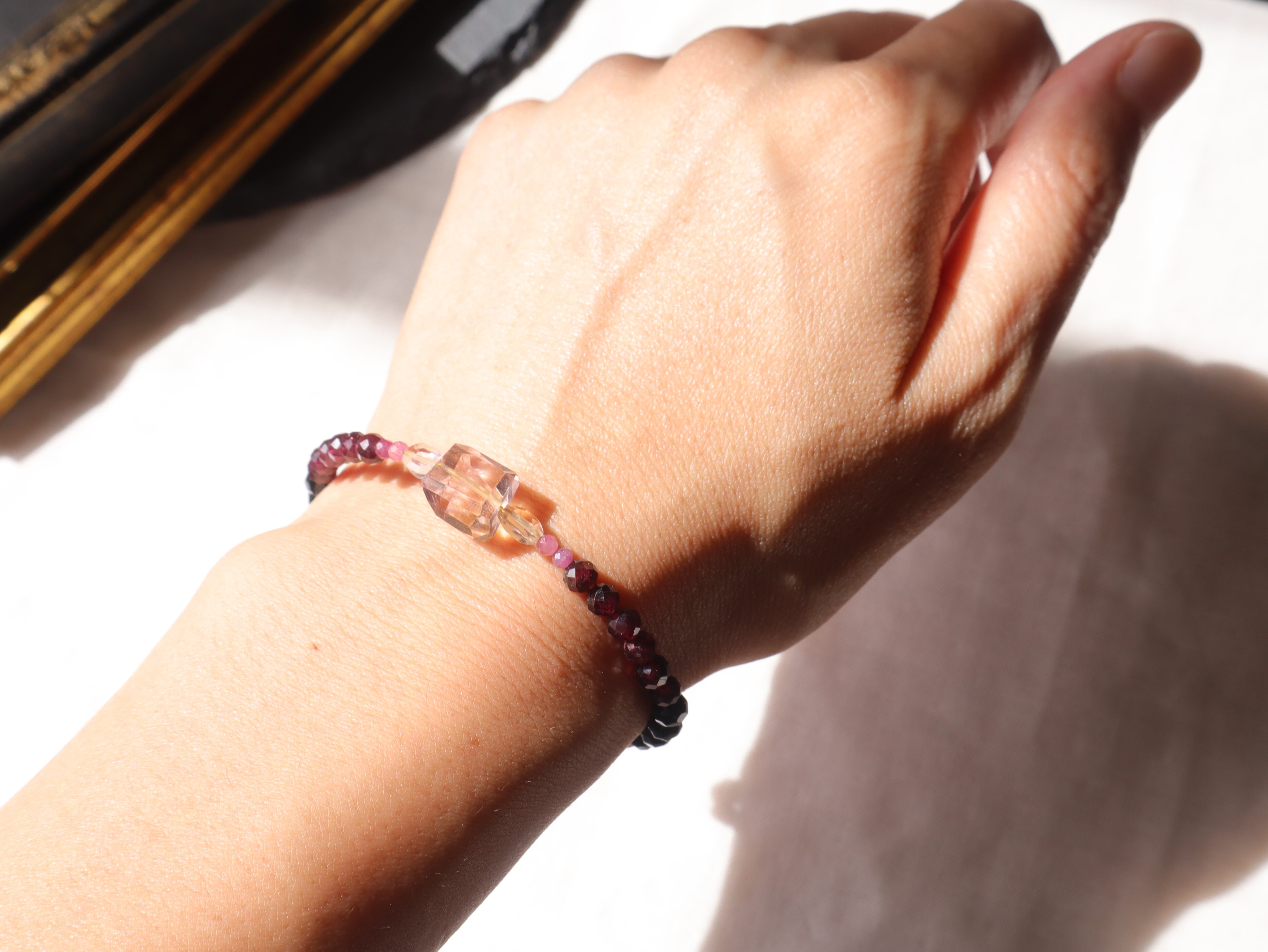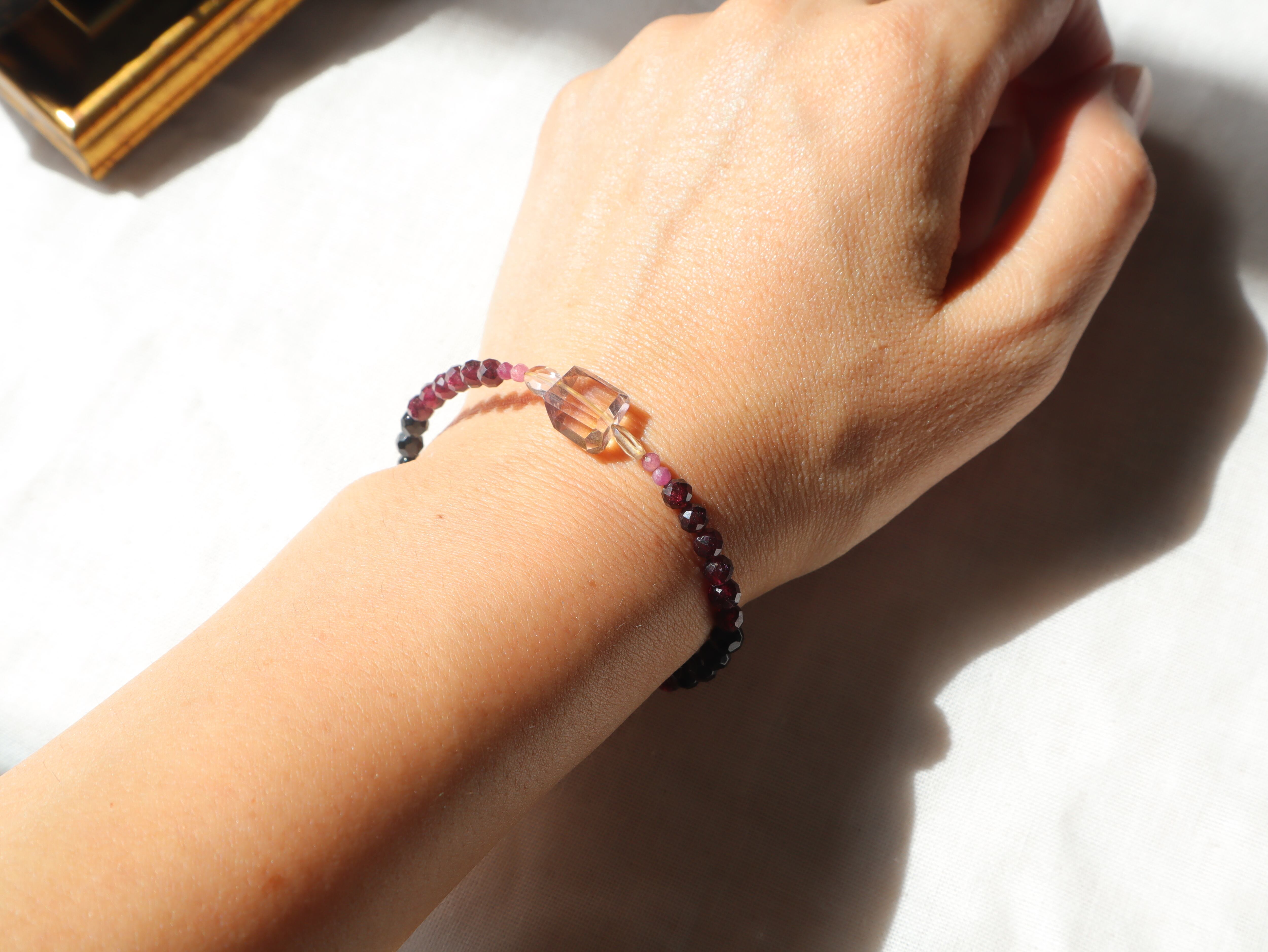希少で神秘的なパープルのアメトリンから、ルビーのピンク、ロードライトガーネットのワインレッド、ブラックトルマリンの黒へのグラデーションが美しいブレスレット。