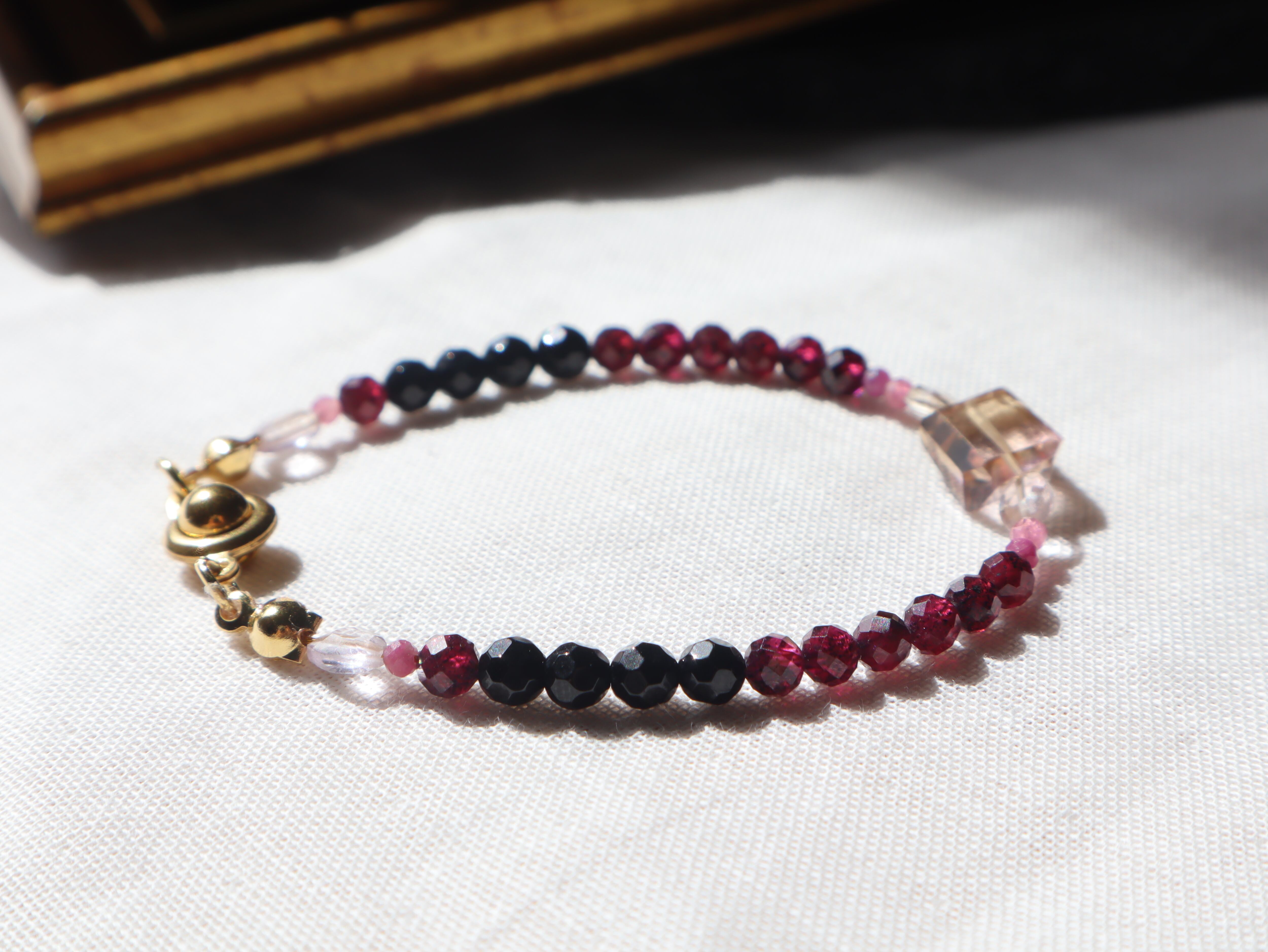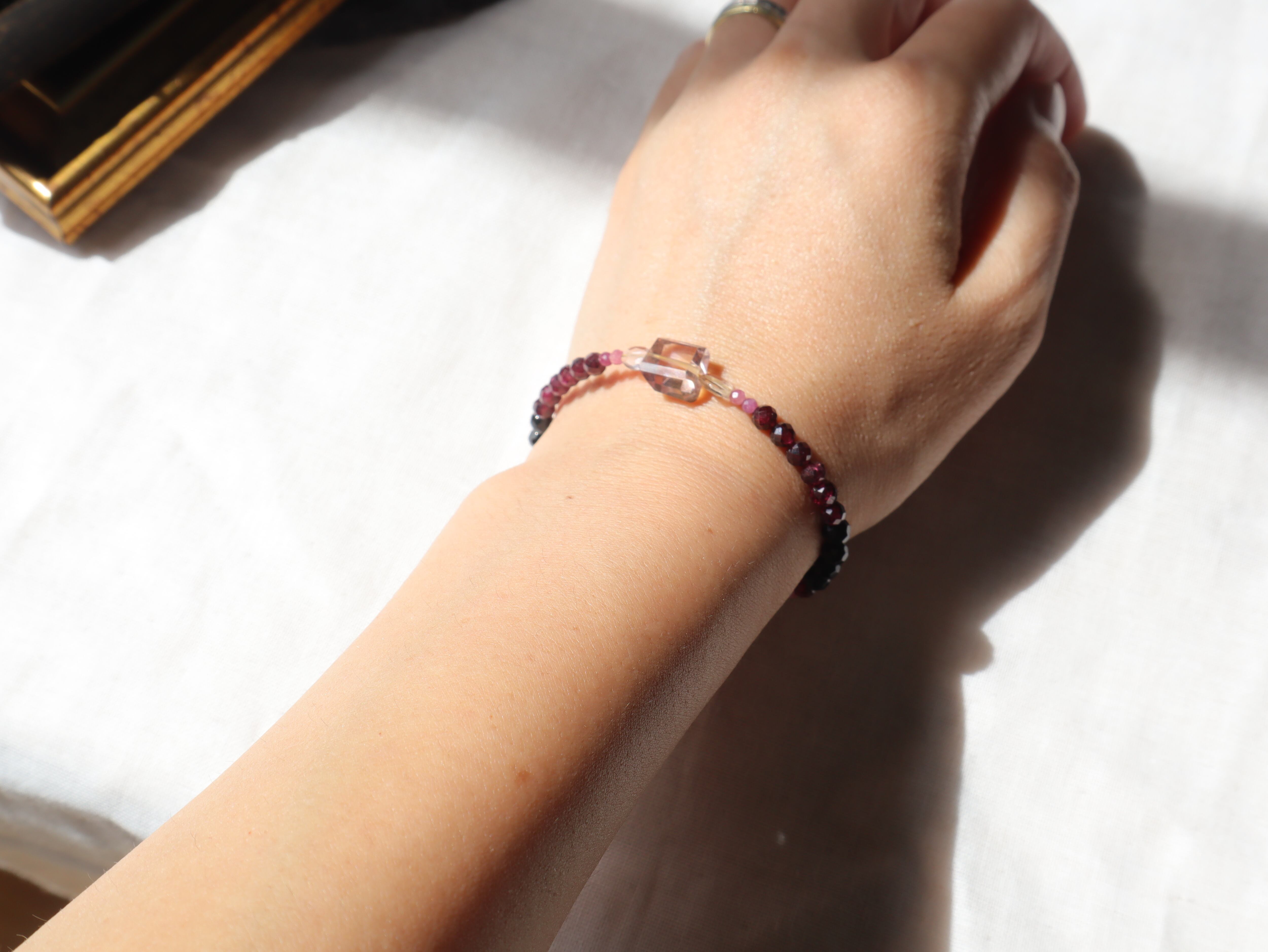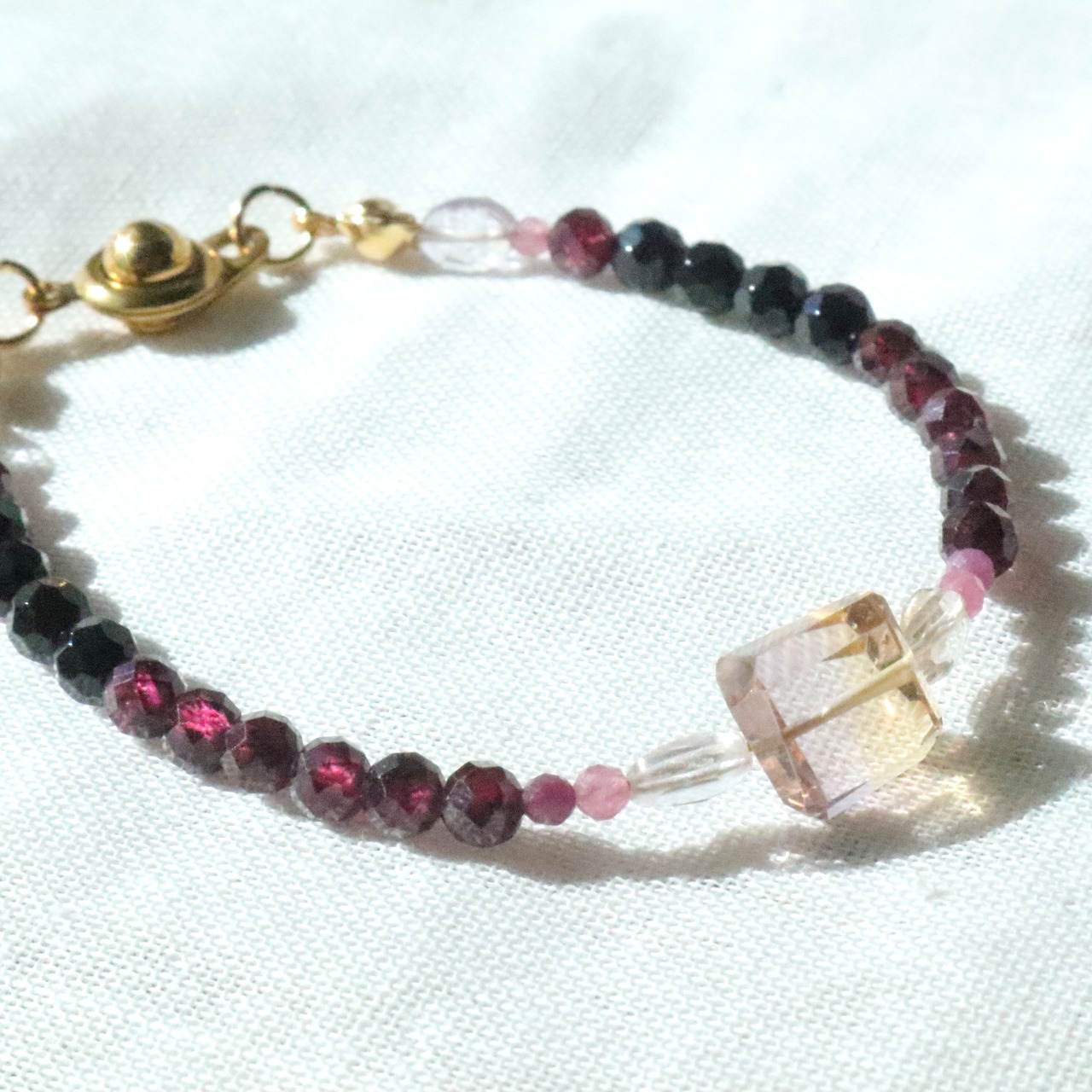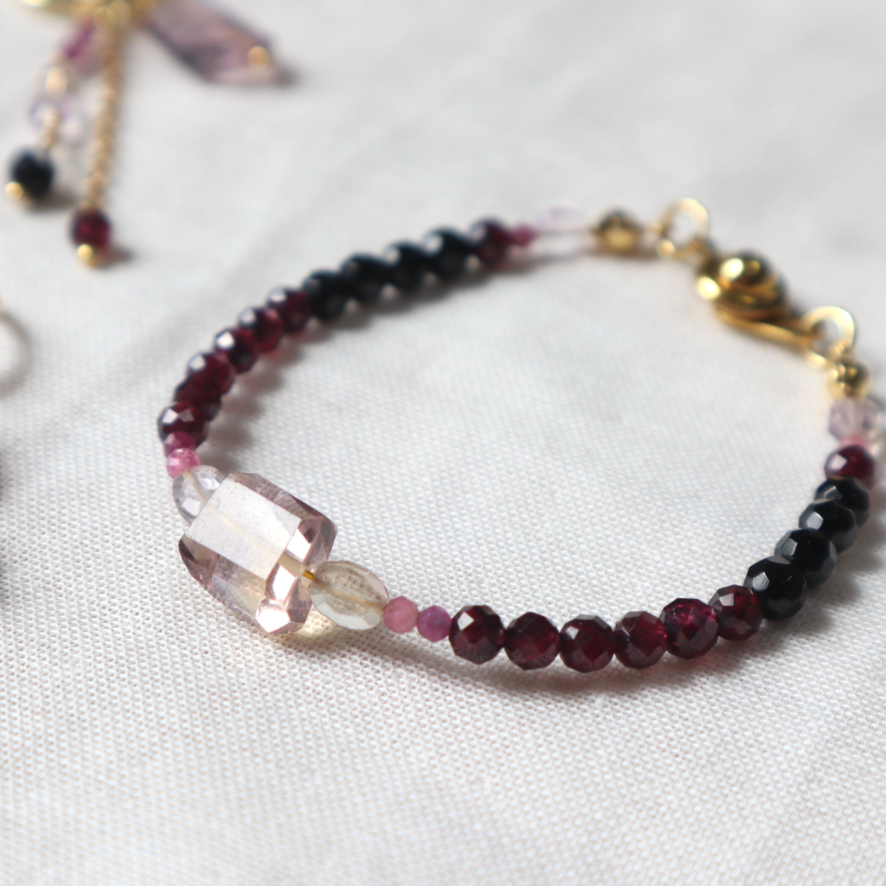 希少で神秘的なパープルのアメトリンから、ルビーのピンク、ロードライトガーネットのワインレッド、ブラックトルマリンの黒へのグラデーションが美しいブレスレット。