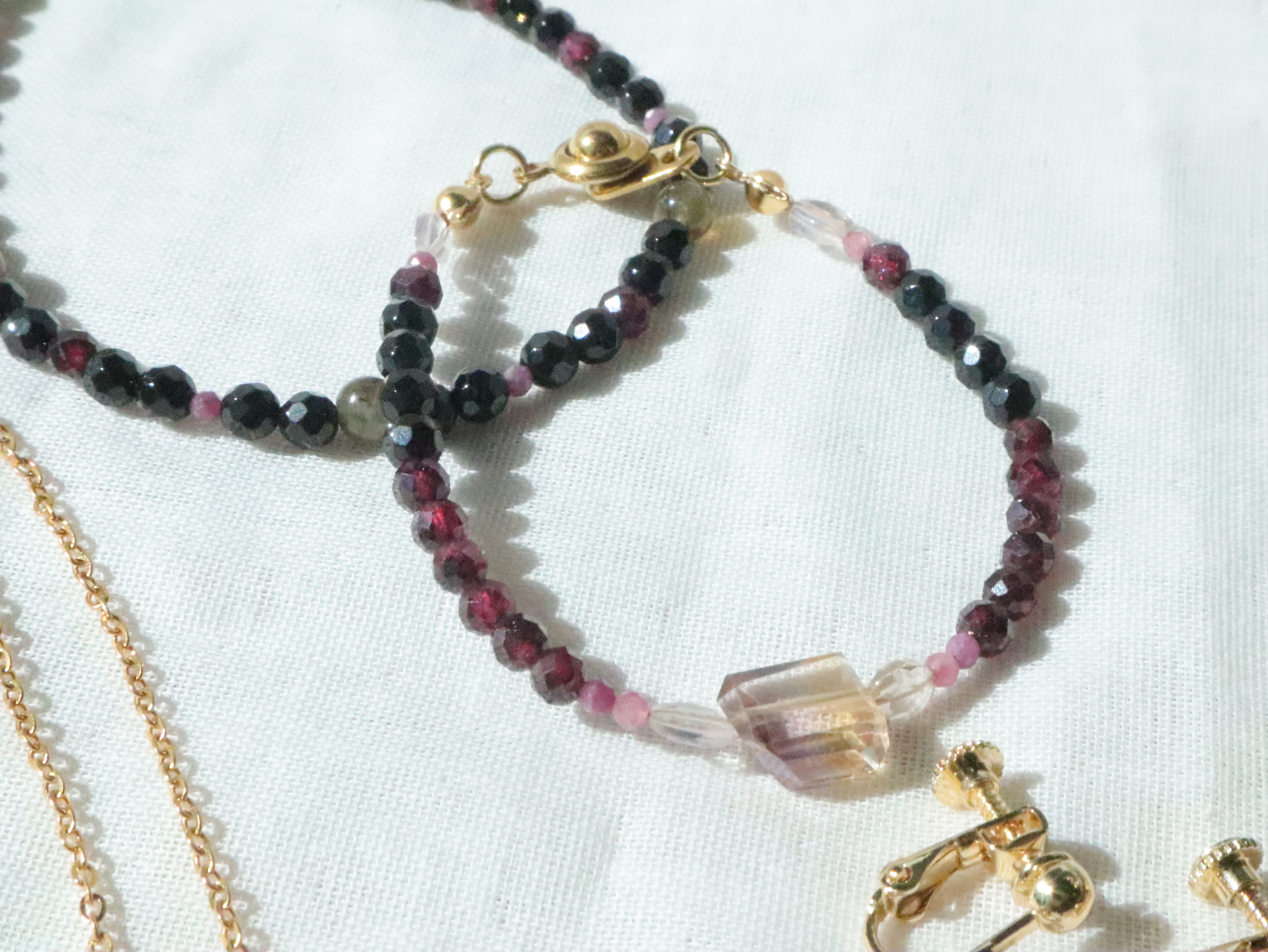 華奢で小粒の天然石は、深みのあるカラーが連なっていても女性らしさの感じる手首元に。