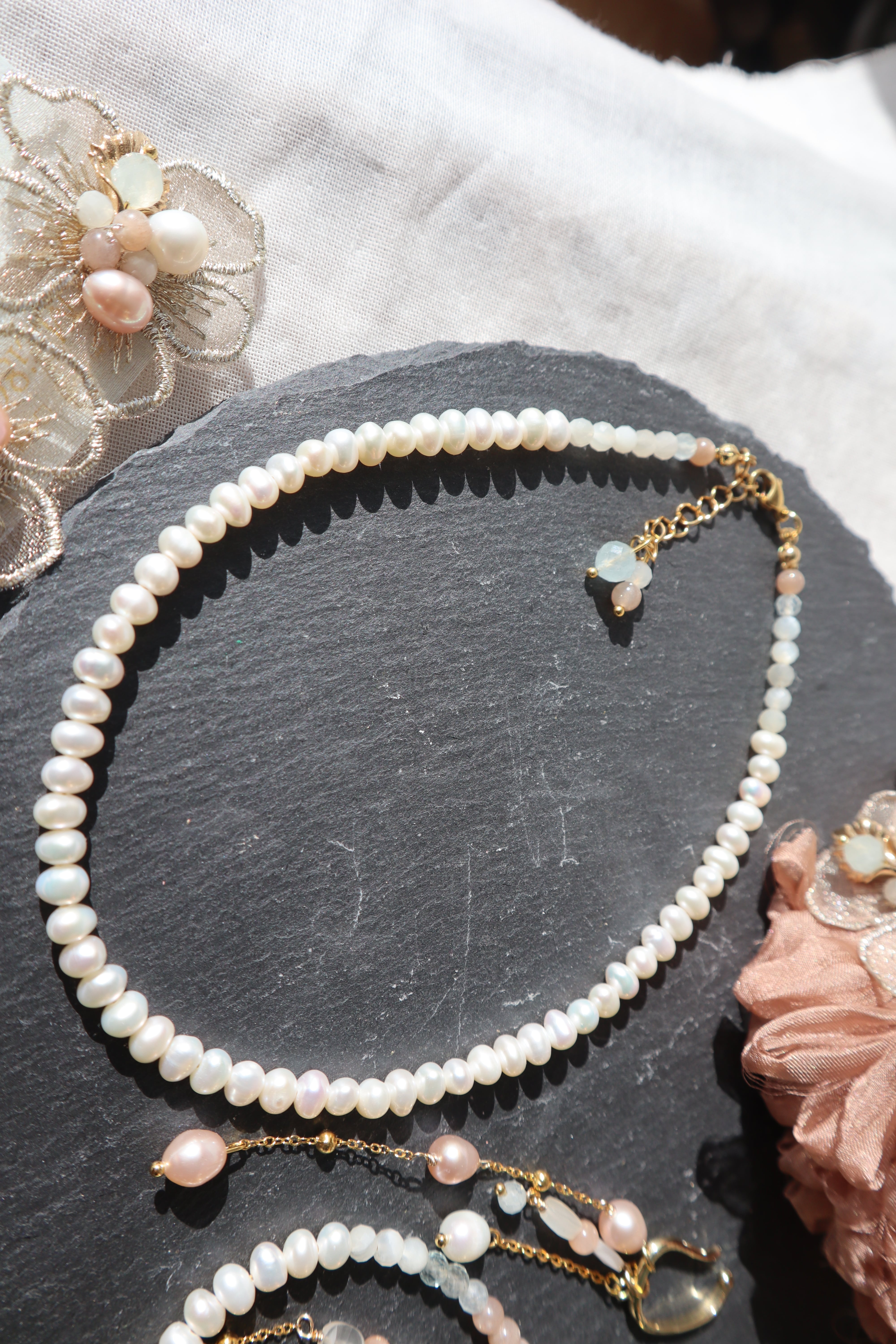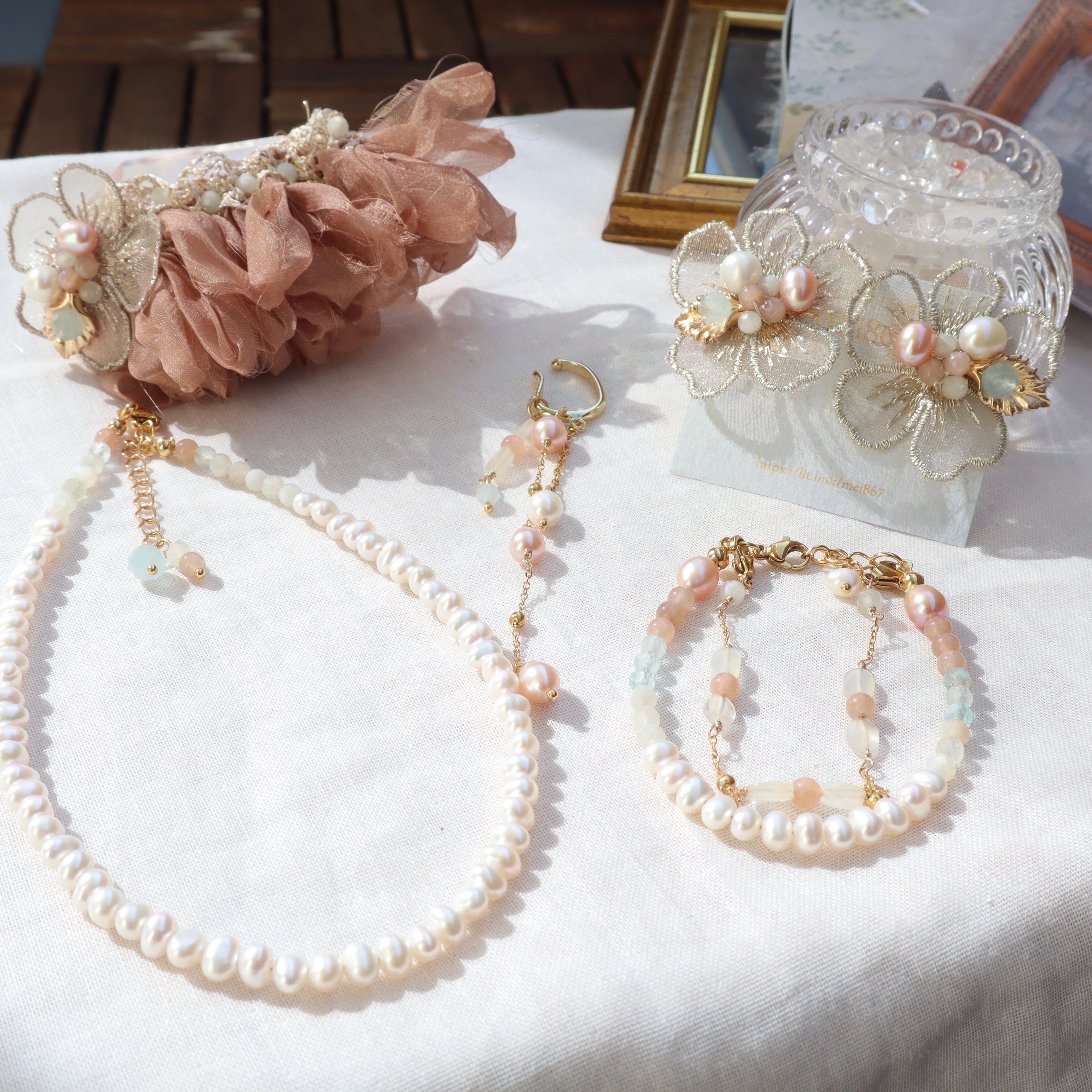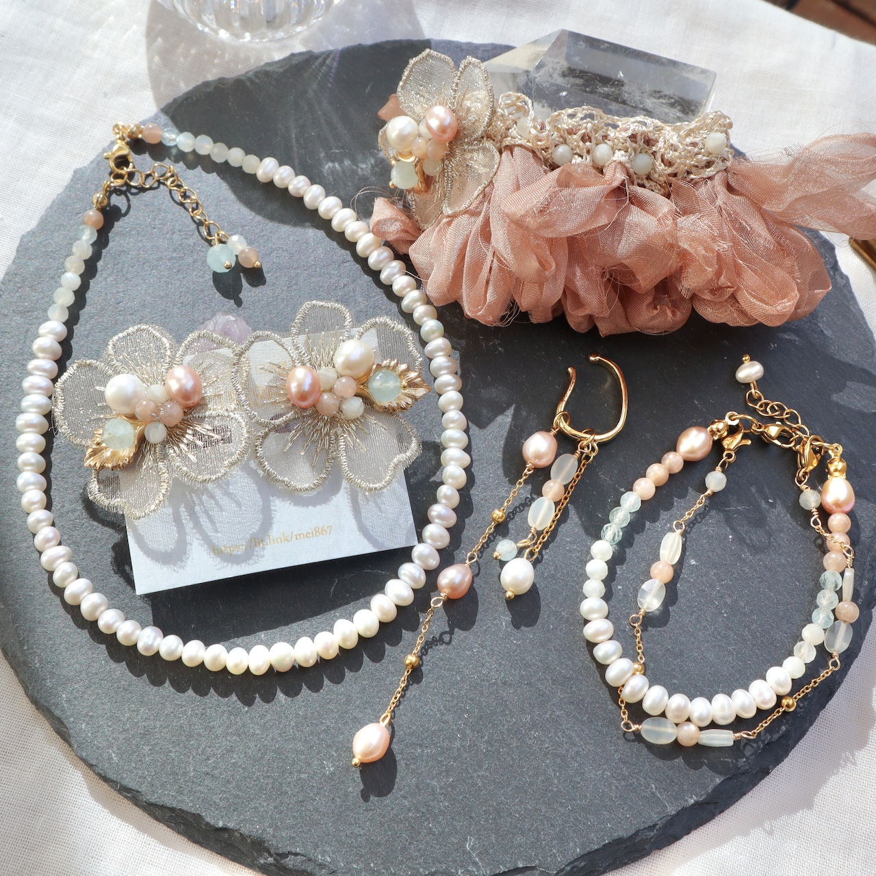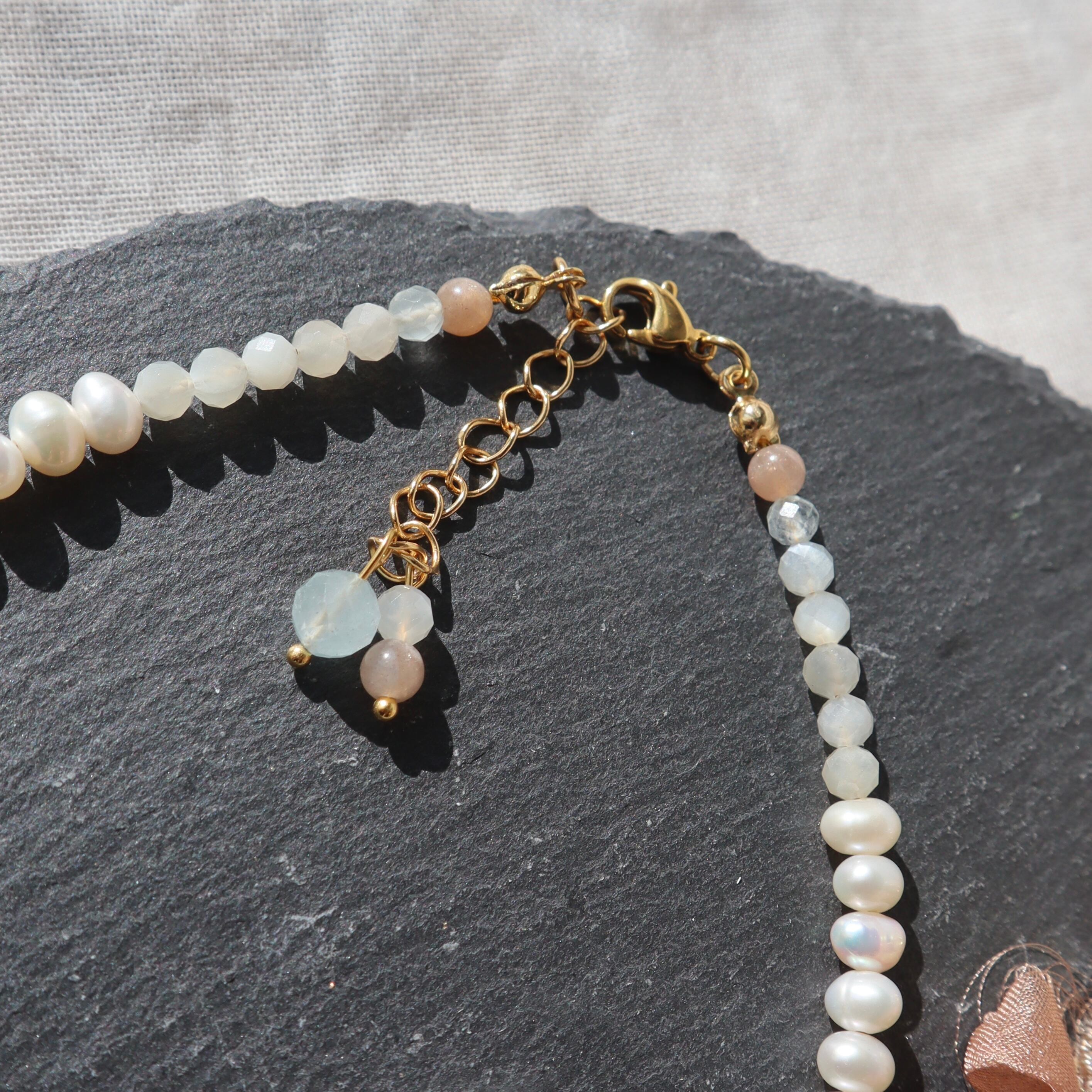 アクアマリンとオレンジムーンストーン、ムーンストーンをつけました。