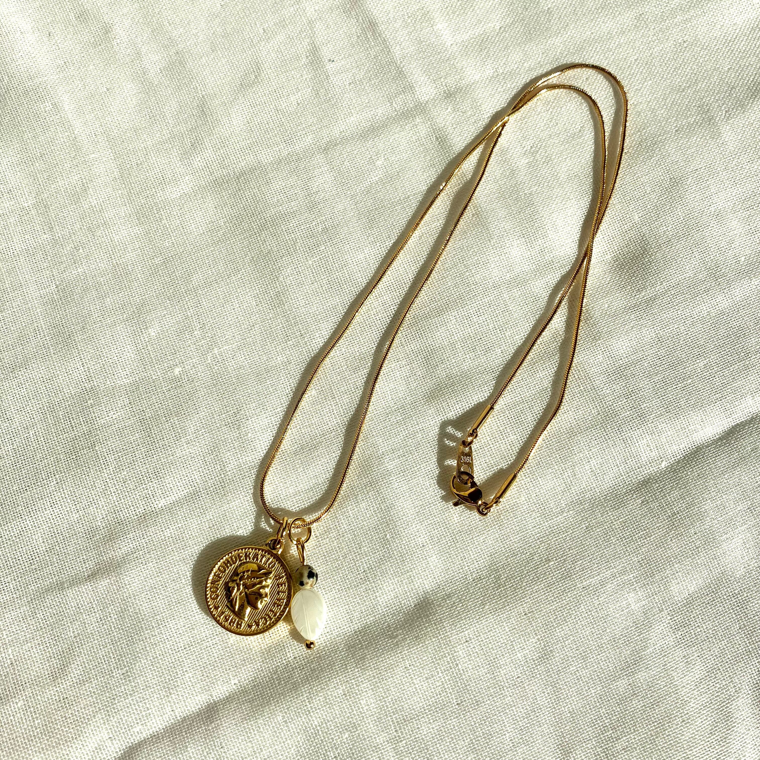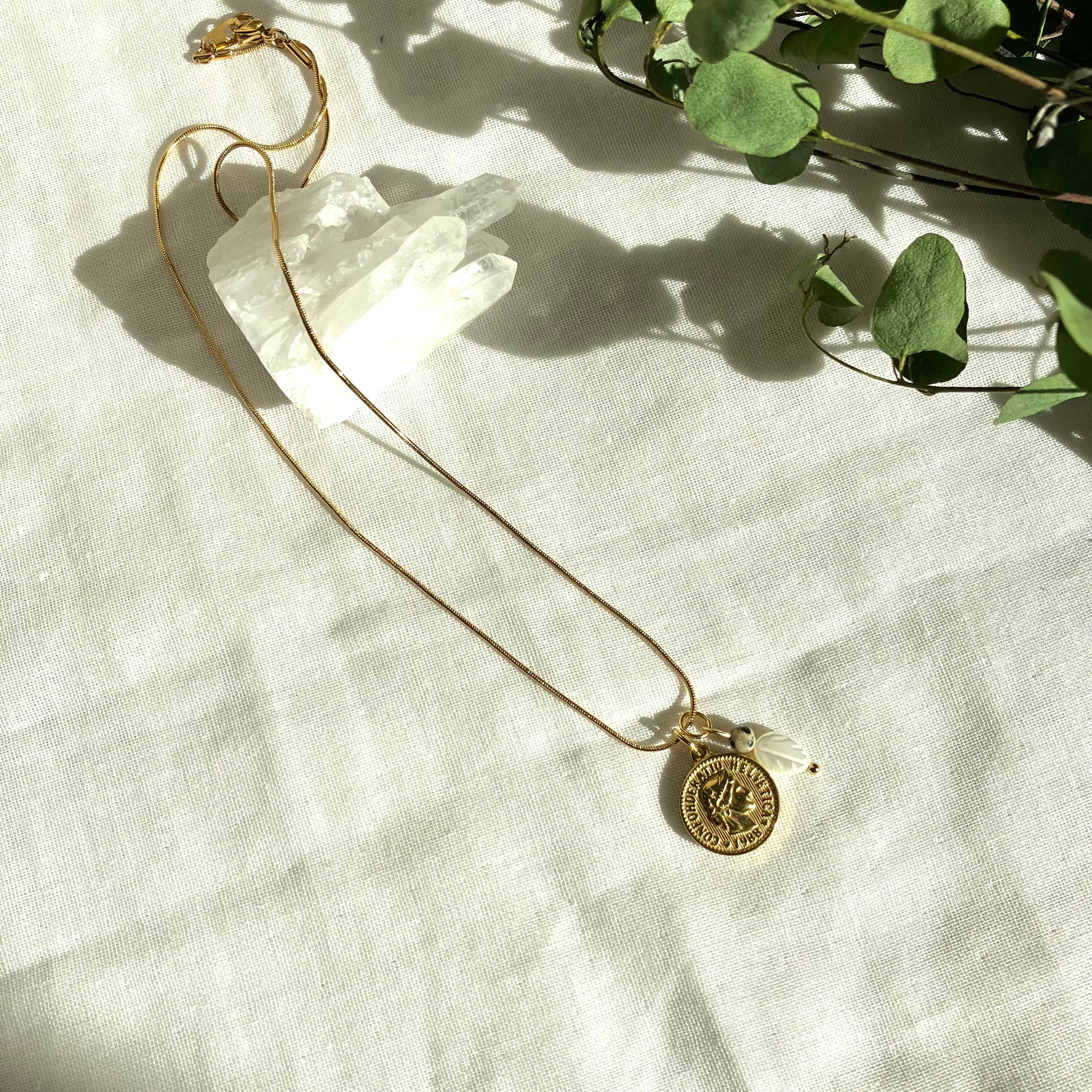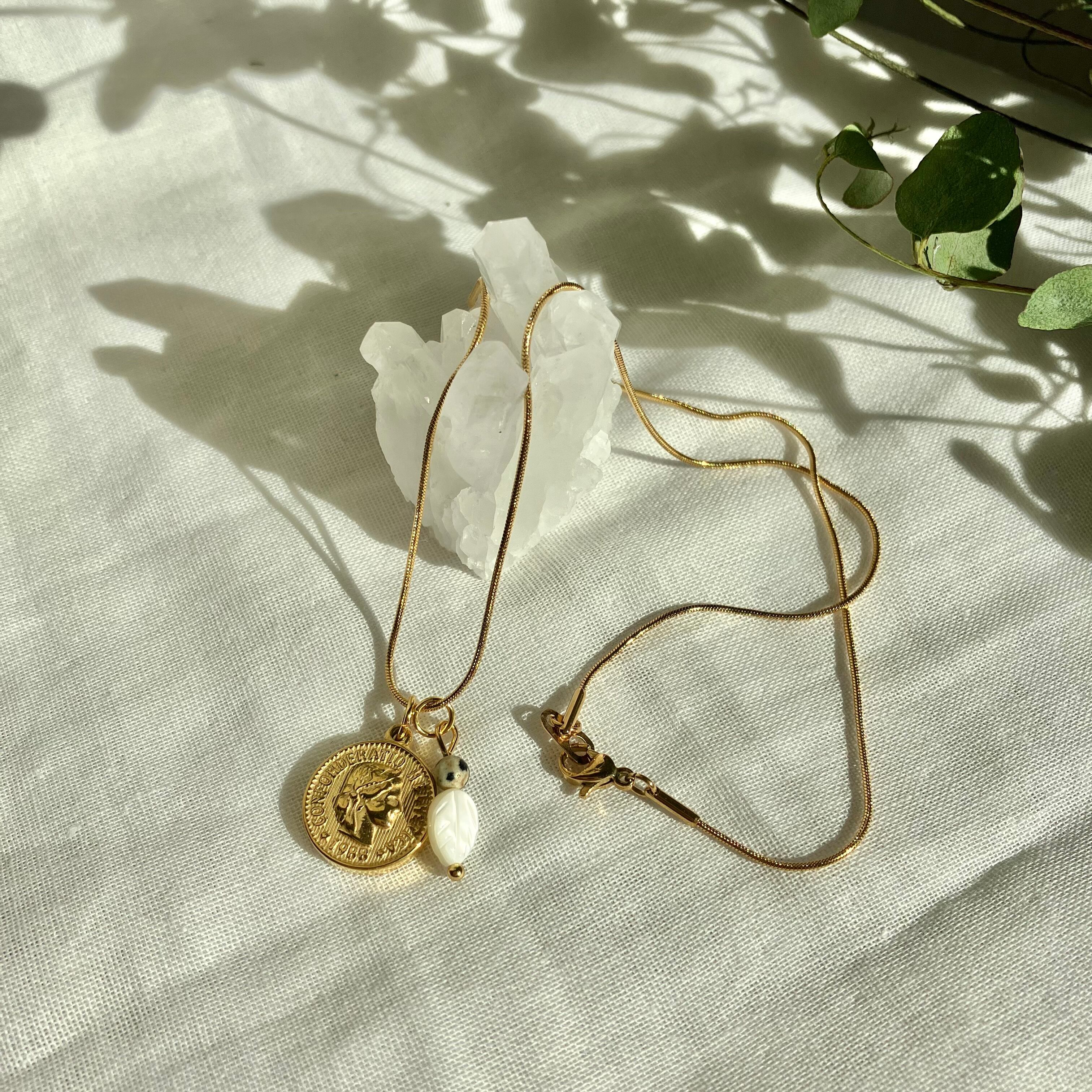 絡まらないネックレス リーフマザーオブパールと天然石のお守りゴールドコインネックレス 金属アレルギー対応 ダルメシアン モノトーン アンティーク 癒し おしゃれ