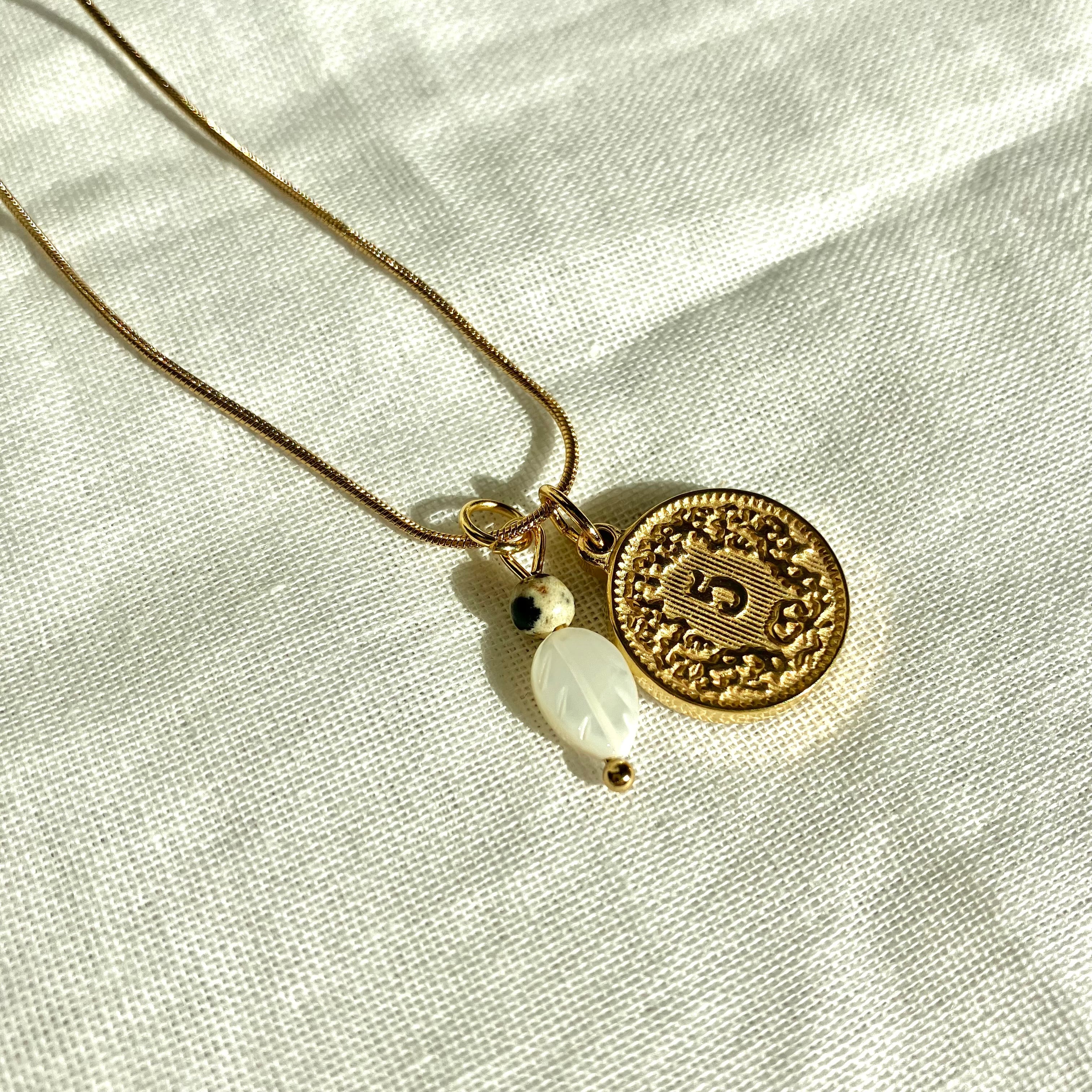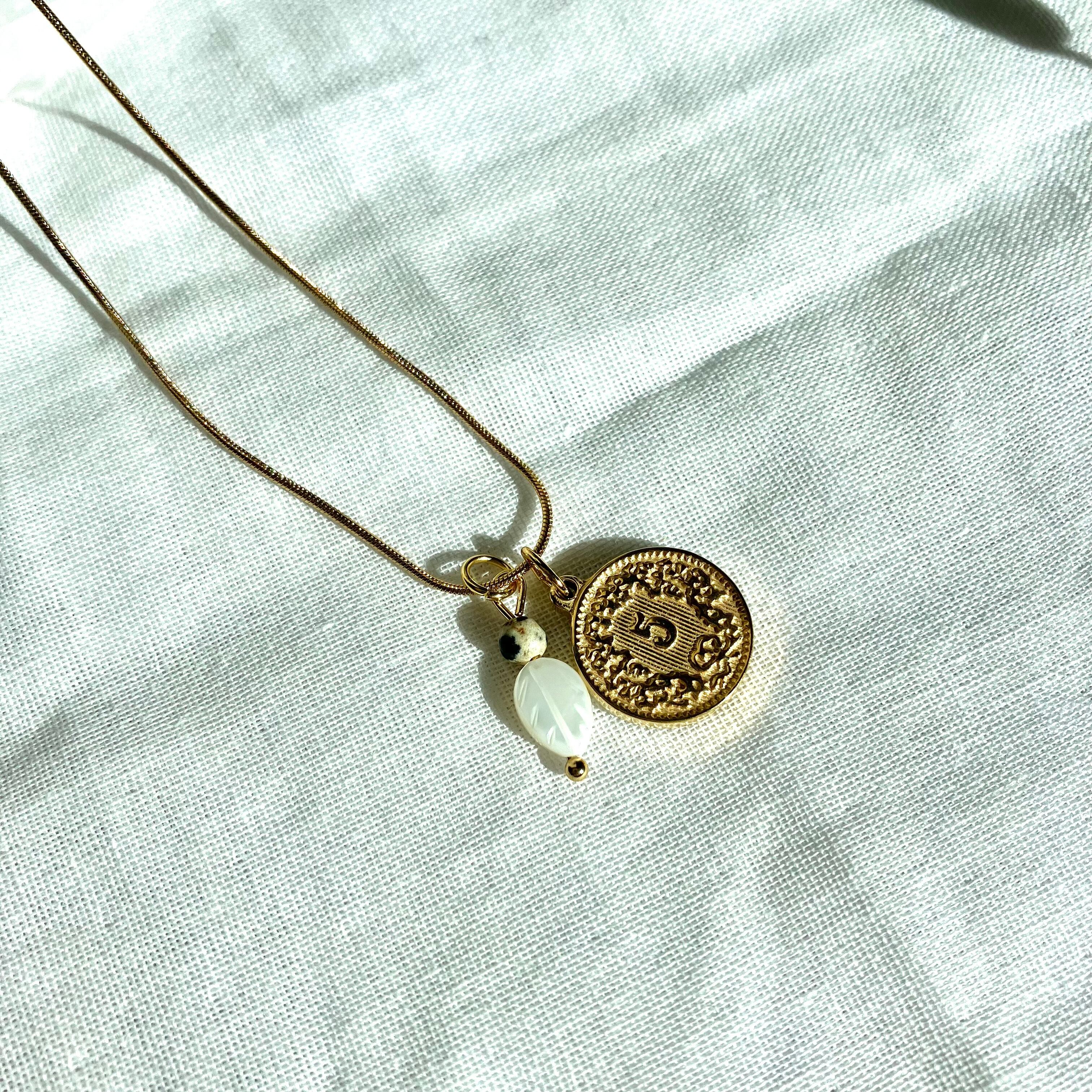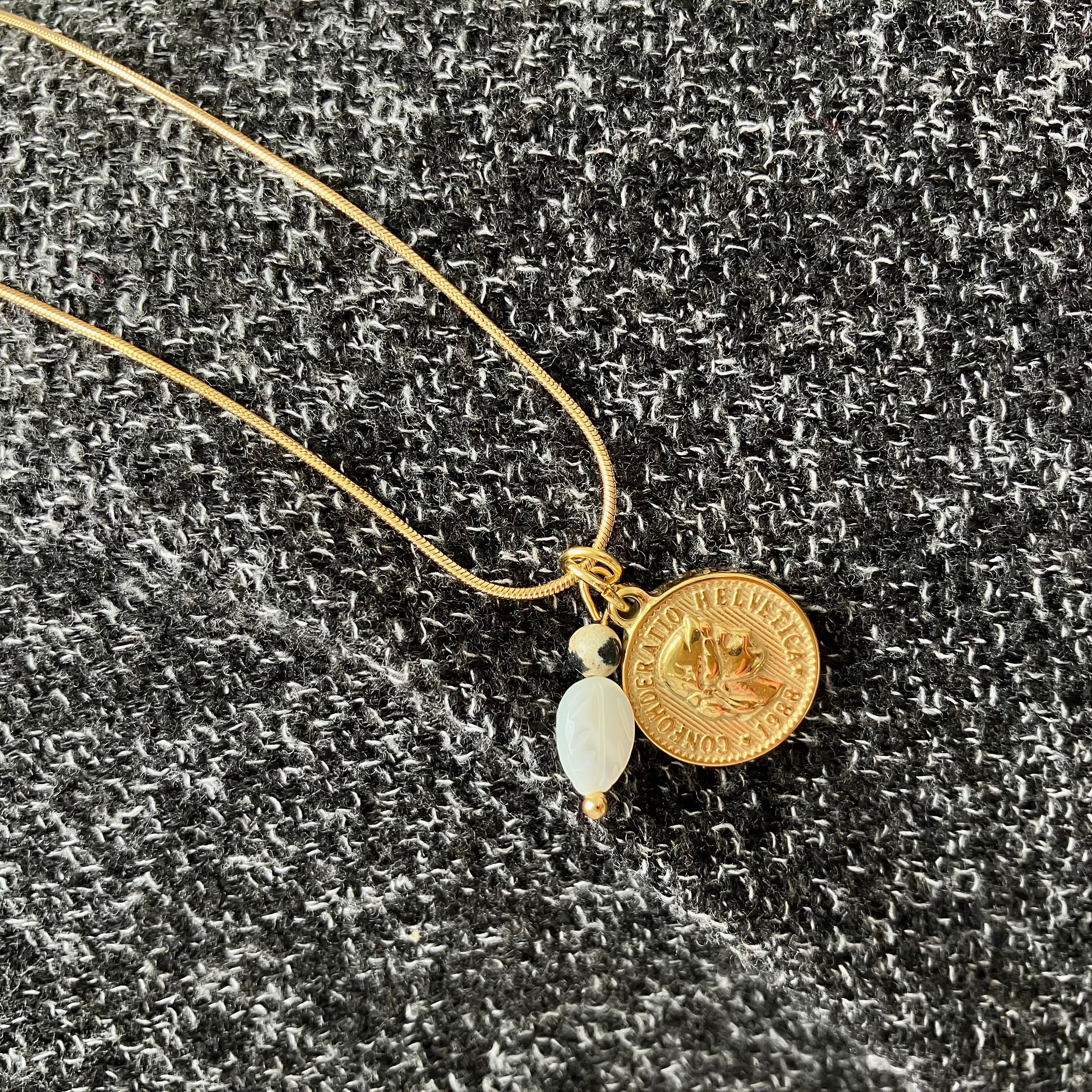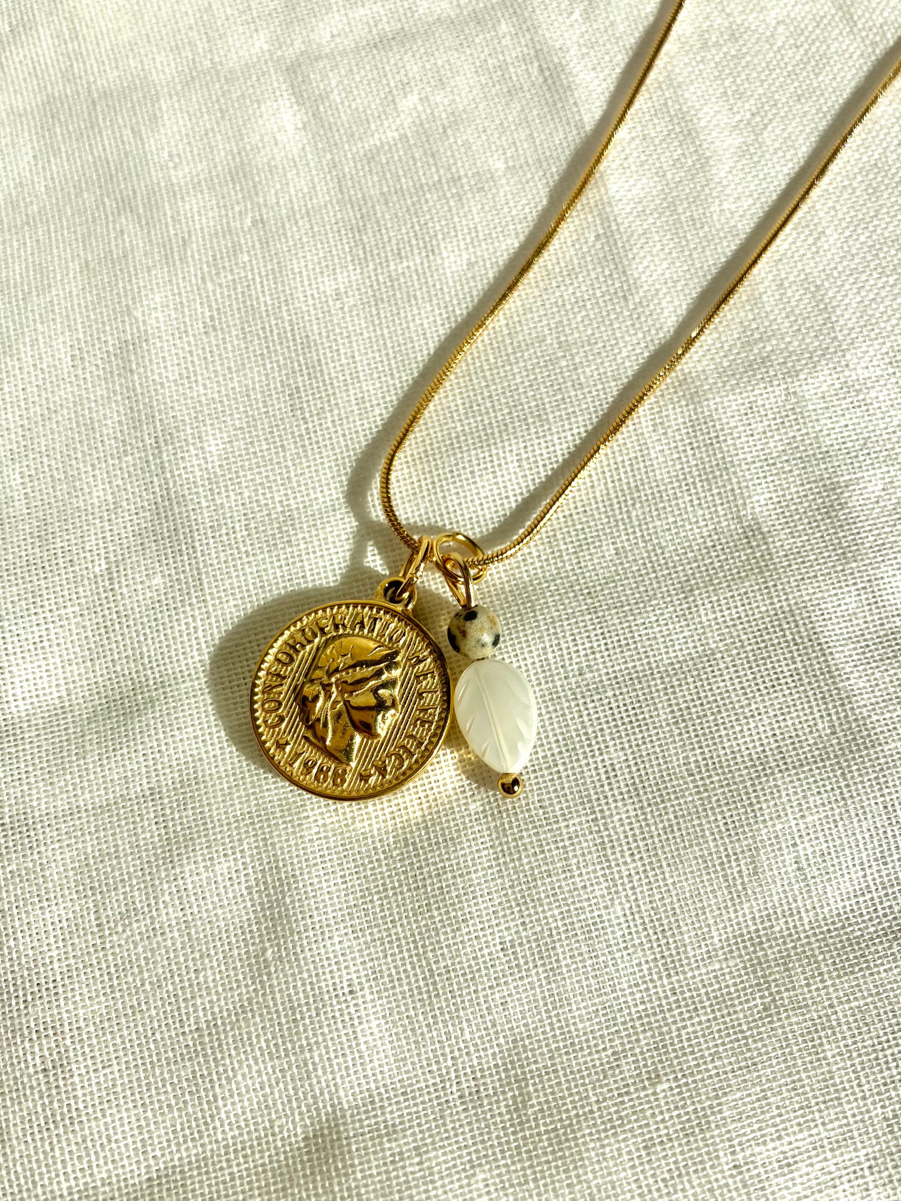 絡まらないネックレス リーフマザーオブパールと天然石のお守りゴールドコインネックレス 金属アレルギー対応 ダルメシアン モノトーン アンティーク 癒し おしゃれ