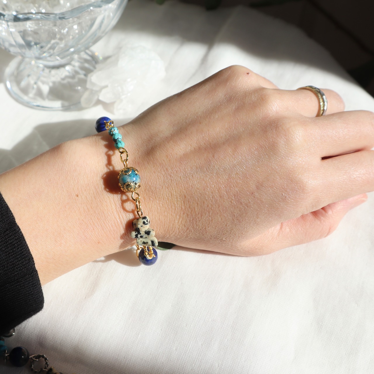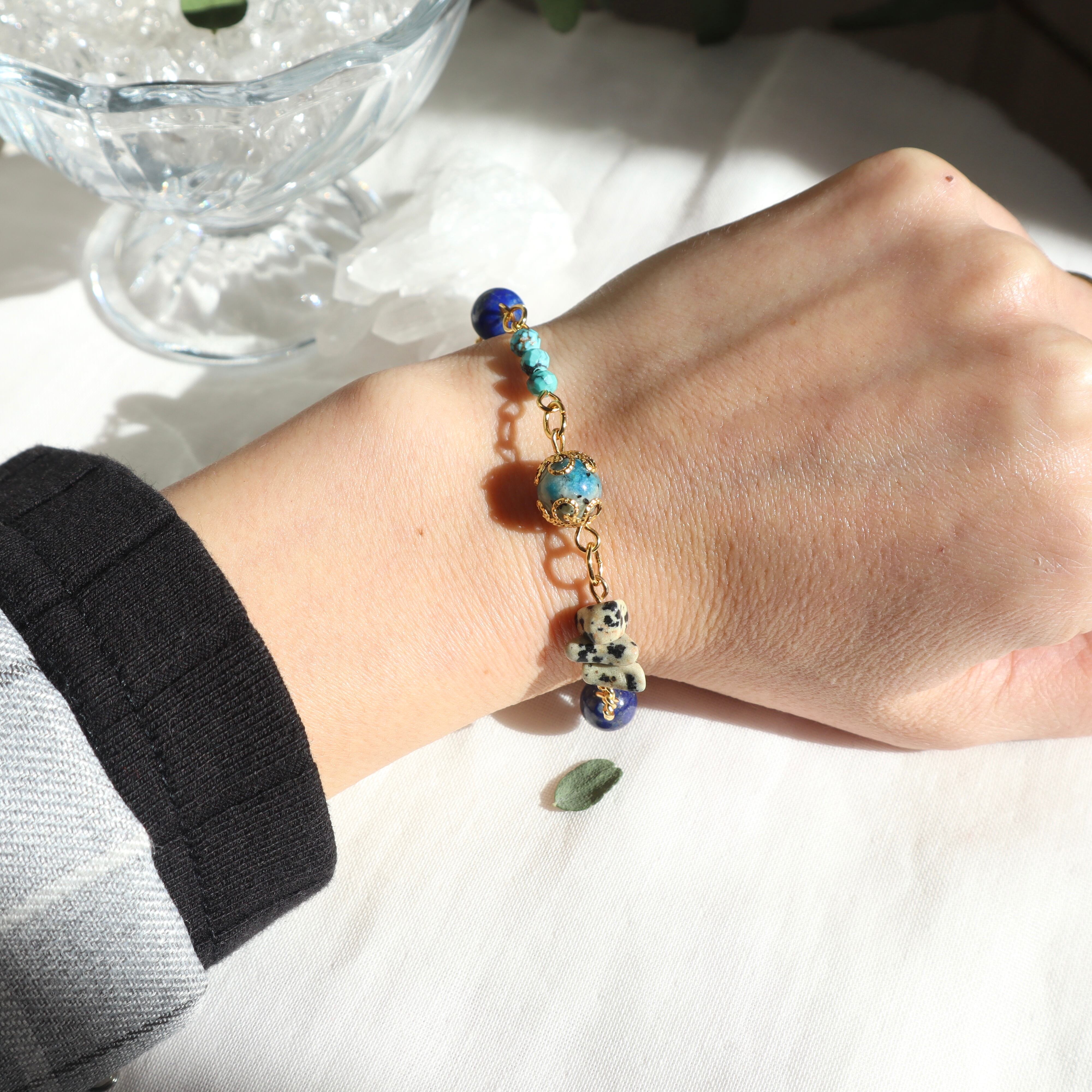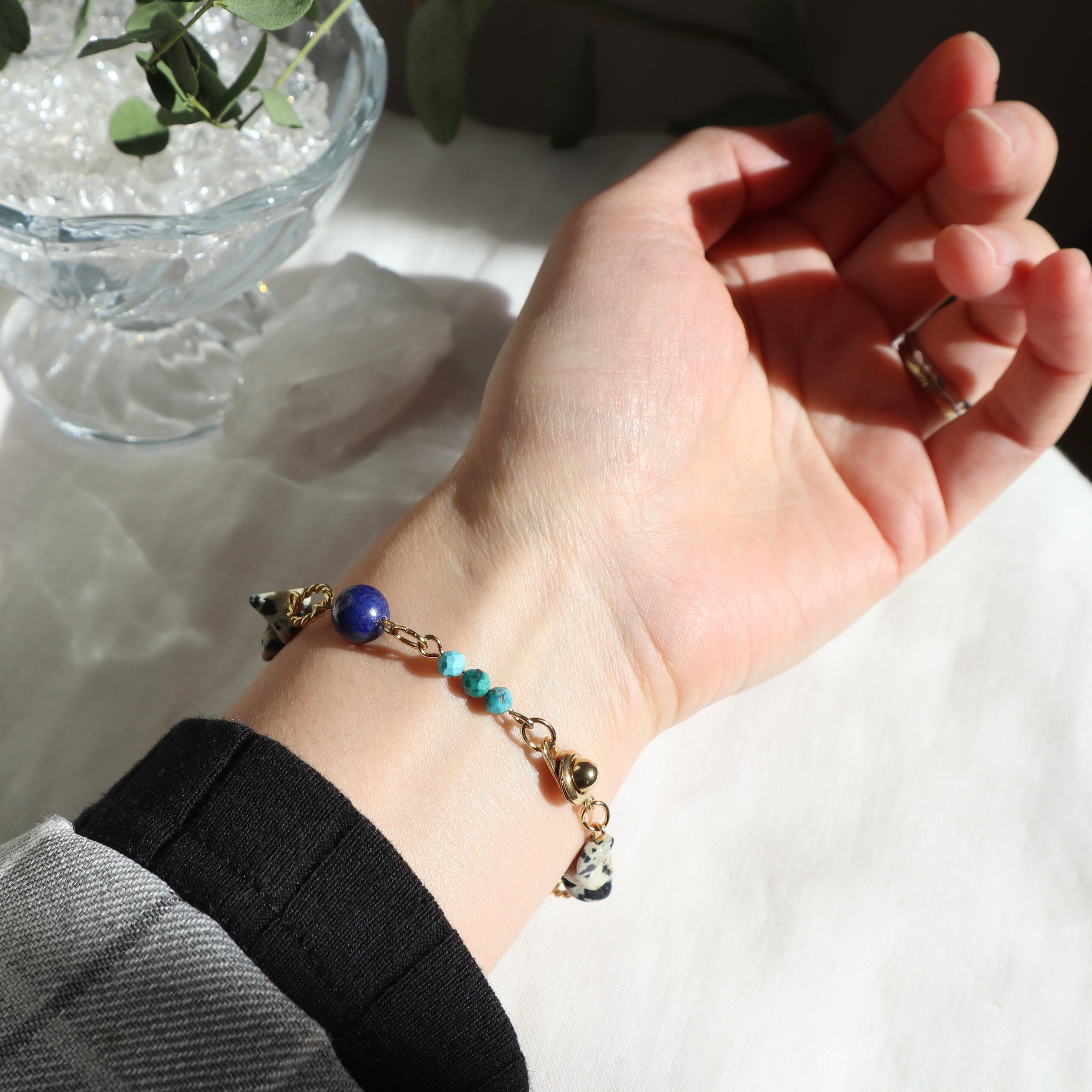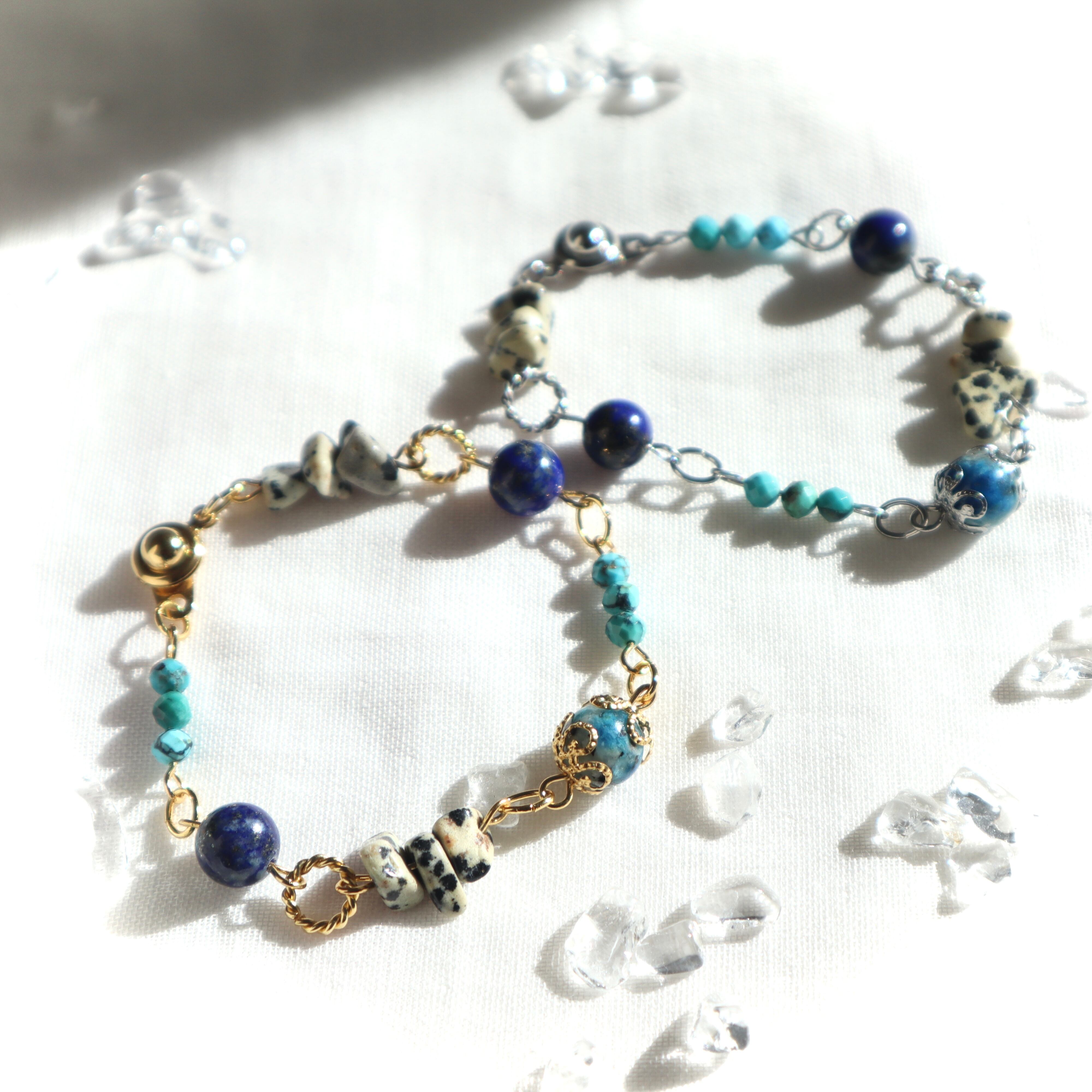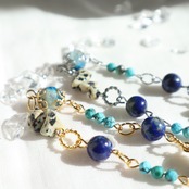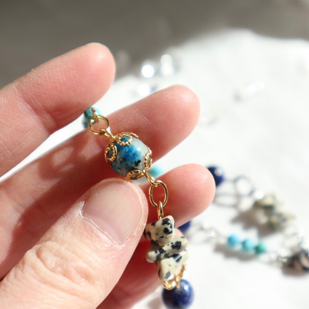 気品と大地のエネルギーを感じる美しいブルーの天然石と、鉱物感のある個性的な天然石を合わせました。