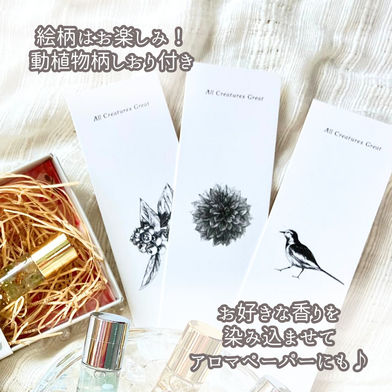 (エッセンシャルオイルを垂らして香るしおりとしてもご活用いただけます!)