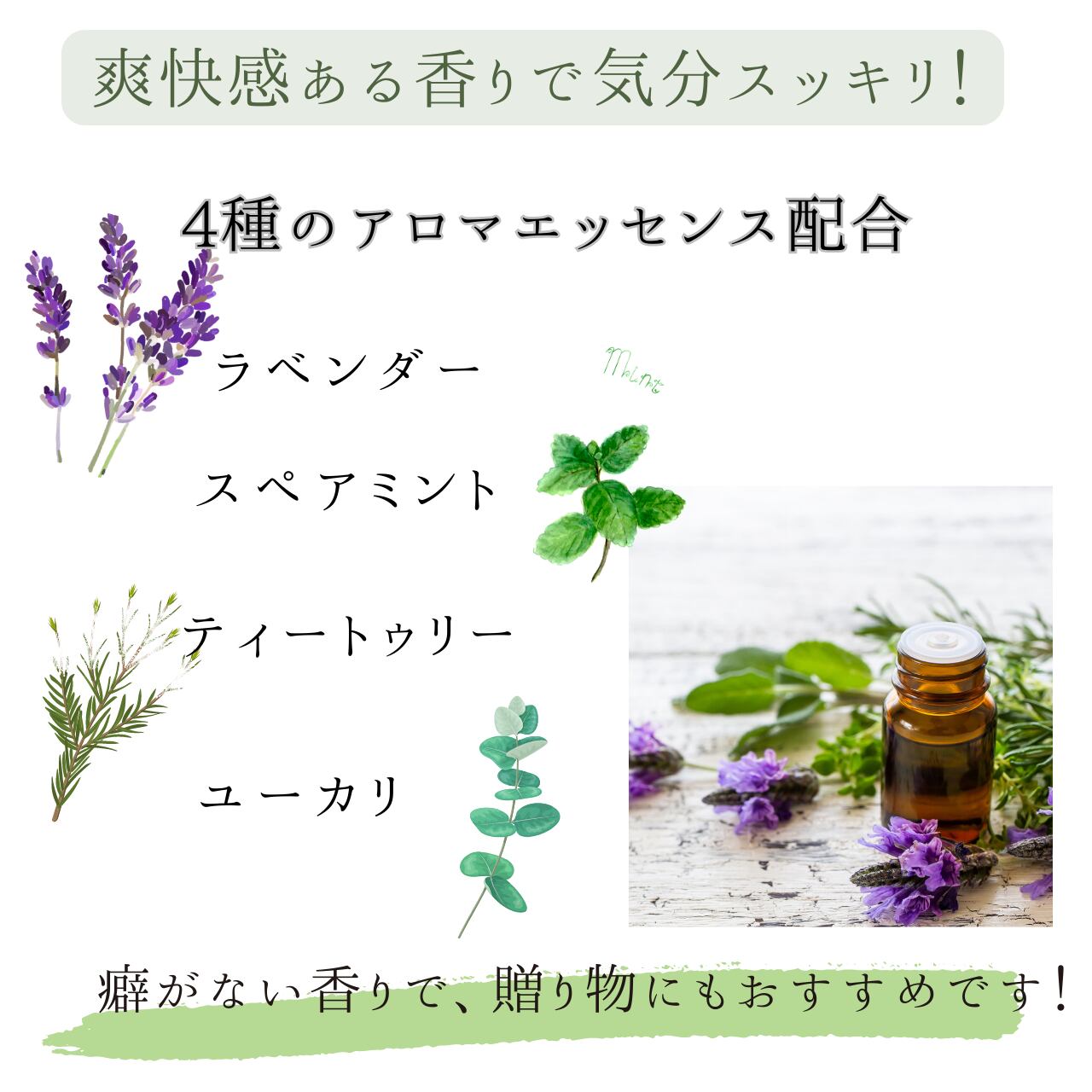 4種類のアロマオイルをブレンドした爽やかですっきりとした香りです。