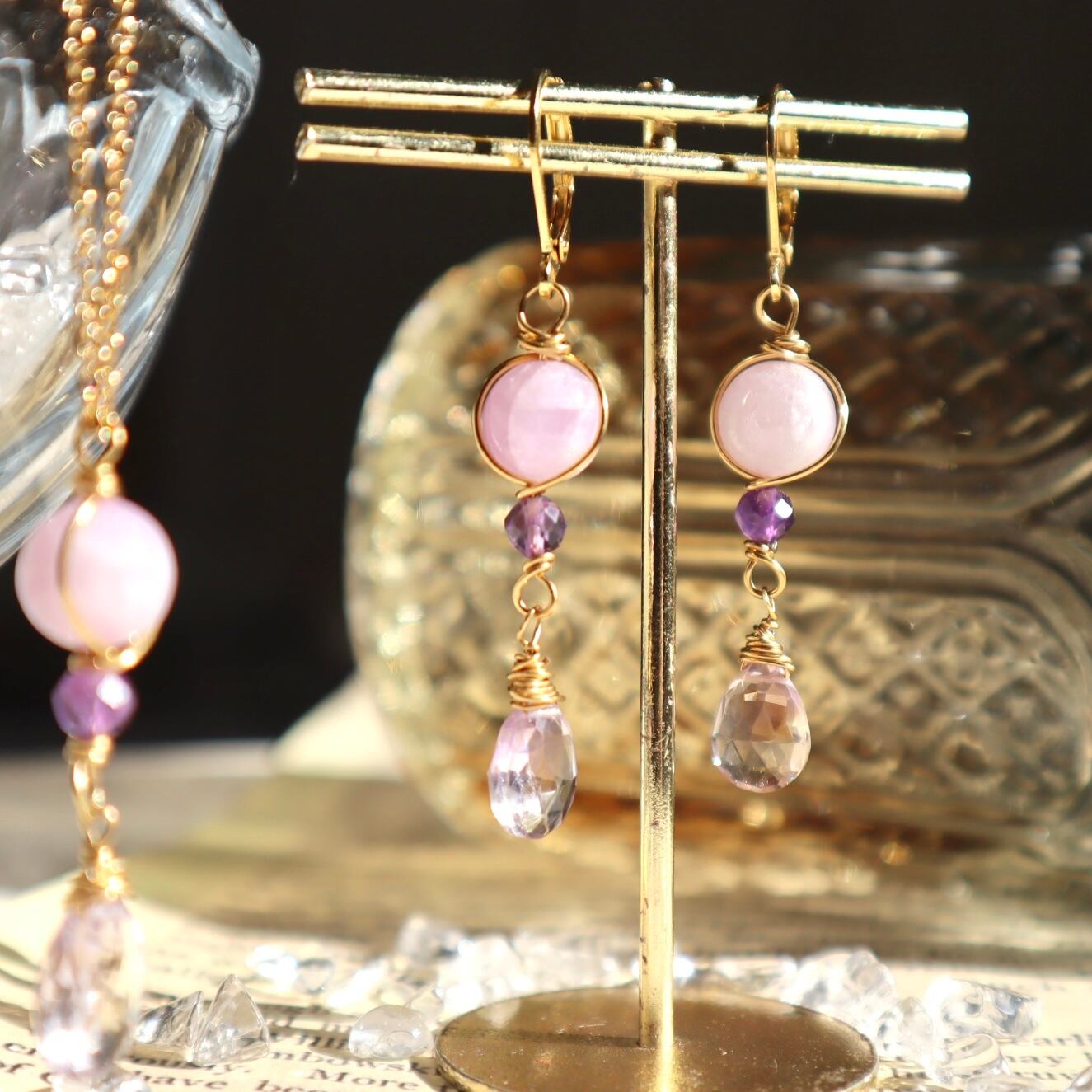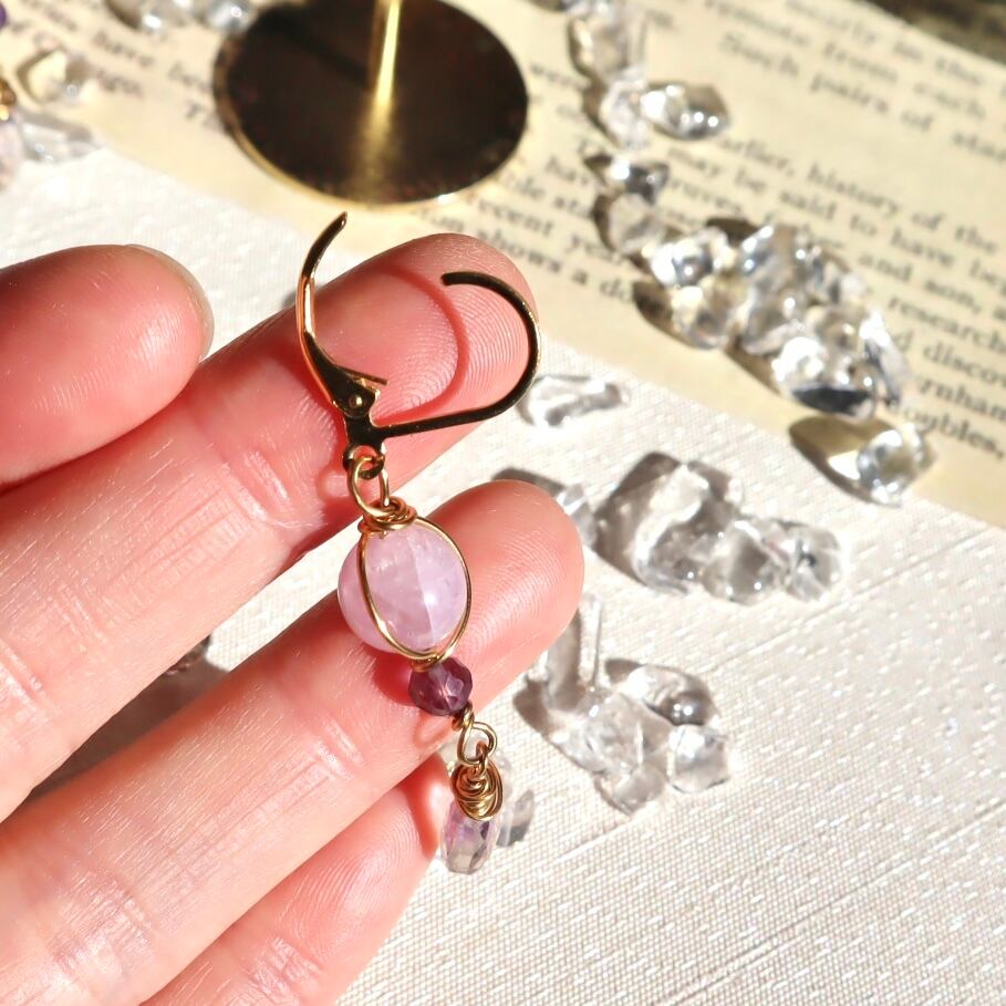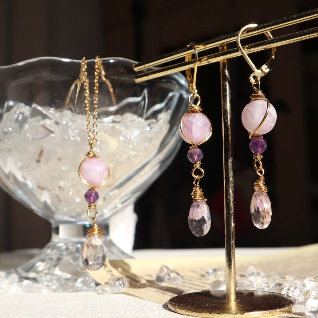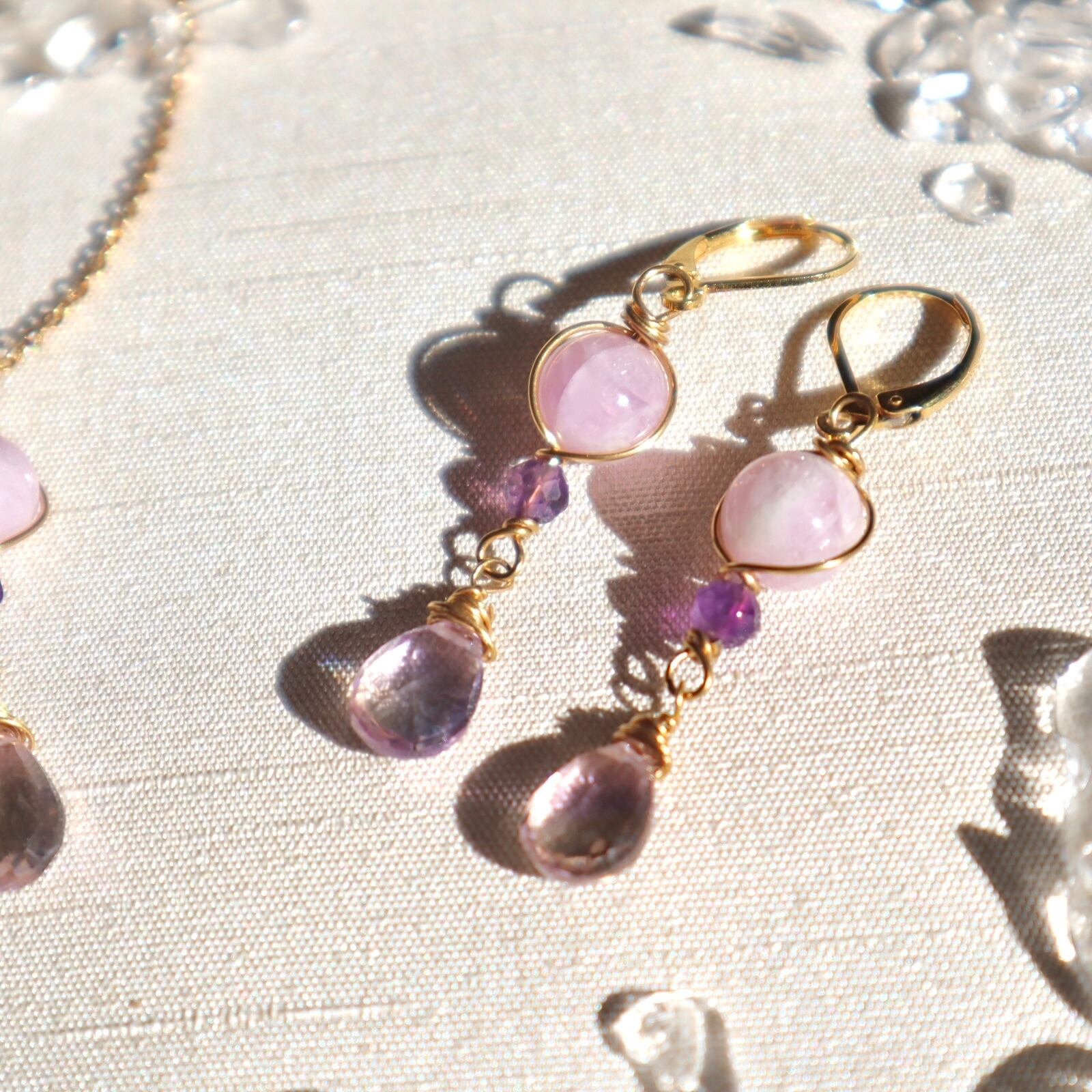 自己肯定と愛のお守りイヤリング/ピアス+ネックレスのセット アメトリン アメジスト クンツァイト 2月誕生石 9月誕生石 誕生日 ギフト