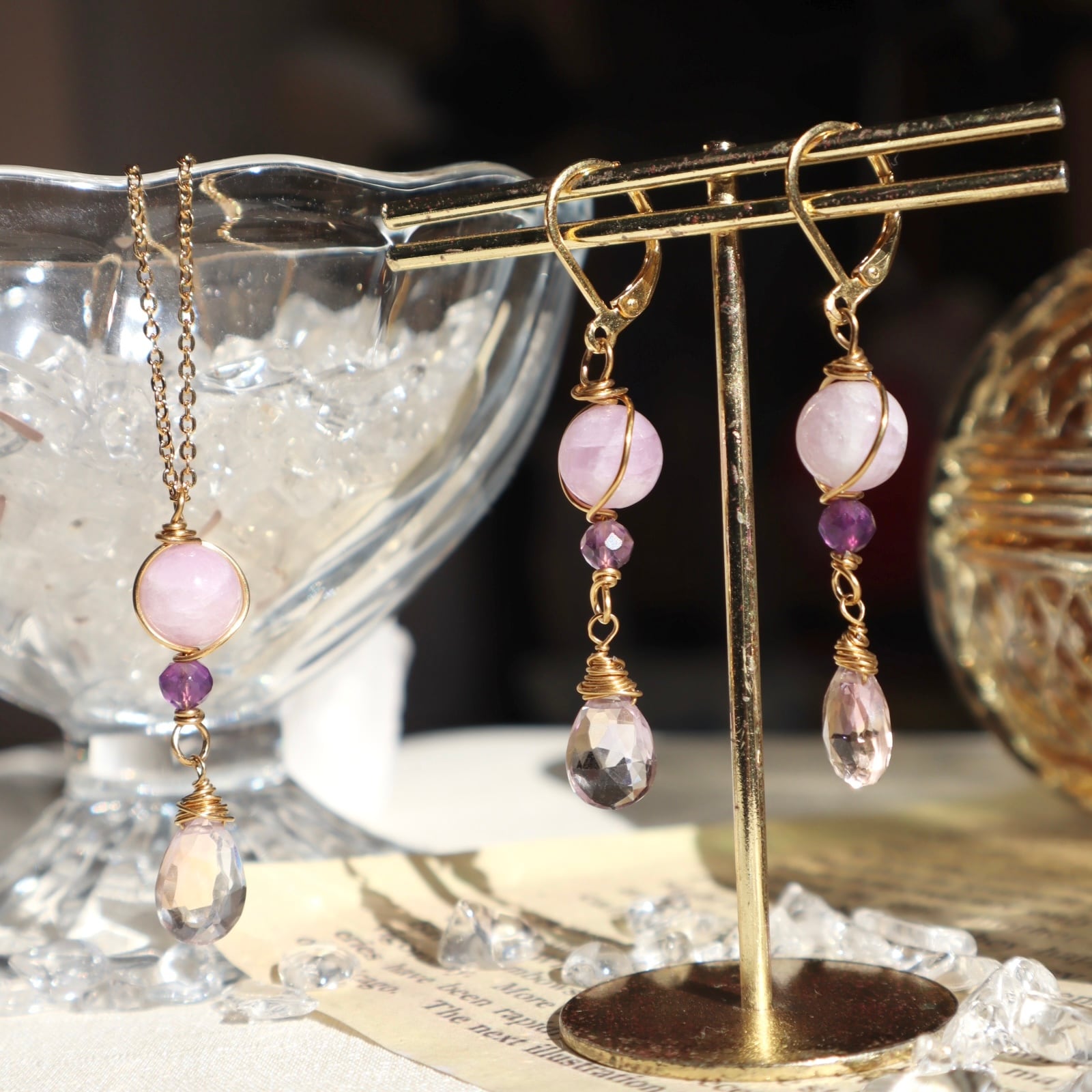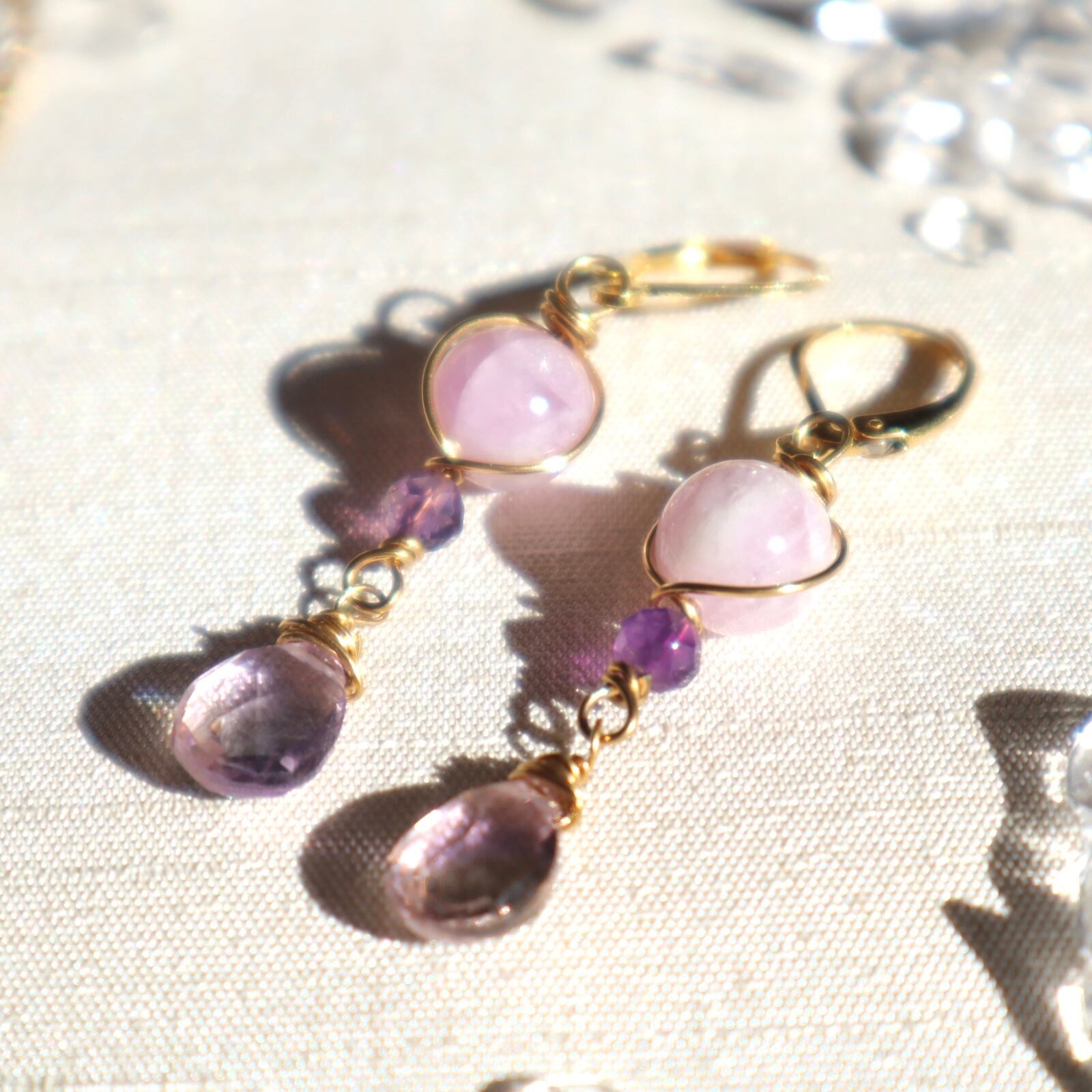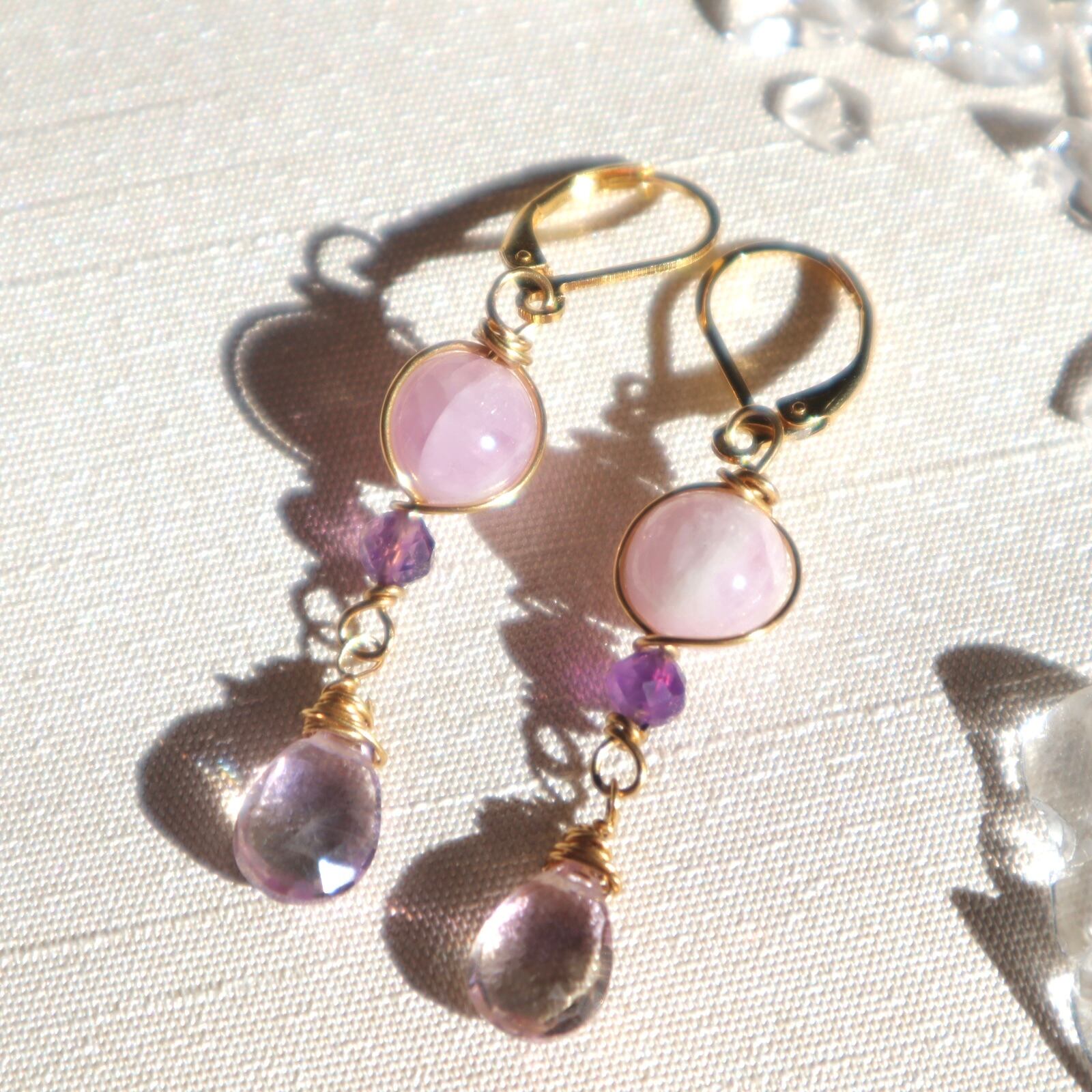 自己肯定と愛のお守りイヤリング/ピアス+ネックレスのセット アメトリン アメジスト クンツァイト 2月誕生石 9月誕生石 誕生日 ギフト