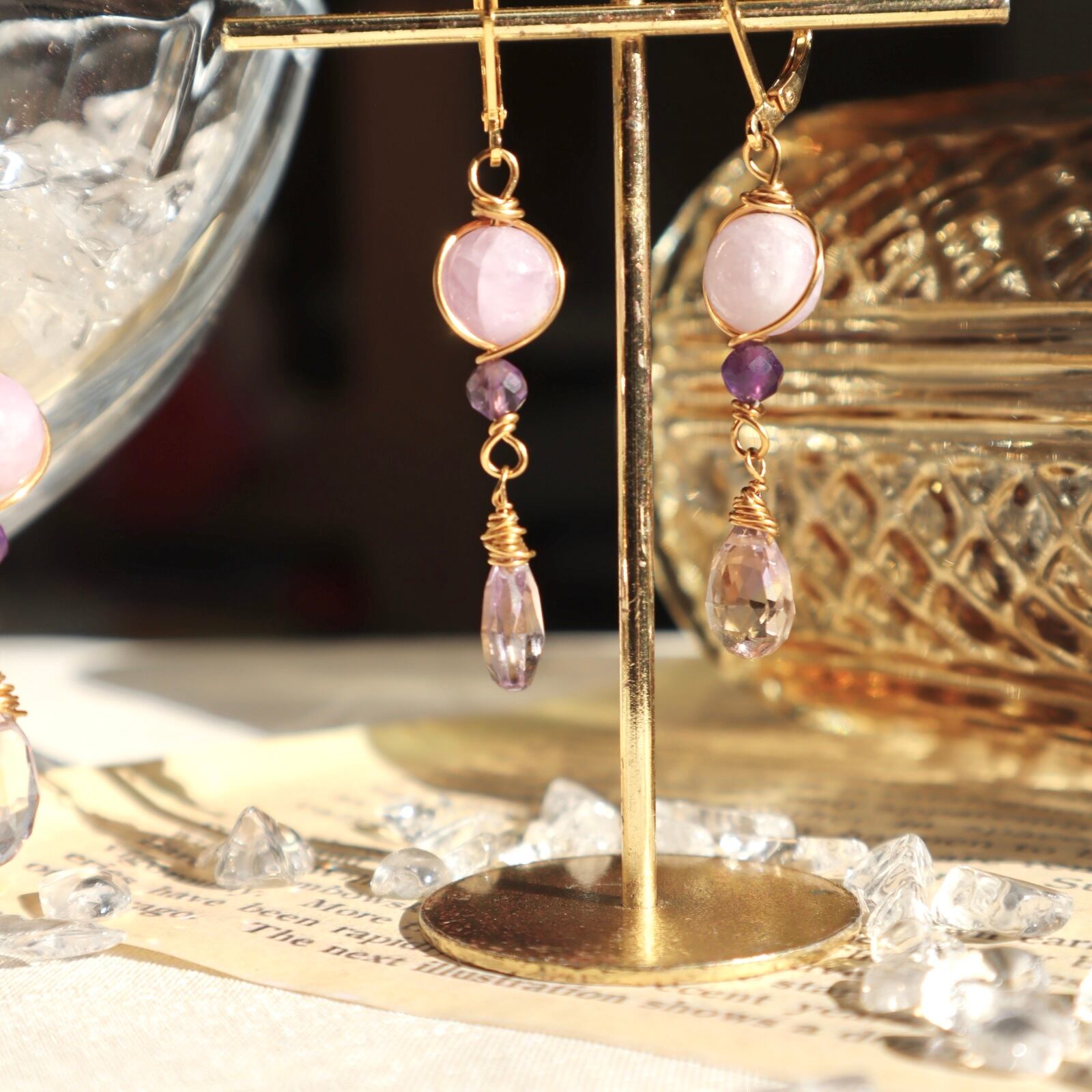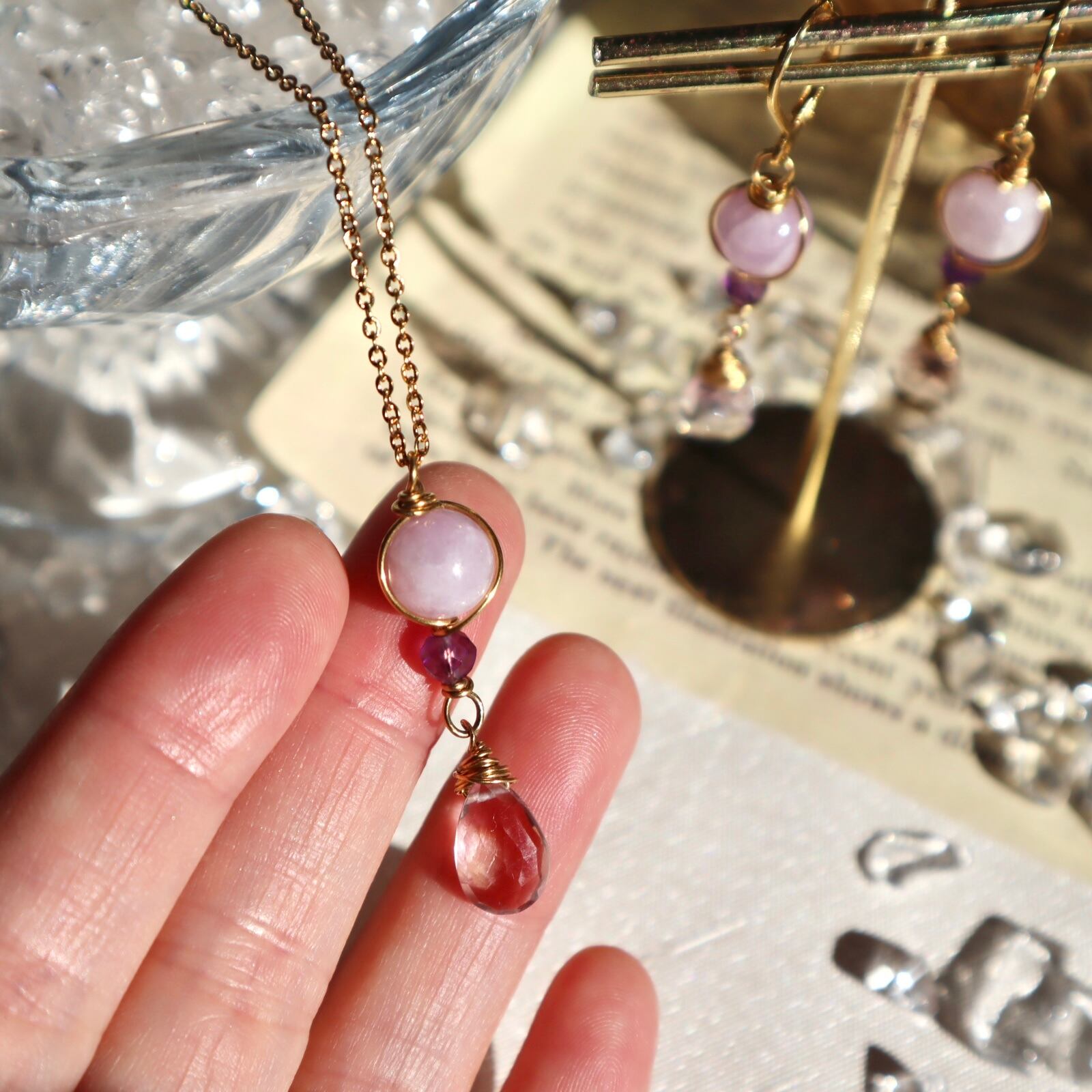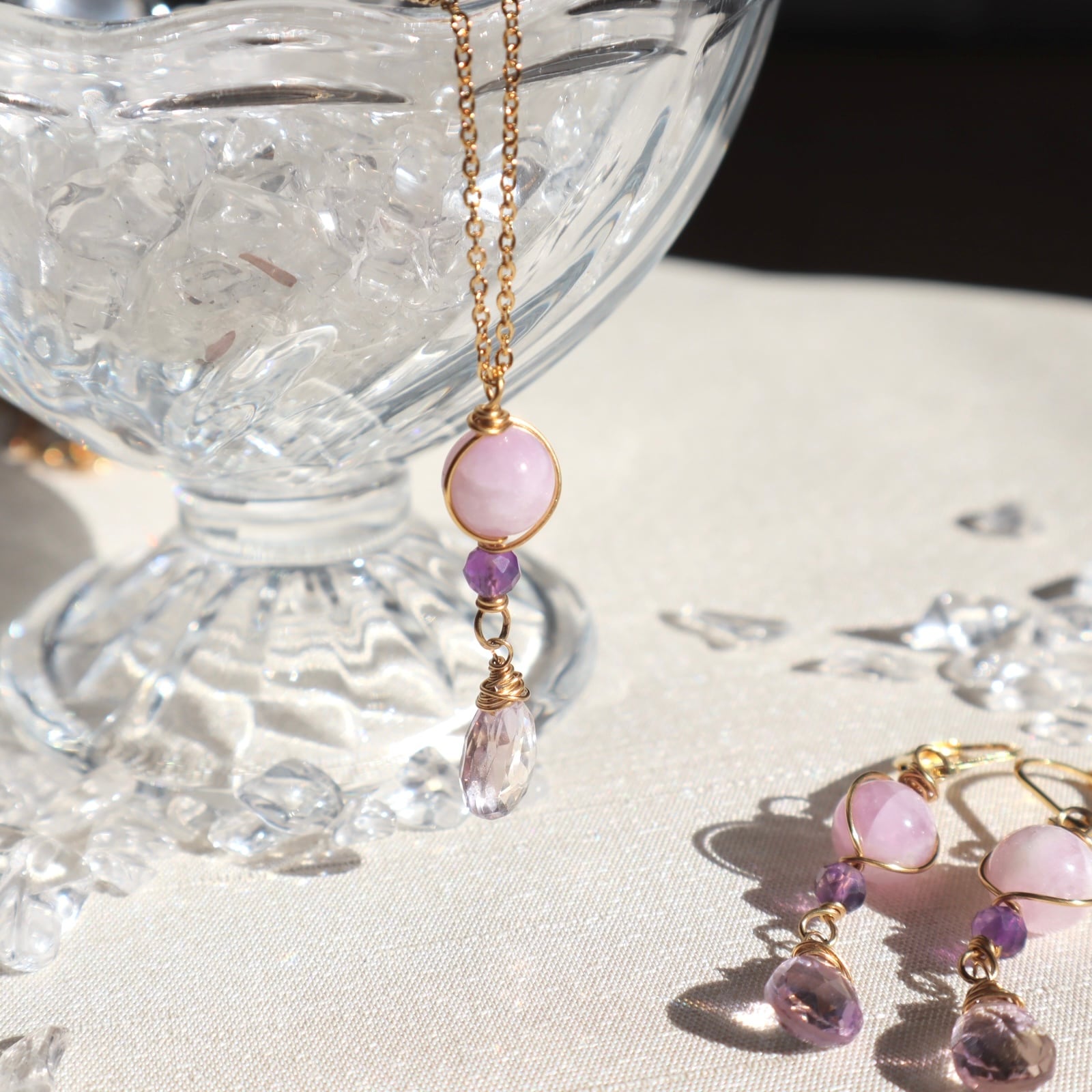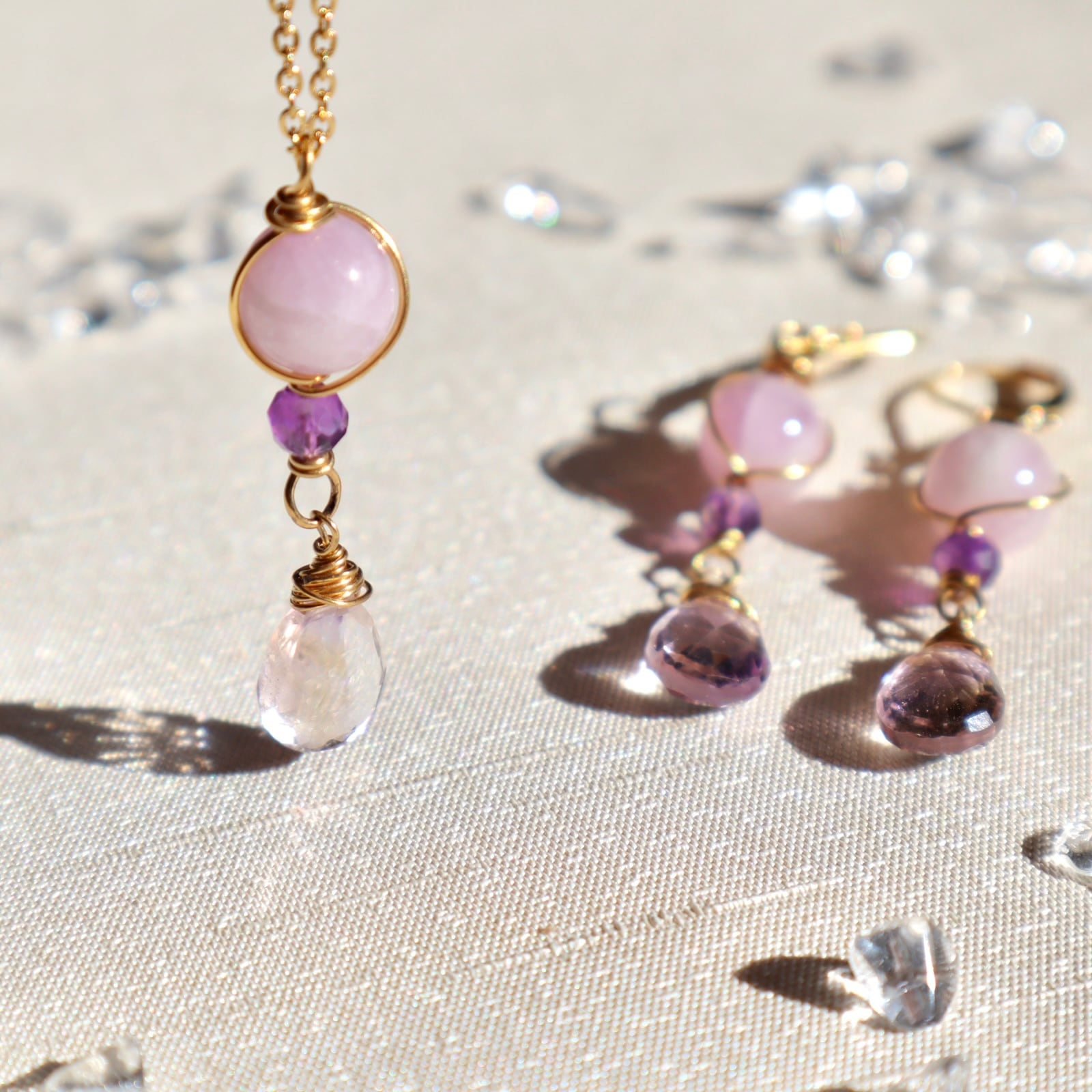 自己肯定と愛のお守りイヤリング/ピアス+ネックレスのセット アメトリン アメジスト クンツァイト 2月誕生石 9月誕生石 誕生日 ギフト